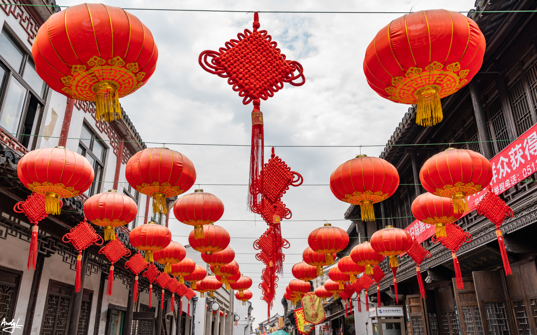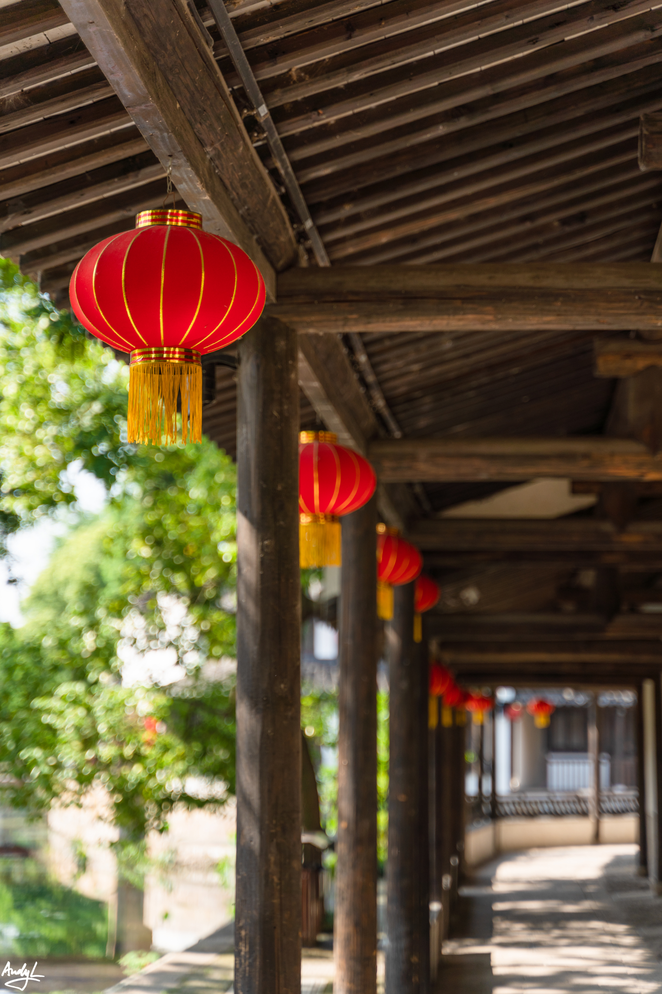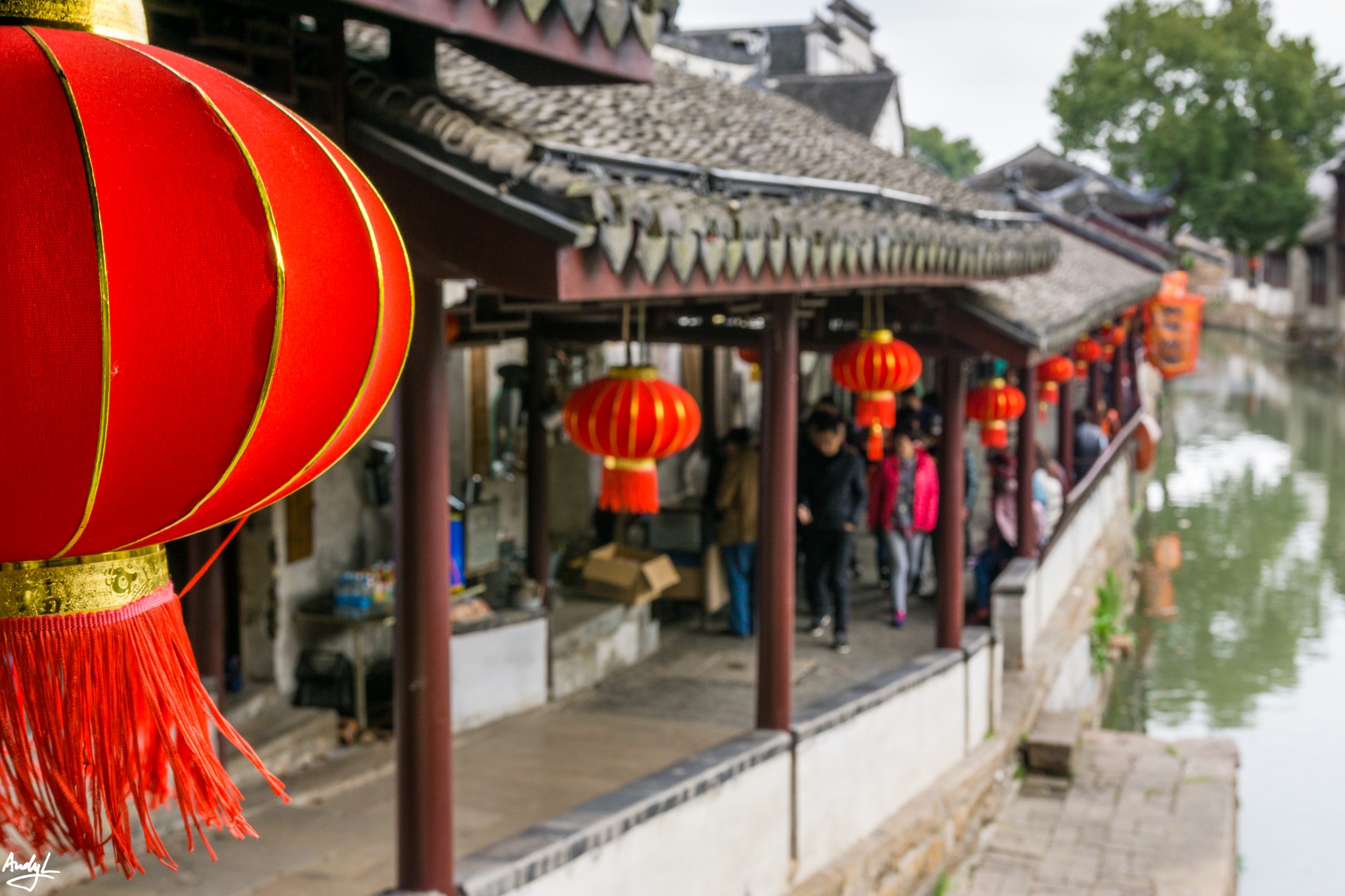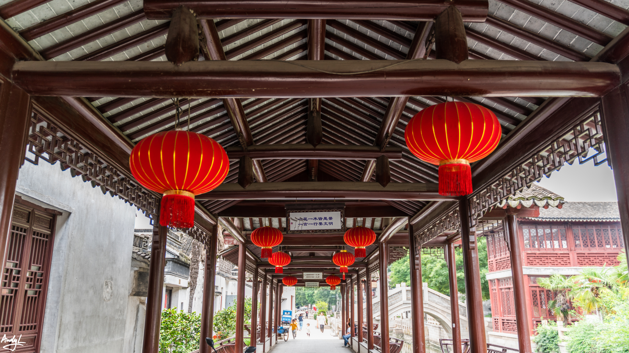 沿河的风雨长廊算是景区里人最多的地方了,河边目光所及之处,到处都能看到大红灯笼。