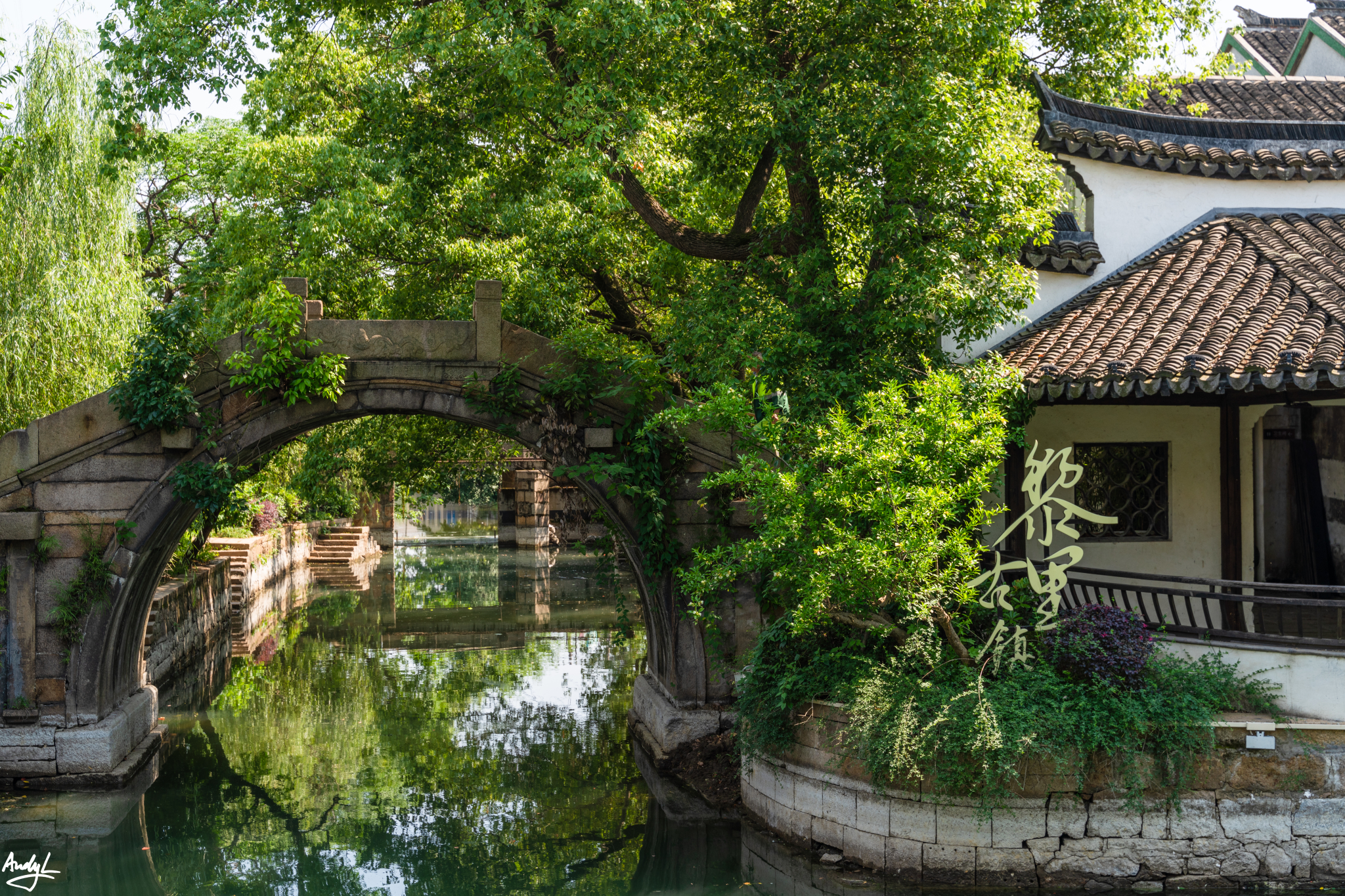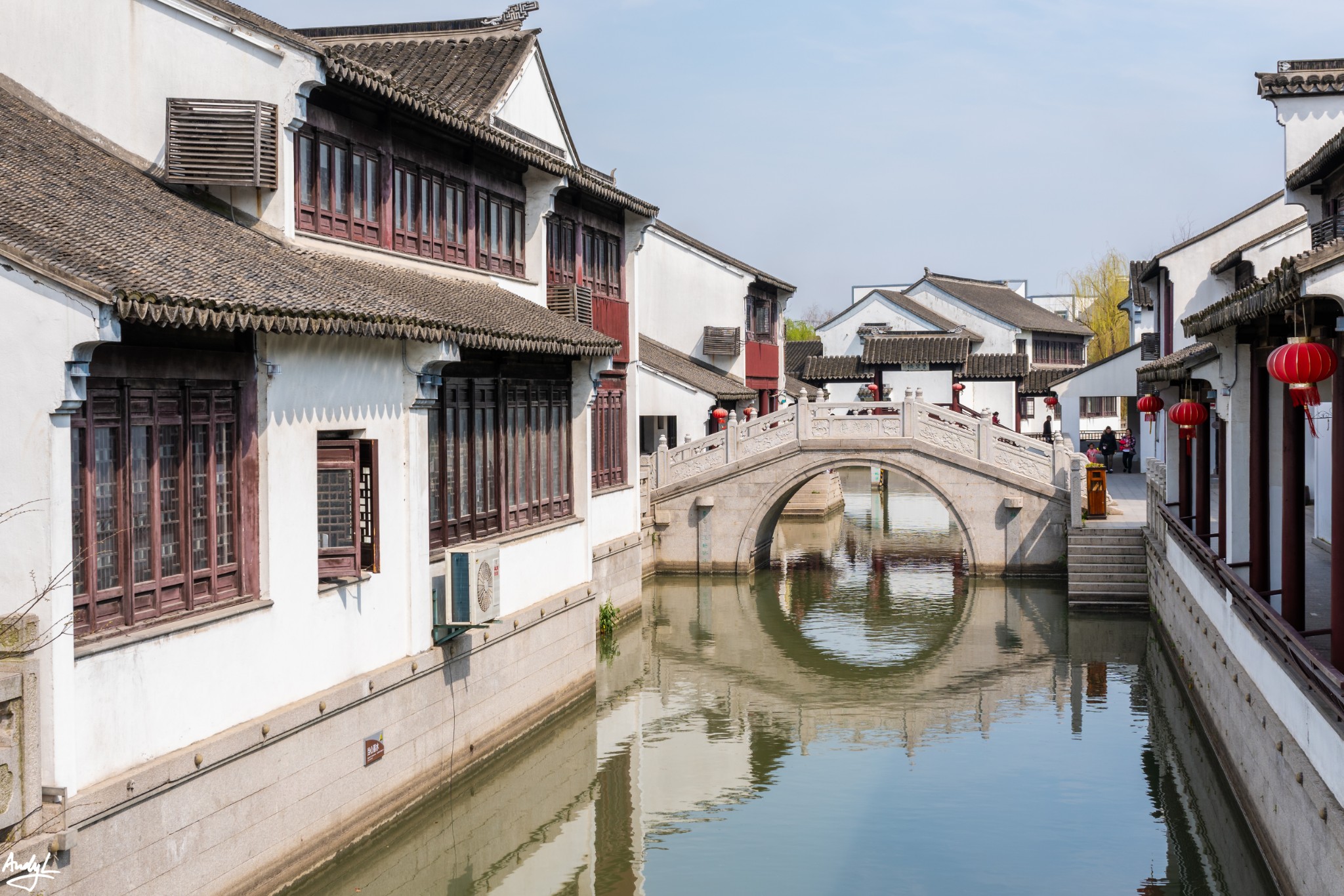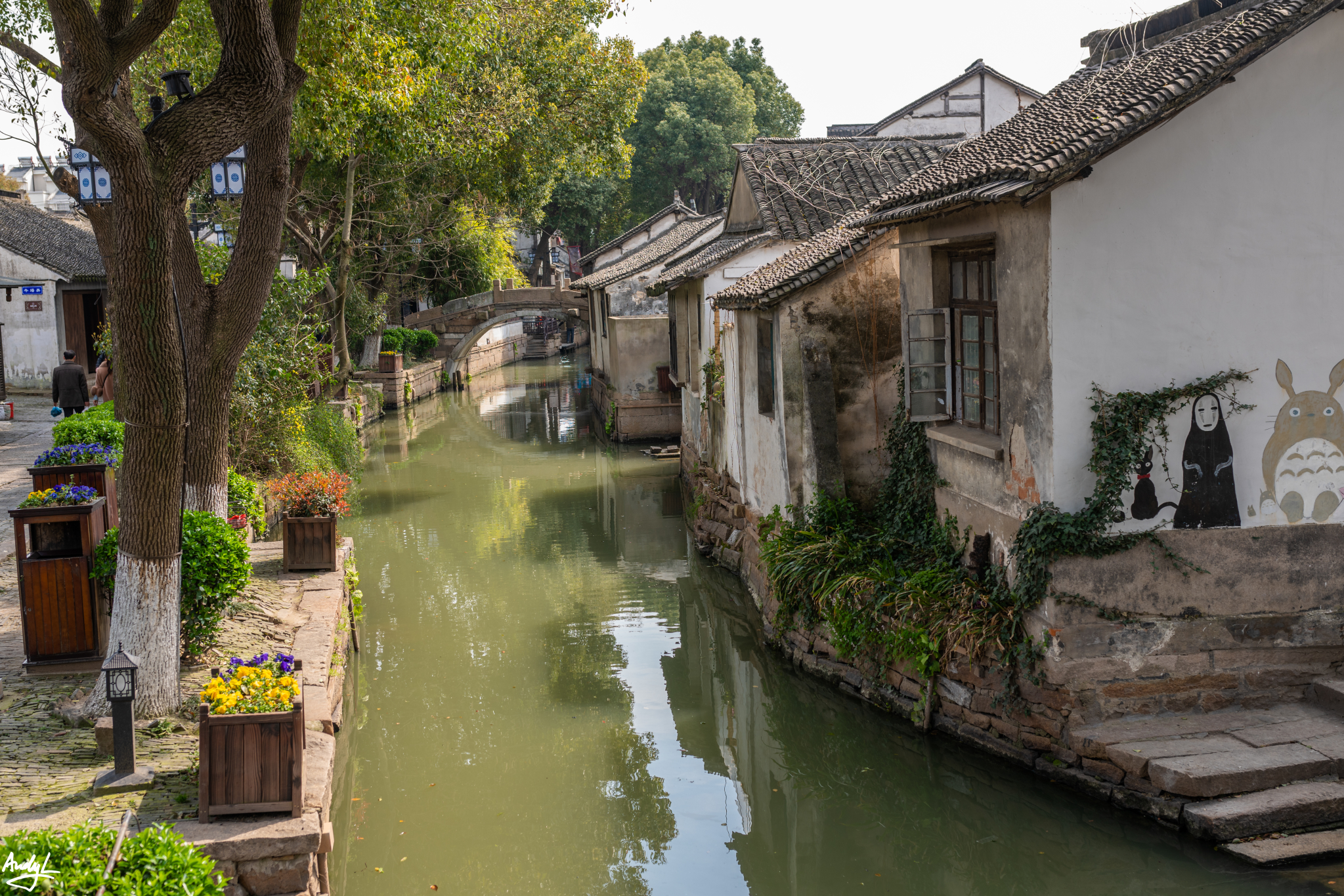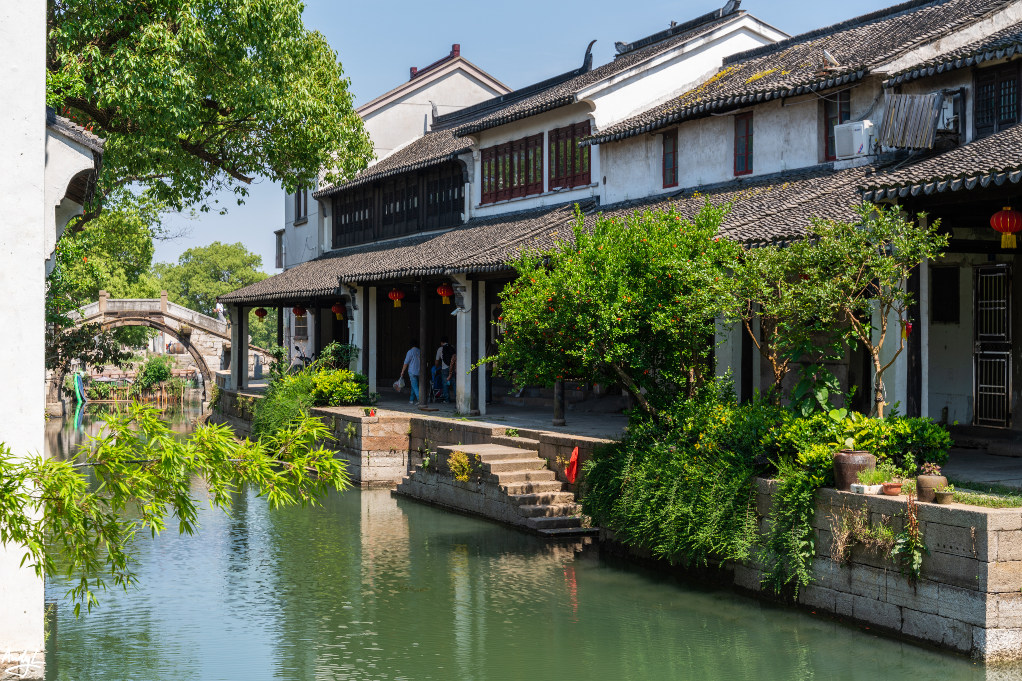文化园中,有重新修建的江南民居,小桥流水。