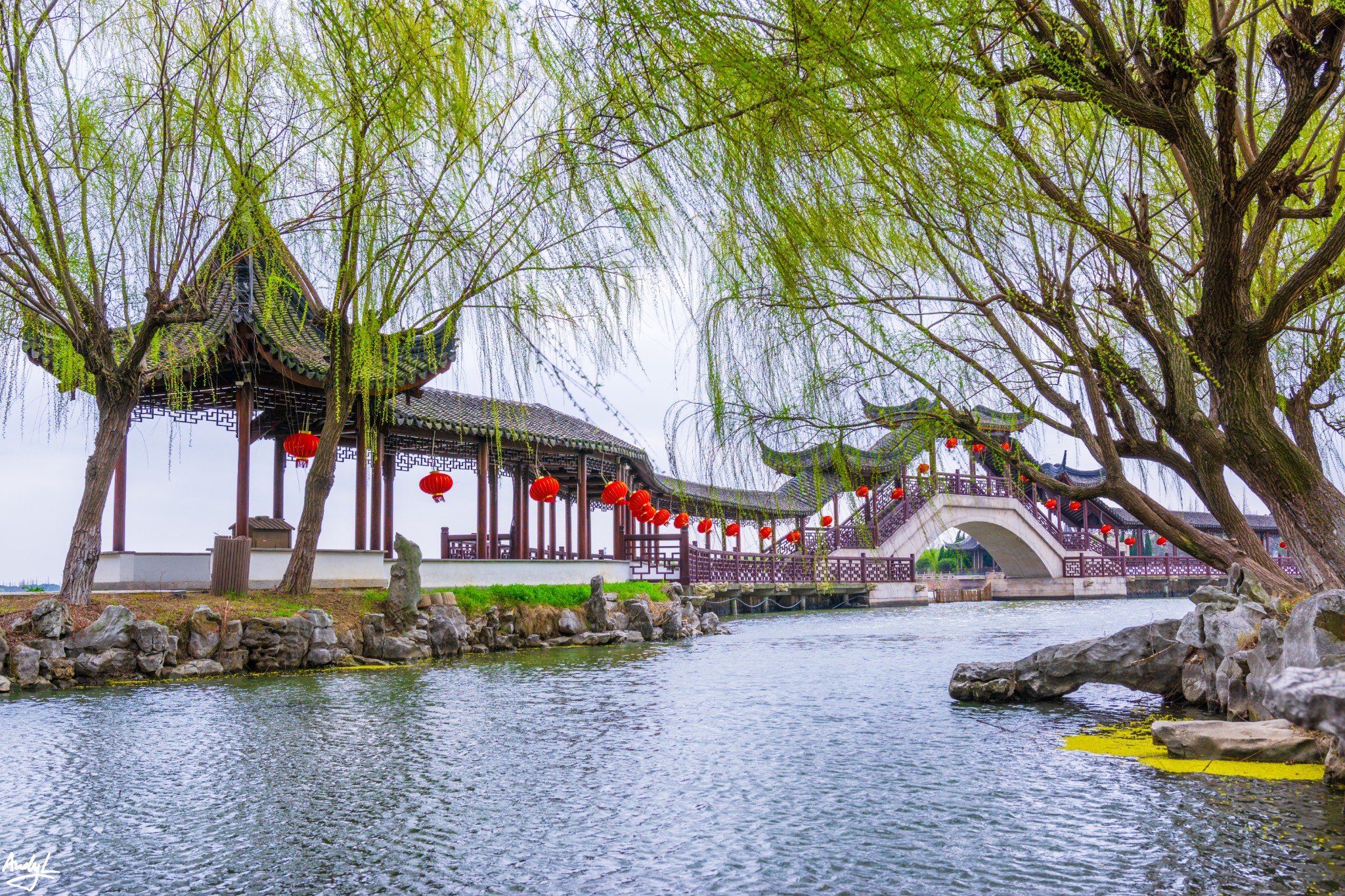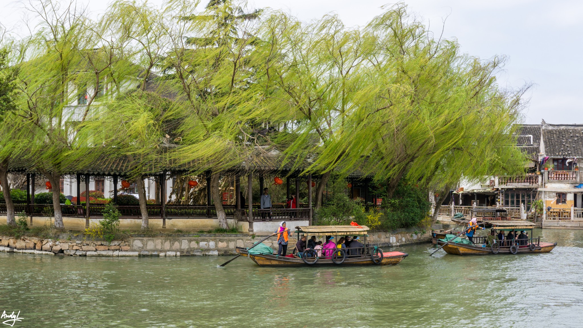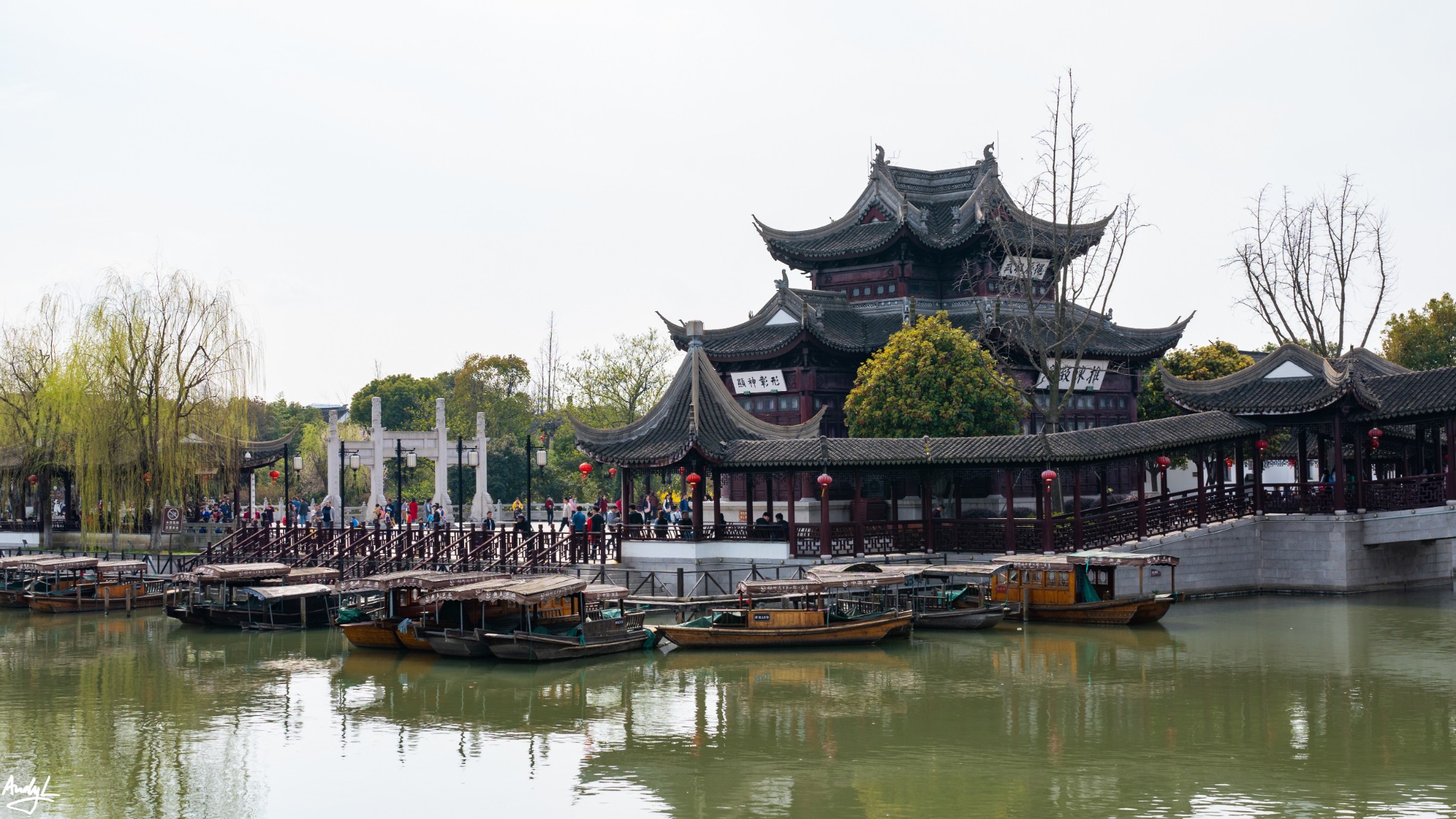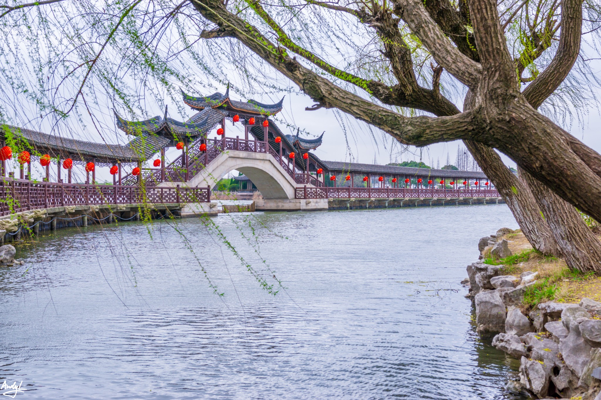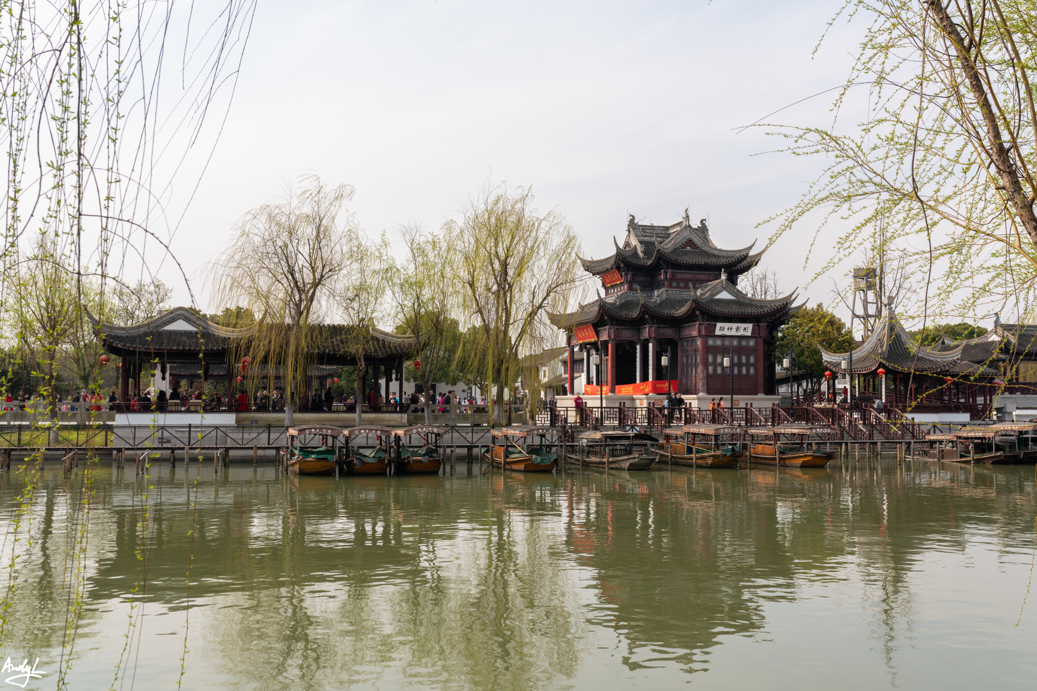 这座长廊,可以说是锦溪古镇的颜值担当,少了这座长廊,也许这里就只是另一个普通的江南小镇。虽然初春季节古莲池里没有莲花,但是在柳树新芽的衬托下,长廊依旧美丽。现在景区的Logo上,这座长廊就占据了最显眼的位置。