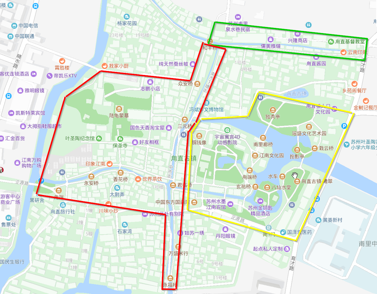 甪直古镇景区大致可以分为三个部分:红色区域分布着古镇内主要的老建筑和老街道,黄色区域是江南文化园,绿色区域是古镇景区二期。