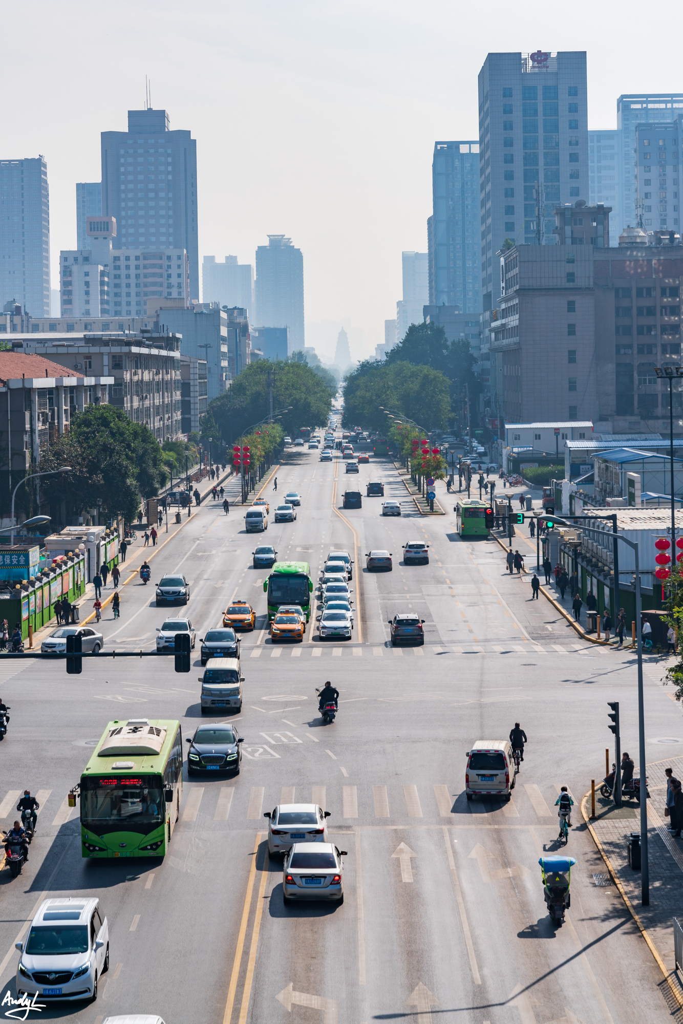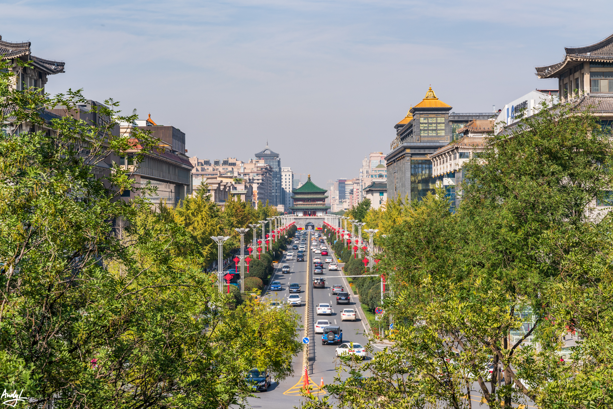 现在的西安老城区,基本保留了明清时期的道路布局,而明清的西安则是以隋唐的长安城为蓝本重建的,由于曾经做过国都,所以西安的道路都是横平竖直。在城墙上,看这样笔直的道路显得尤为明显,往往一眼就能看到一些地标建筑。