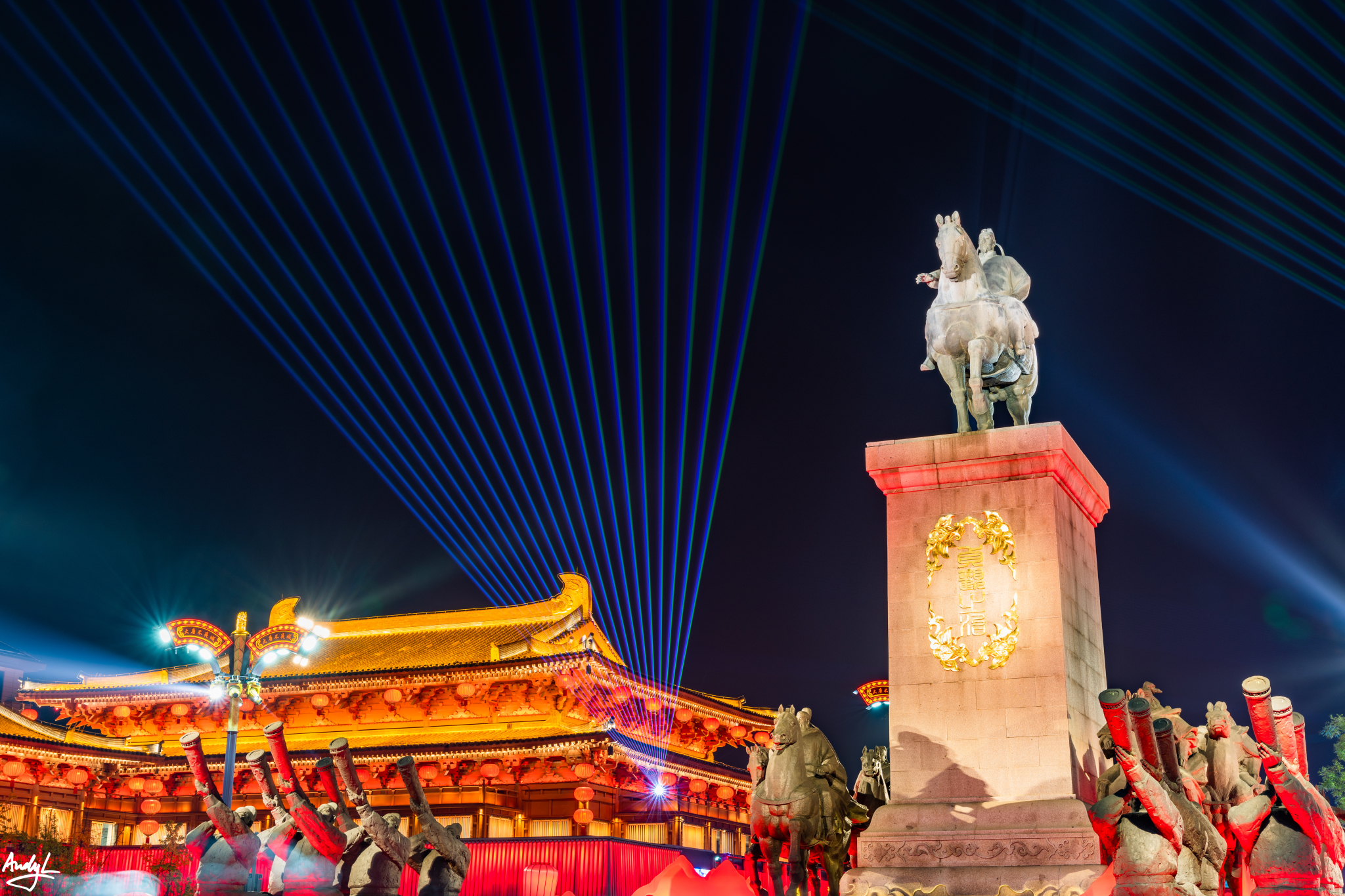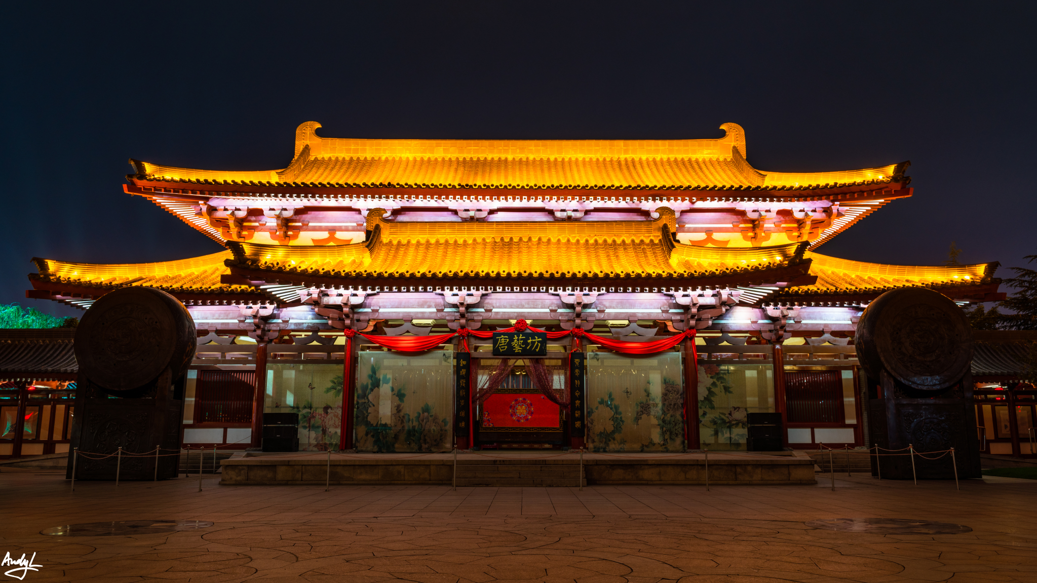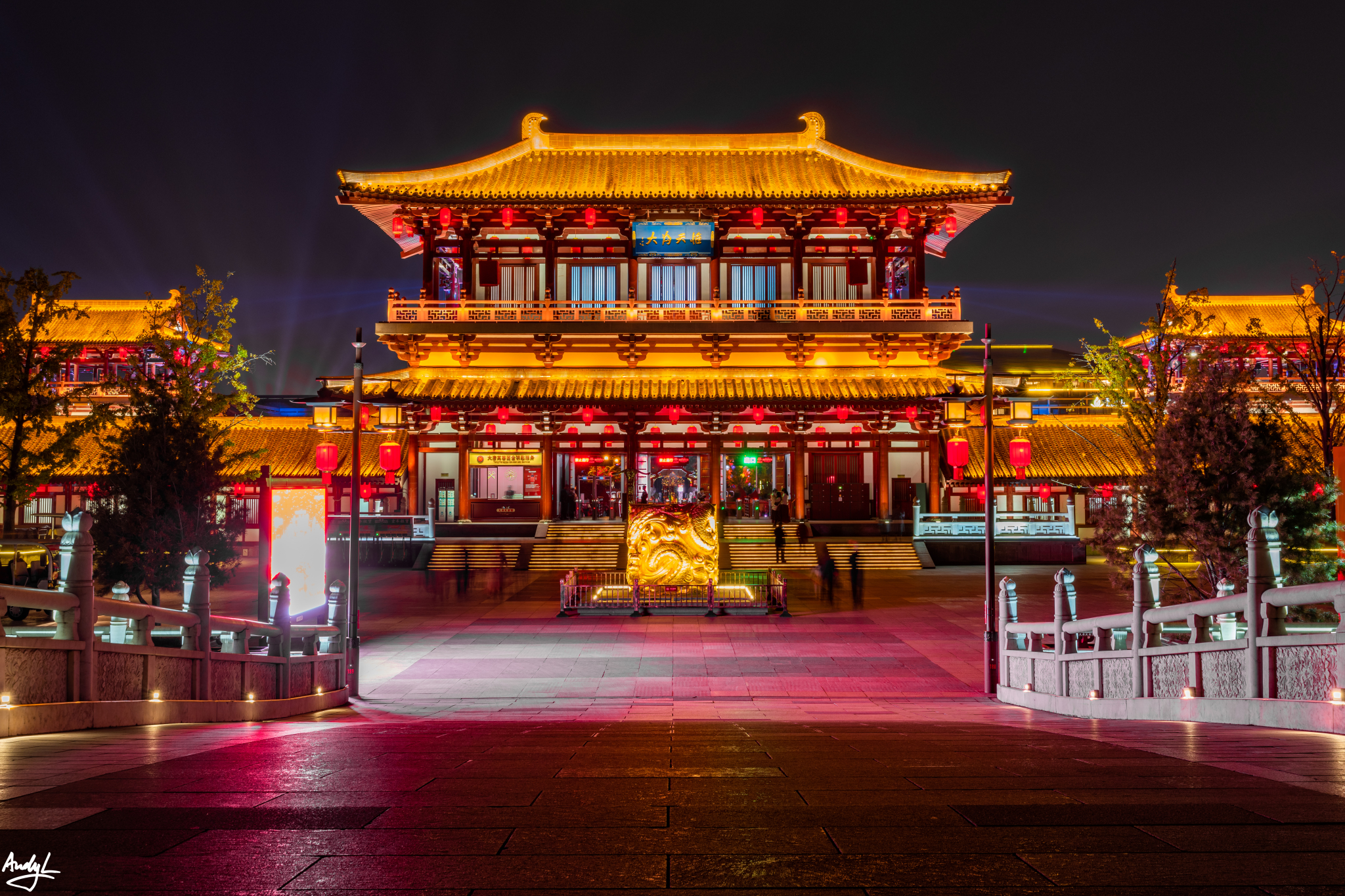 白天曾路过的大唐不夜城,到了晚上,绝对是另一番景象,宽阔的街道从大雁塔南广场中轴线延伸而出,街道两边都是雄伟的仿唐建筑群。晚上几乎每栋建筑都有射灯射出,非常夺人眼球。