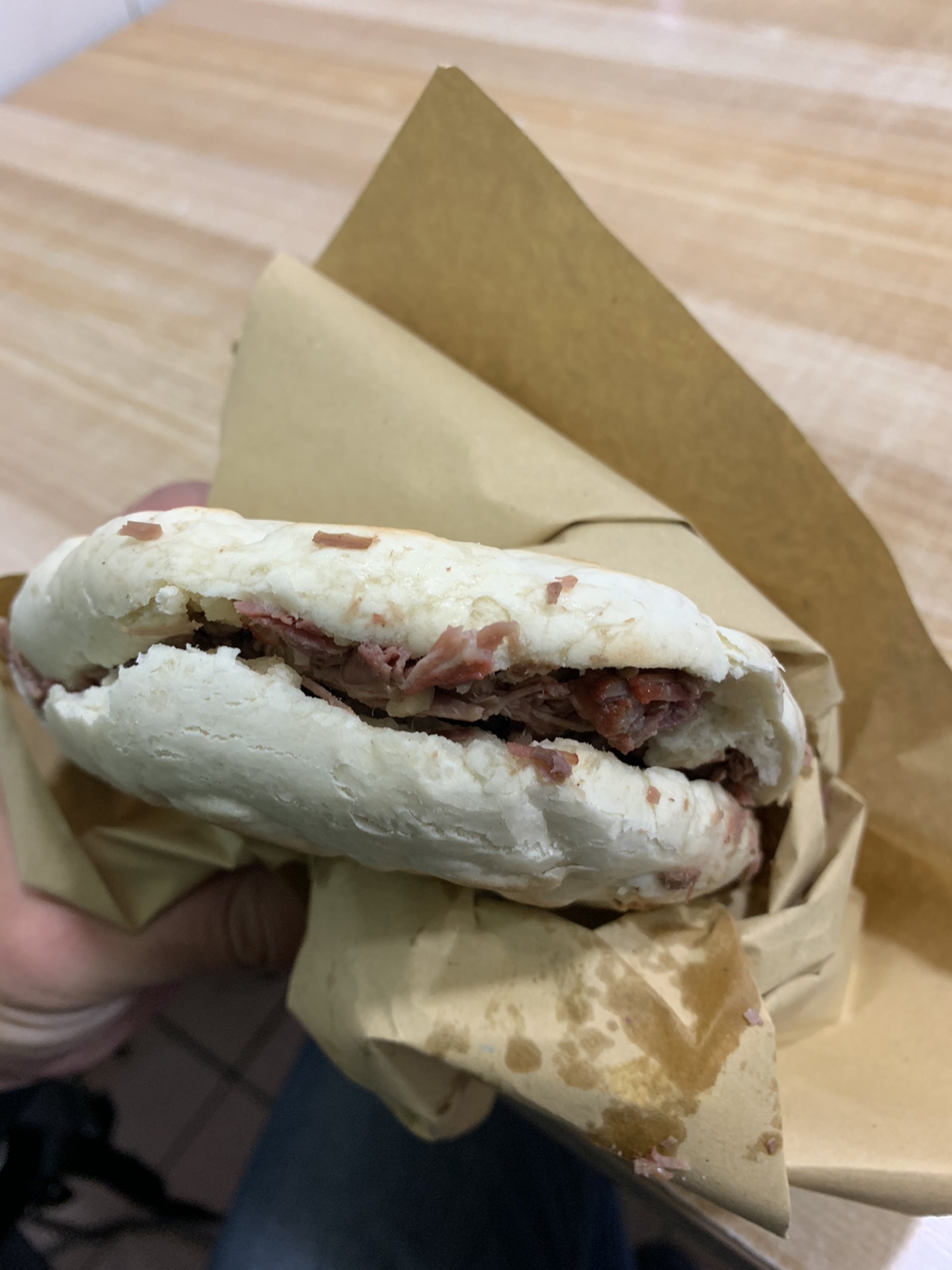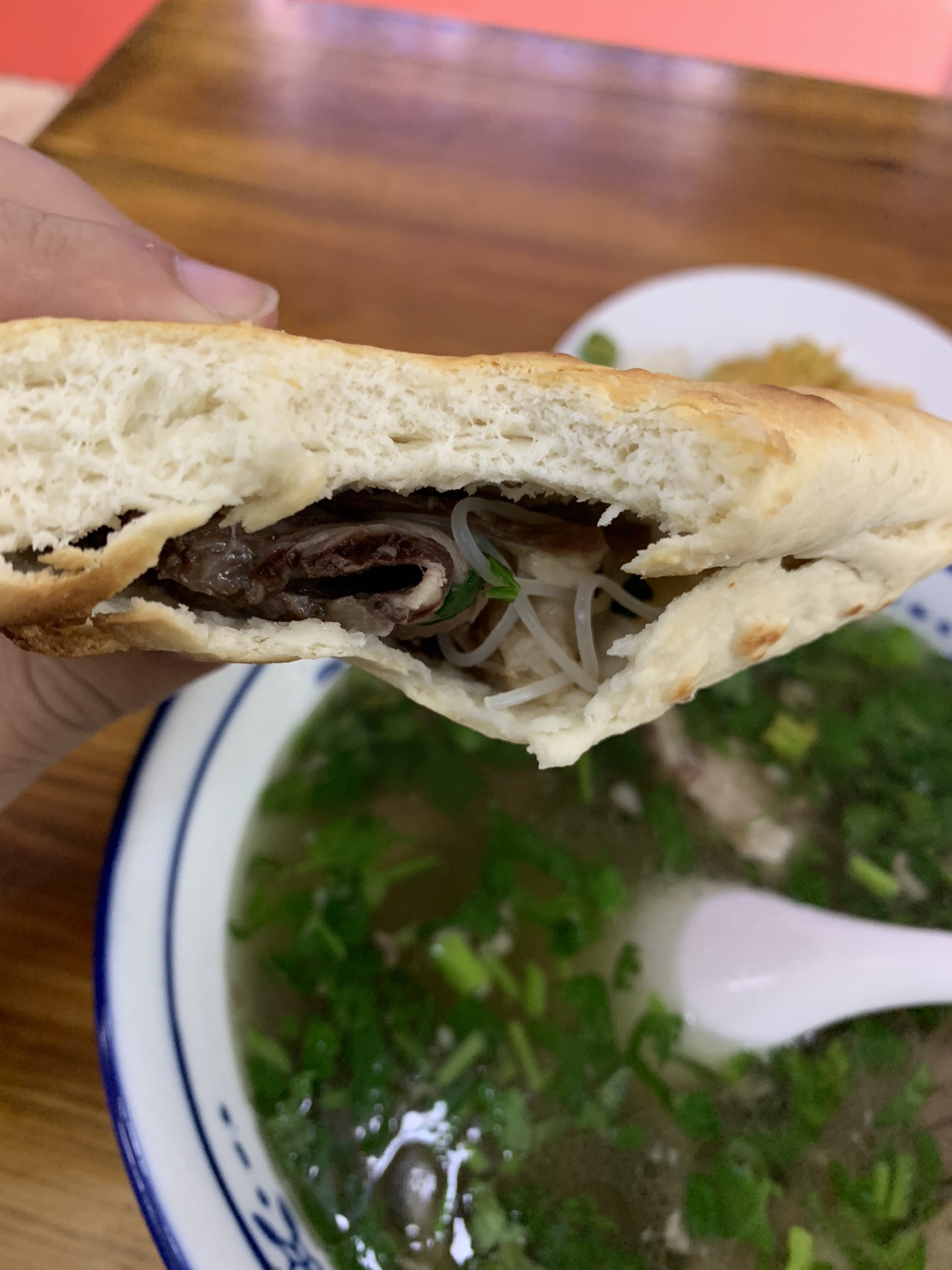 由于走了一天的路,夜宵又加了个肉夹馍,既然是在回坊,肉夹馍自然是牛肉馅的,个人觉得并没有猪肉的腊汁肉夹馍好吃,不过量是一如既往的大。