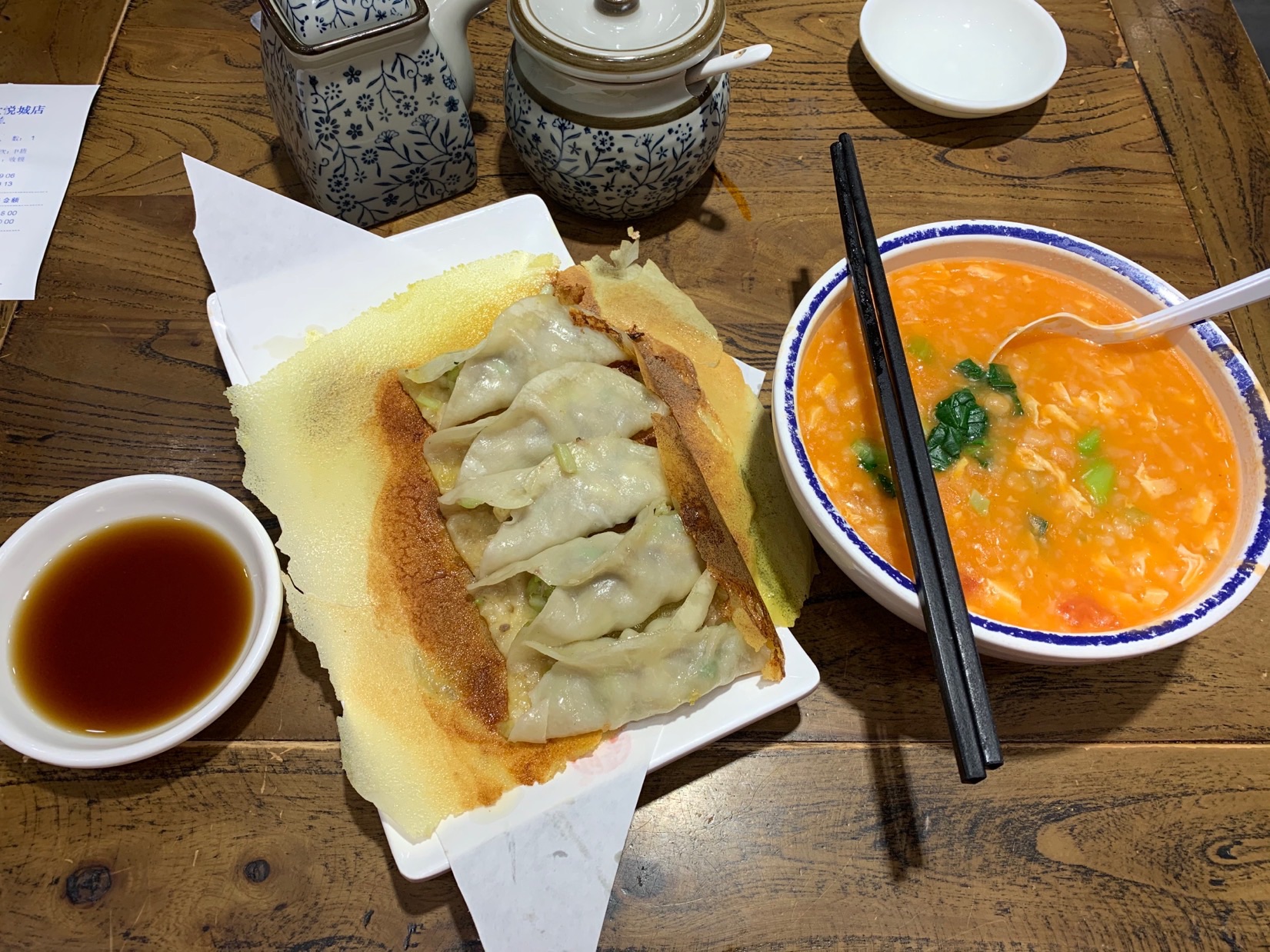 由于早上的水盆羊肉吃得太饱,中午没点太多,点了一份招牌的锅贴和一碗疙瘩汤。