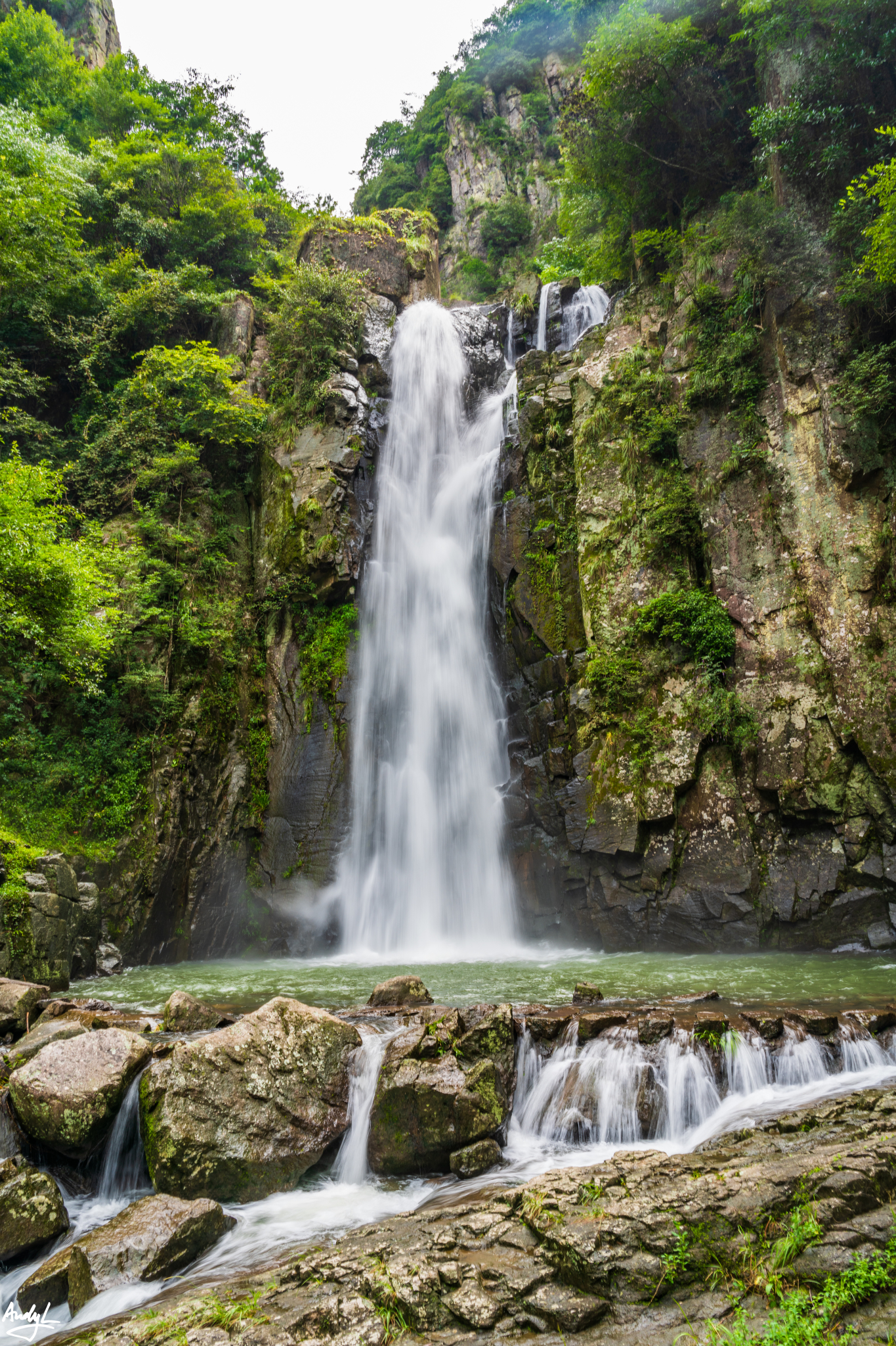 雪窦山景区分为好几个部分,一般来说,大部分人都会在游客中心这样乘坐景区车先到三隐潭站,然后自上而下游玩。首先来到的就是三隐潭,这里是一段组合的瀑布景观,自上而下分为上隐潭、中隐潭和下隐潭三个部分。从游览车的三隐潭站下车,走下一长段阶梯,就能来到上隐潭,如下图瀑布的落差还是非常高的,三个瀑布下面都有一处深潭。