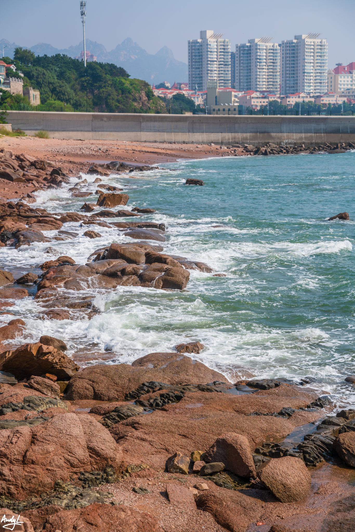 由于有当时一个台风擦着胶东半岛过境,虽然没有对青岛造成什么影响,市区也感受不到太大的风,但在这垭口之上,还是能感受到到风的猛烈。大风吹得让人几乎站不稳。下面的这张照片,几乎是一手扶着帽子,一手拿着相机拍摄的。