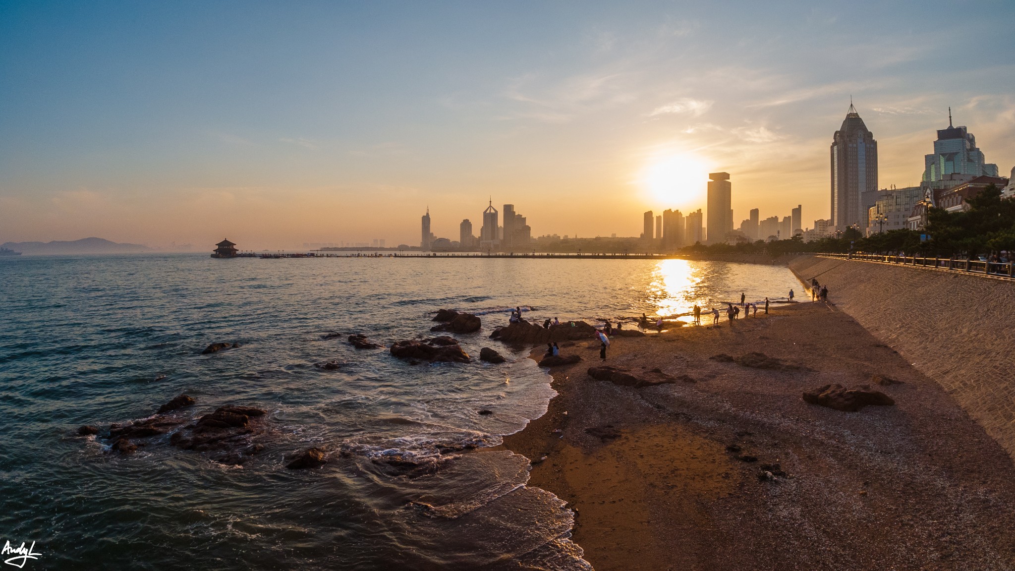 夕阳下的栈桥和青岛湾,非常漂亮。