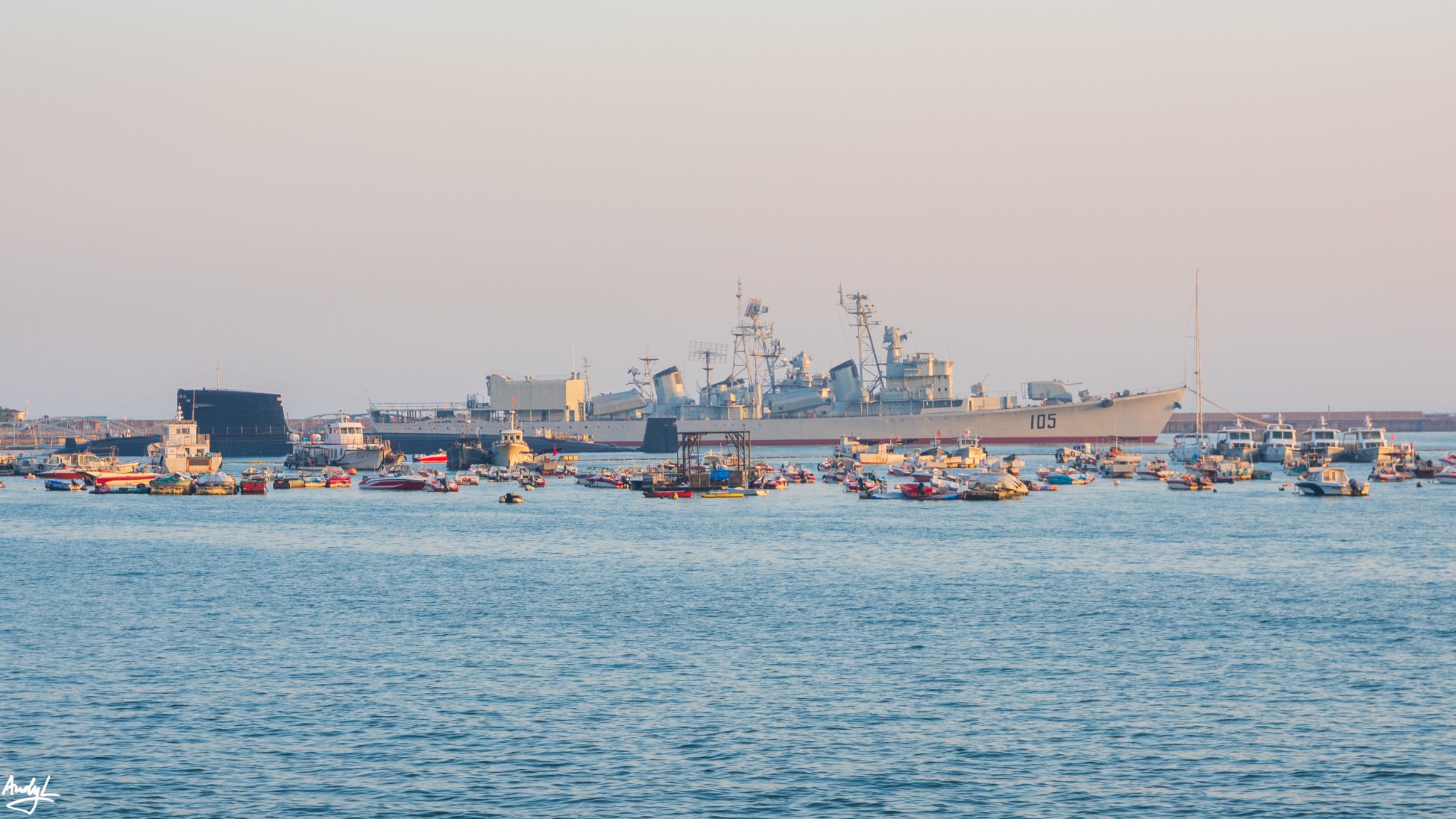 我们在离栈桥不远海面上,看到了一艘现役的军舰,静静停泊在青岛湾中,于青岛湾中海军博物馆中的老旧军舰遥相呼应。