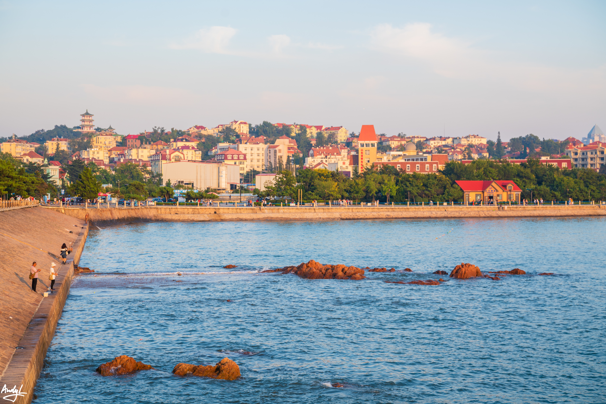 从总督楼出来,可以直接步行前往栈桥,一路上可以看到不少德国殖民时期留下来的建筑。我们来到栈桥海边的时候已经是夕阳西下的傍晚了