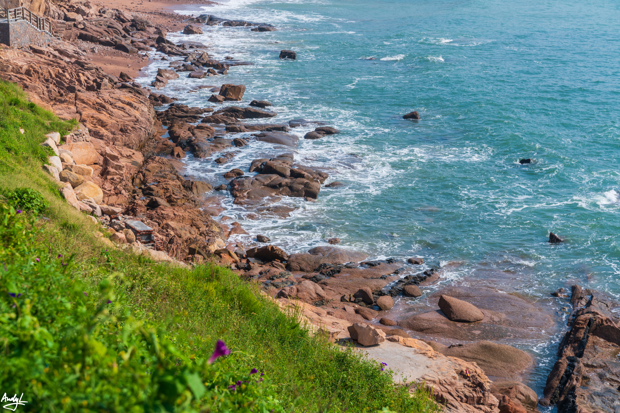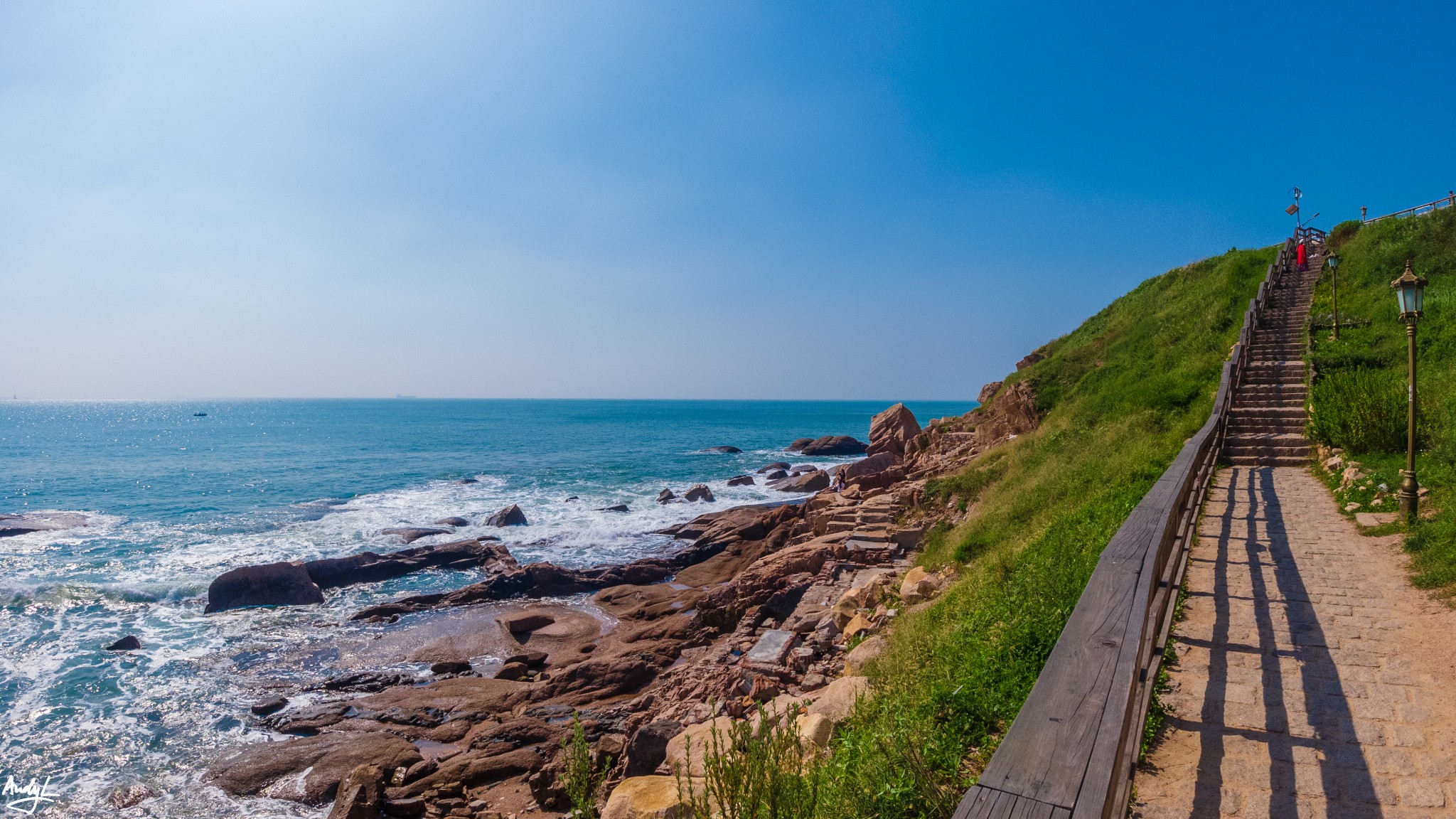 沿着海岸线,修建了一条高低起伏的栈道,蓝色的大海、棕色的礁石,绿色的草地形成了绝佳的颜色组合。