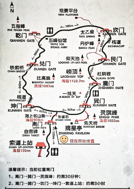 3. 巨峰景区中有象征八卦的八道门,沿着登山路上山过了离门之后,可以选择顺时针或者逆时针游览,如果时间有限、体力堪忧的人,可以选择逆时针去到巽门,然后看完灵旗峰下山,如下图,从离门到灵旗峰大约需要半小时时间,而走完一圈大约需要3个小时。