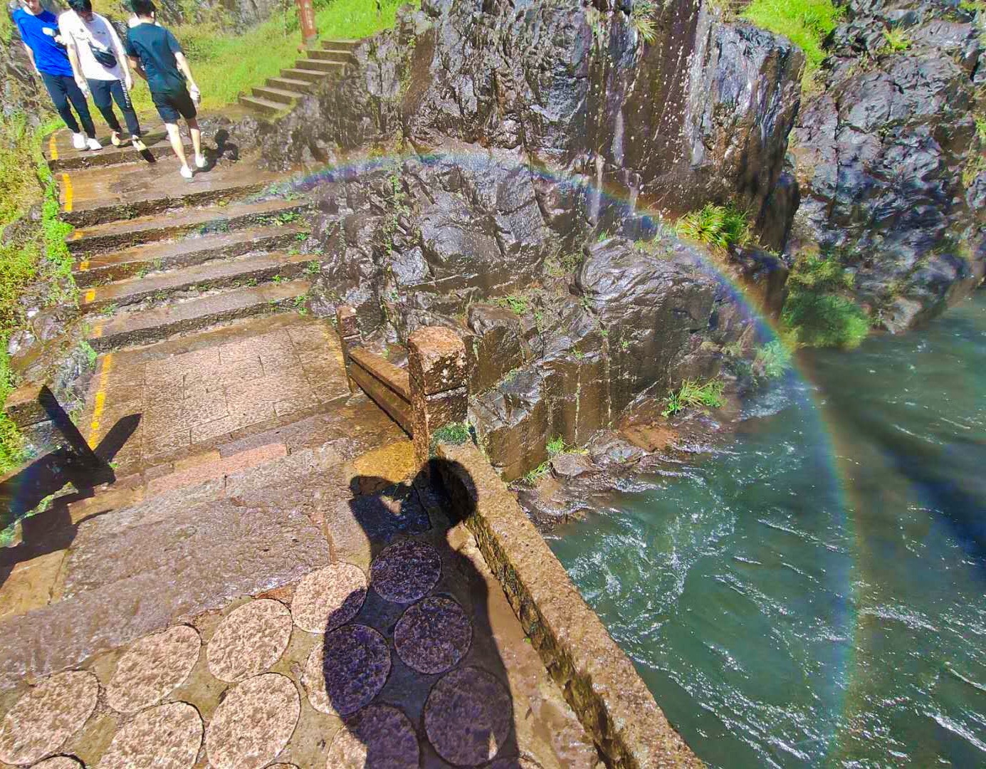 之前在景区门口,有不少小贩在卖一次性雨衣,我们还有些困惑,等我们来到瀑布下方时,才知道这瀑布带来的水花,基本和大雨无异。但正是这些水花,让我们在瀑布下看到了完整的圆形的彩虹。