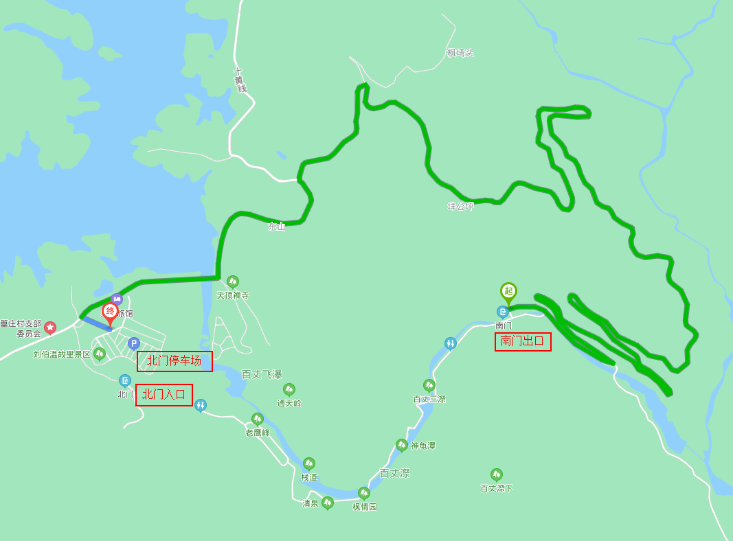 在地图上搜索百丈漈景区,可以看到有北门和南门两个出入口,强烈建议从北门进南门出,如下图。