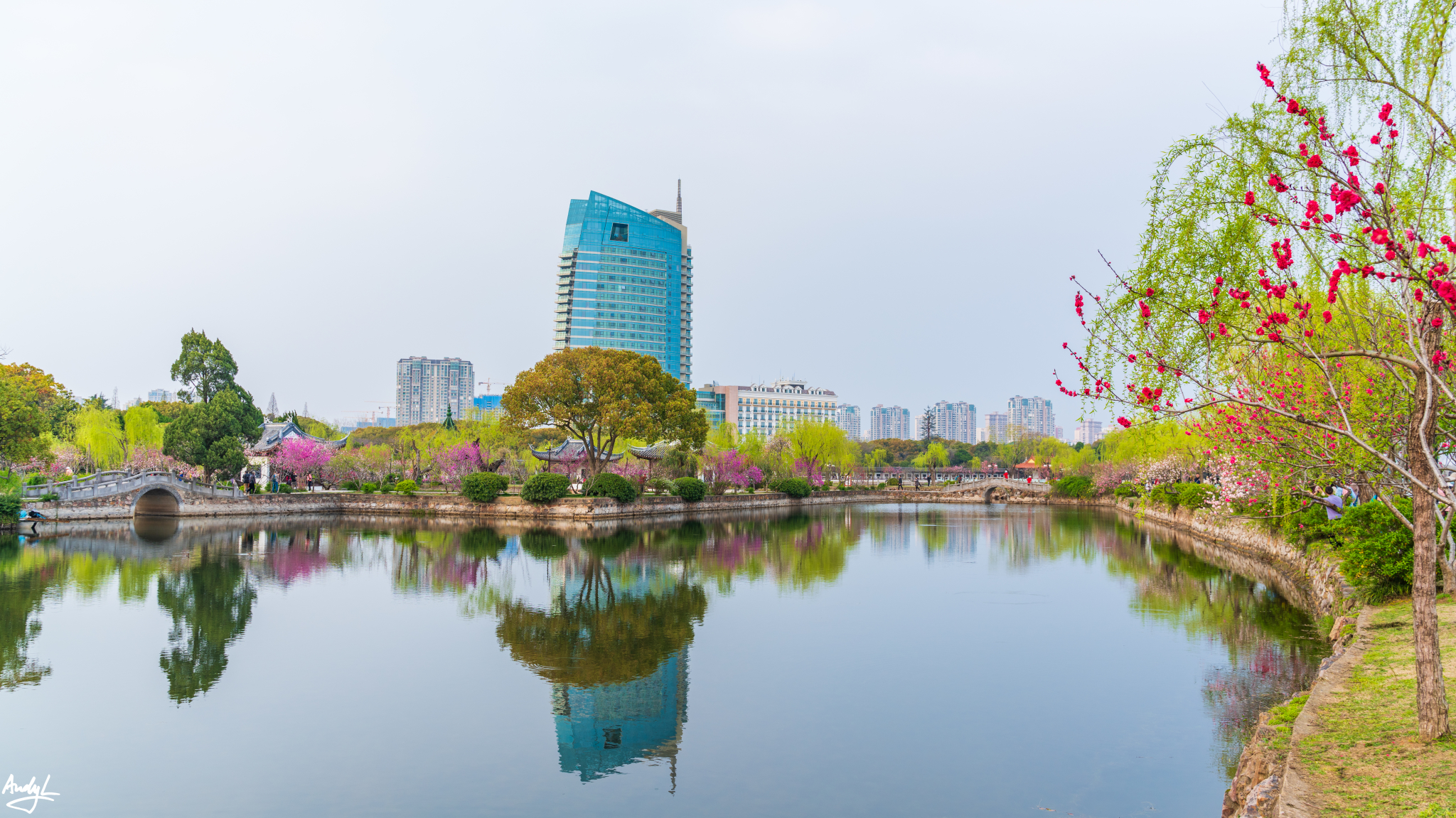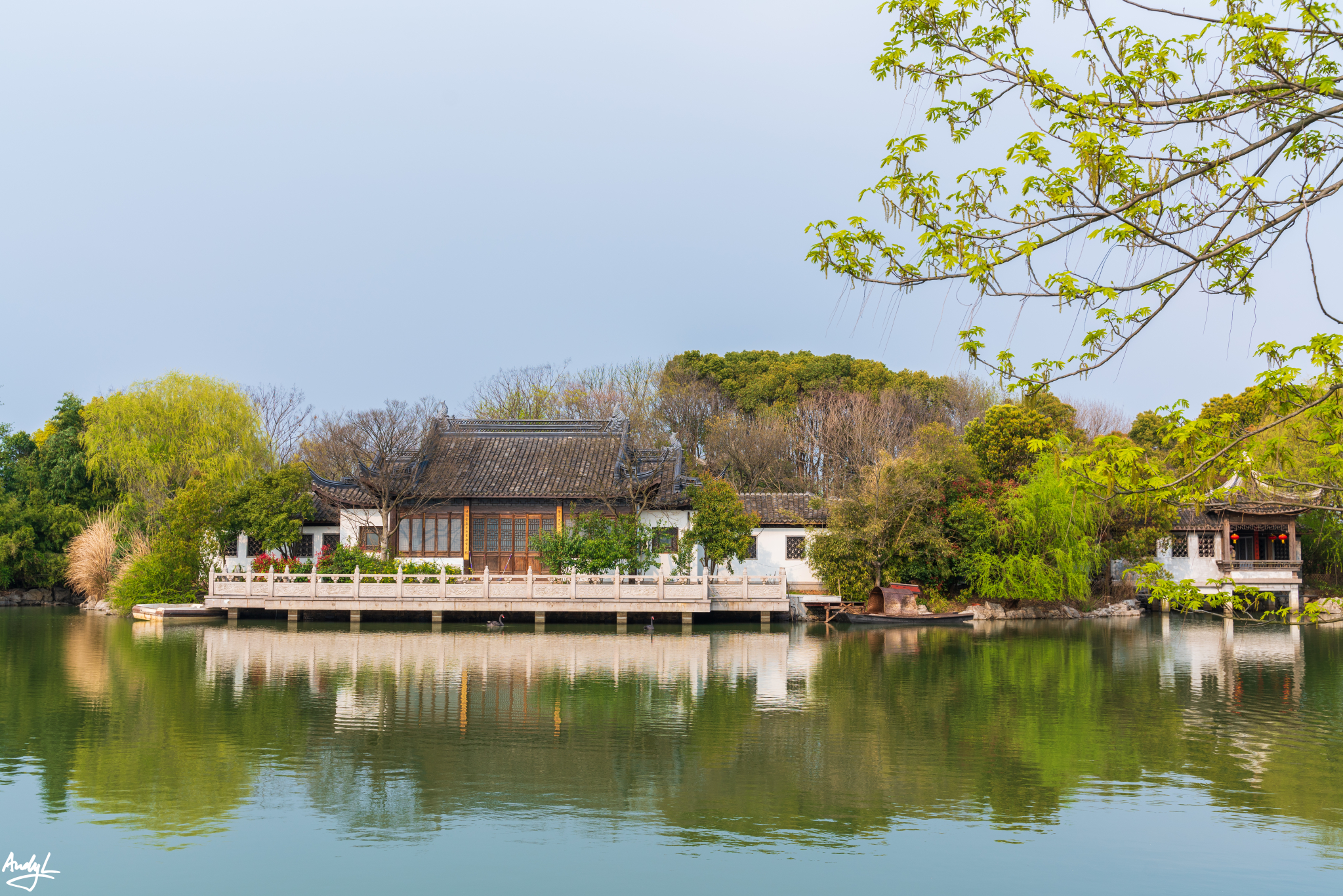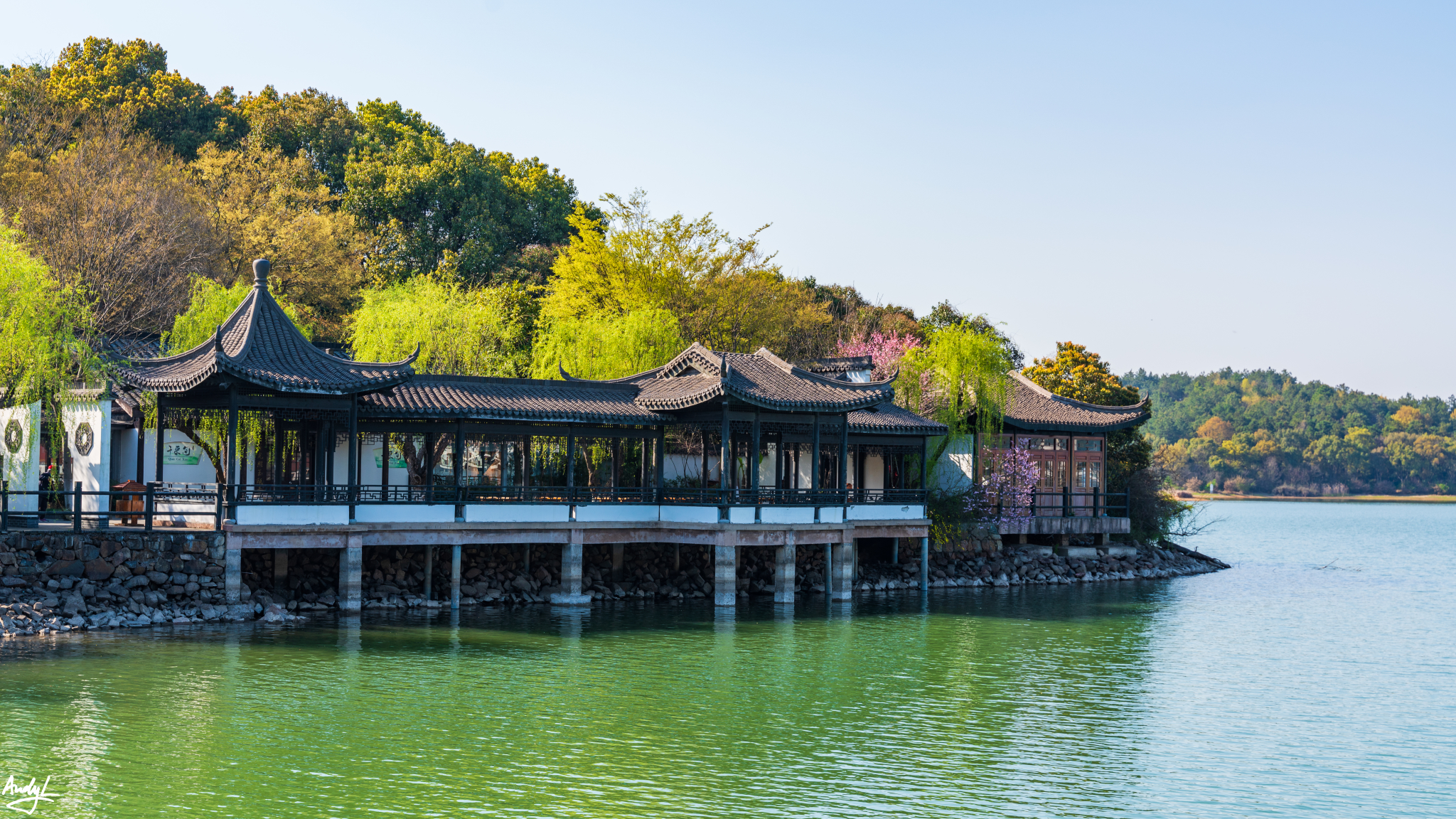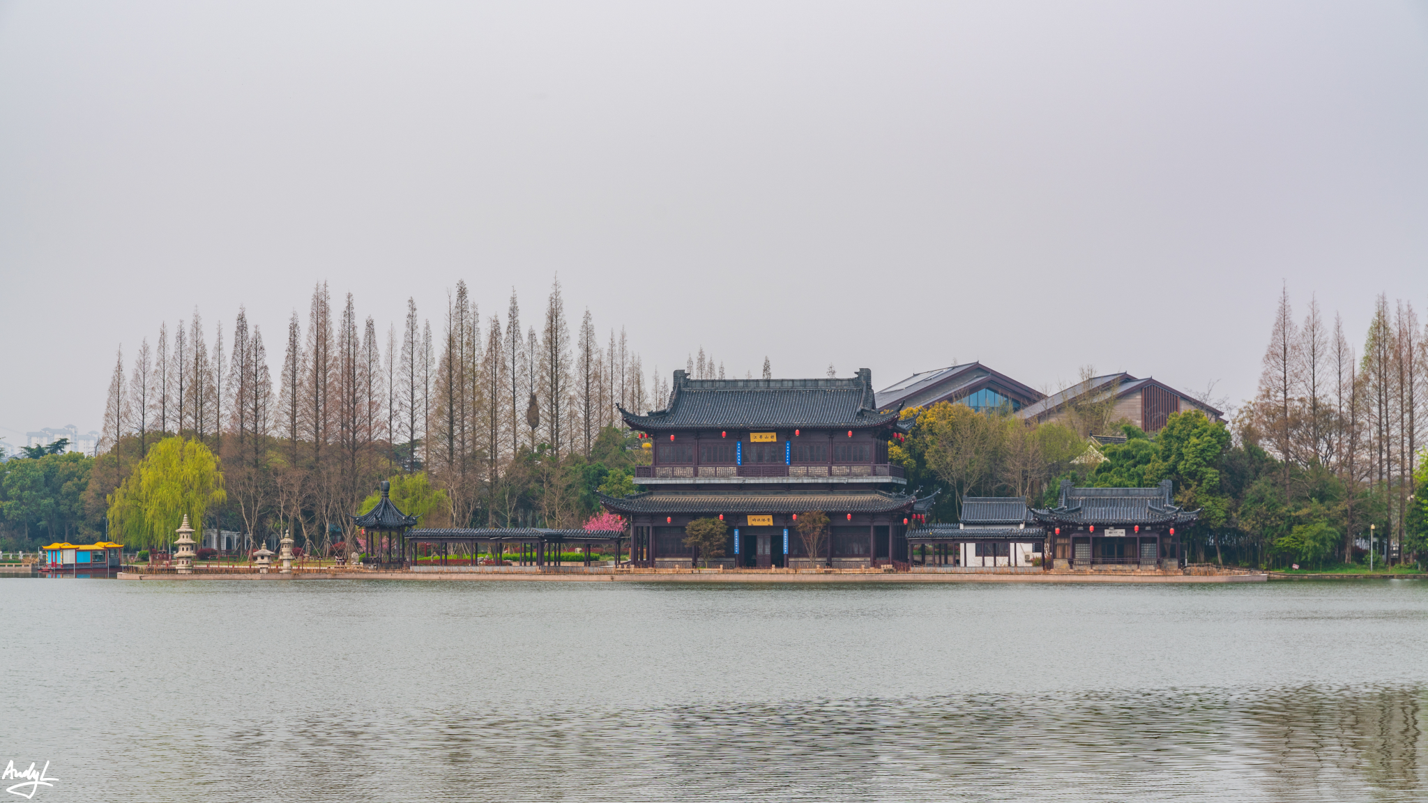 如果说樱花谷的赏樱楼有一种日式的风格,那长春桥附近的楼阁水榭就完全是中式的风格了。