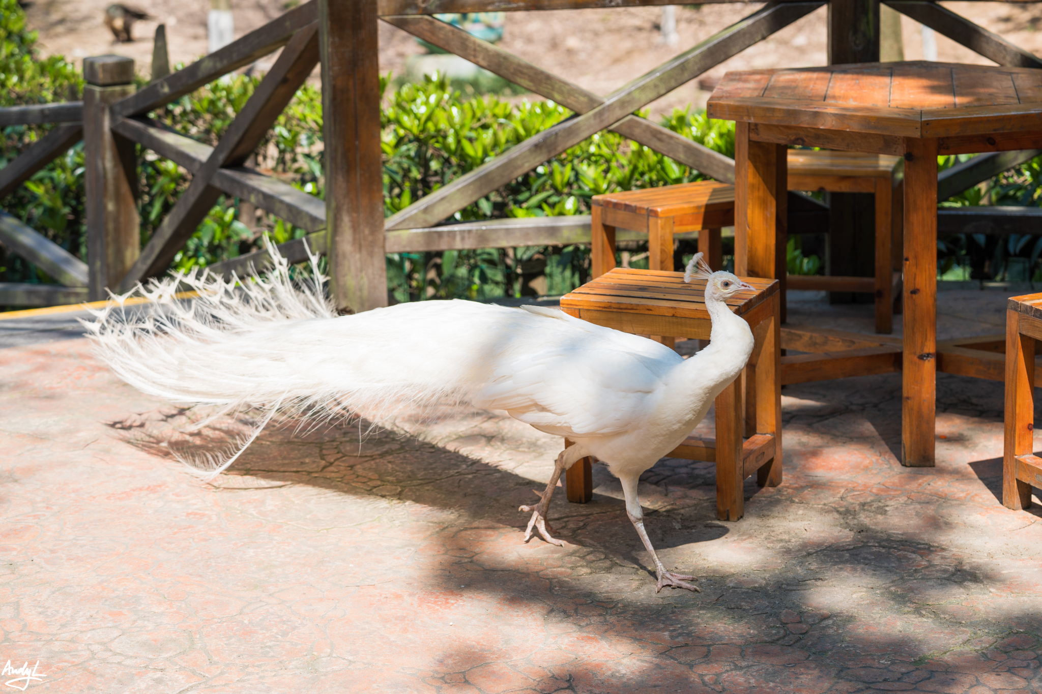 这里的孔雀并没有关在笼子里,低矮的栅栏对于孔雀来说可以轻松飞越,而且这里的空缺似乎也不是很怕人,可以近距离观察。
