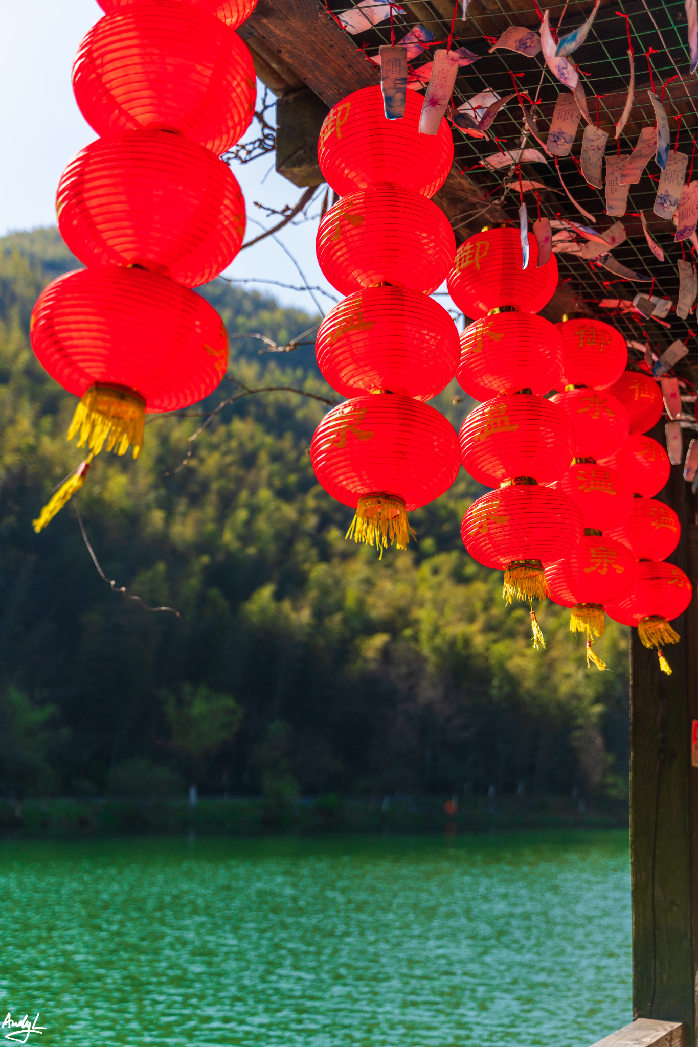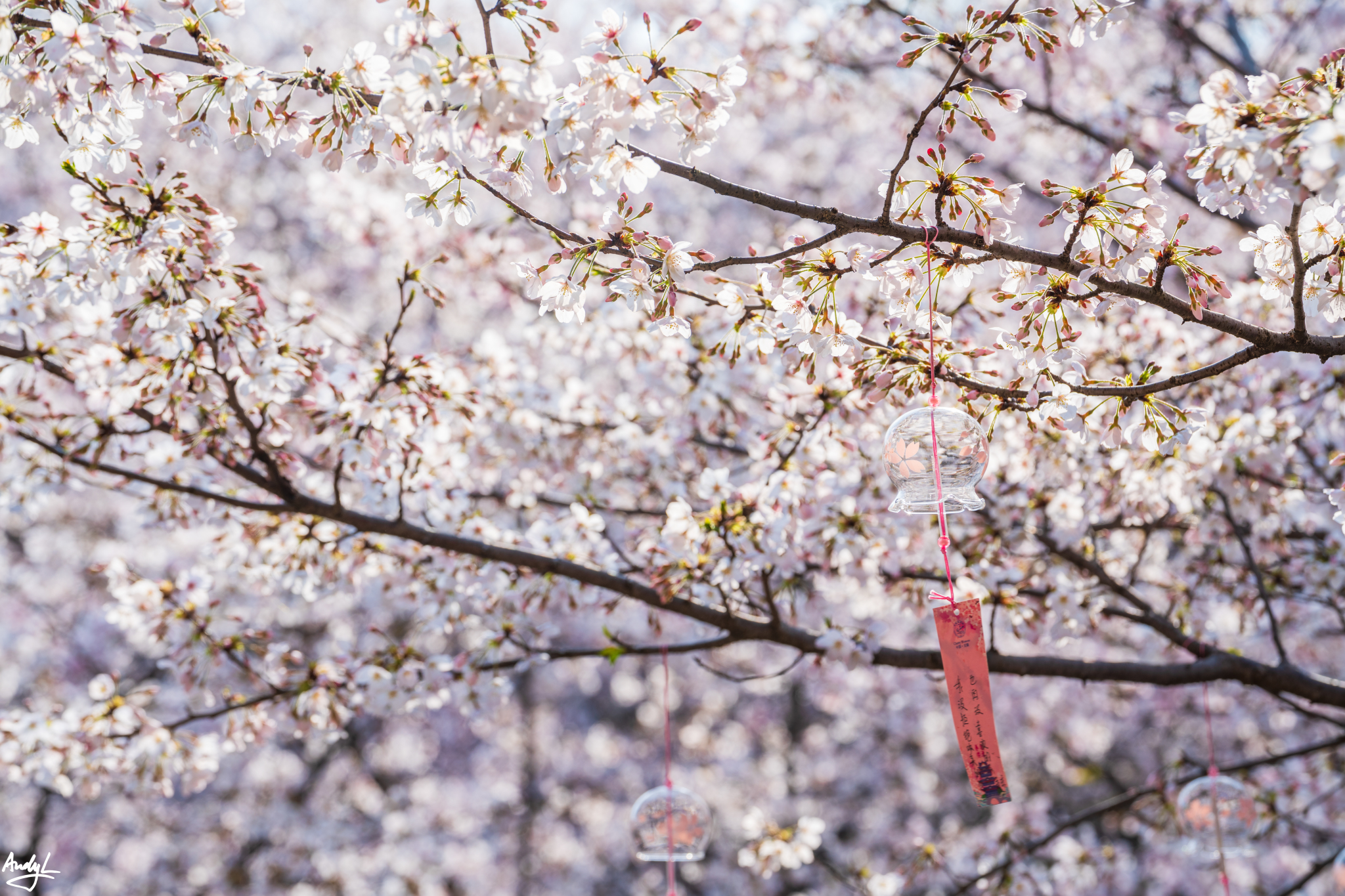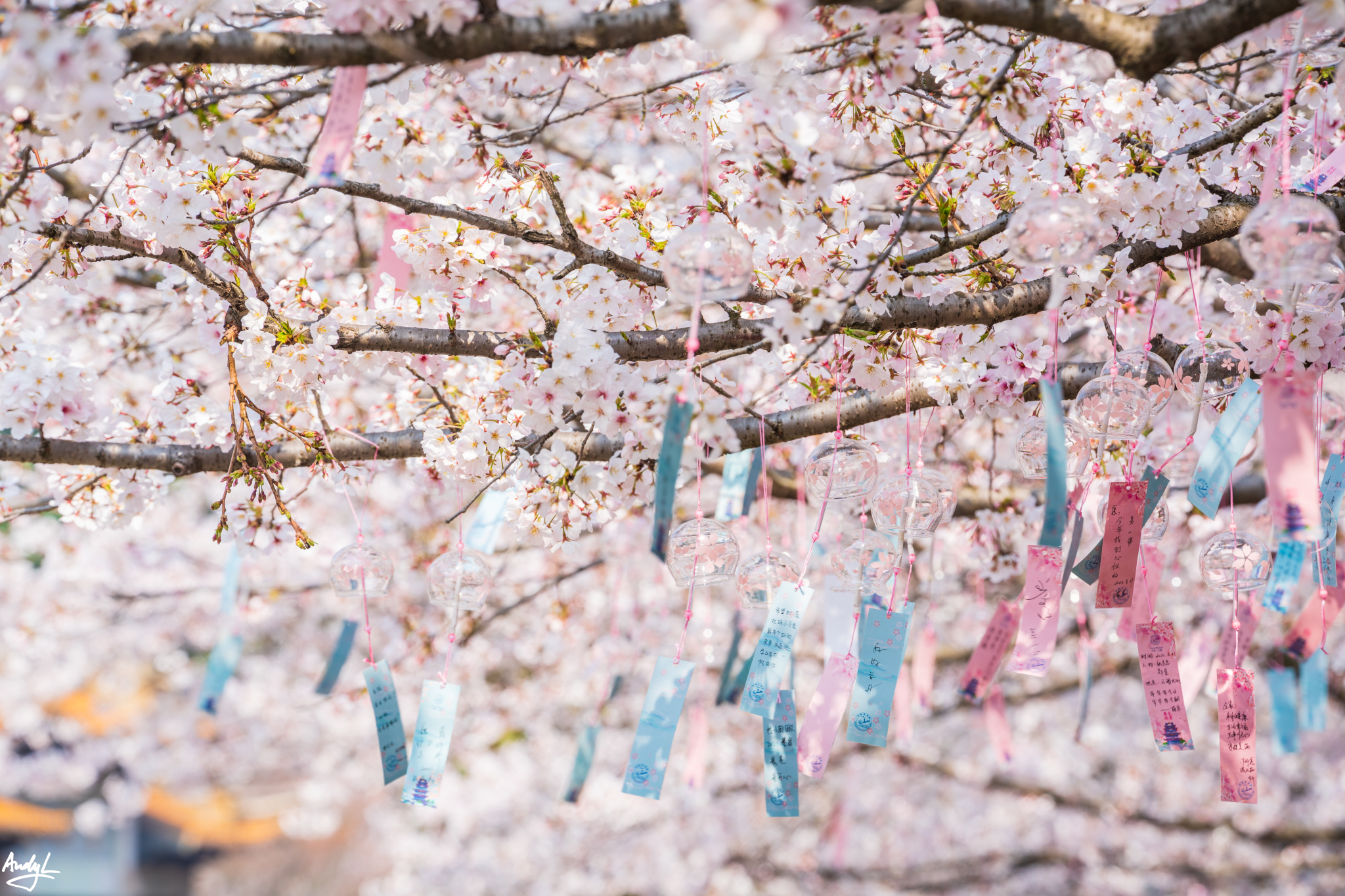 樱花树上挂满了风铃,上面写着人们对新春最期待的祝福。