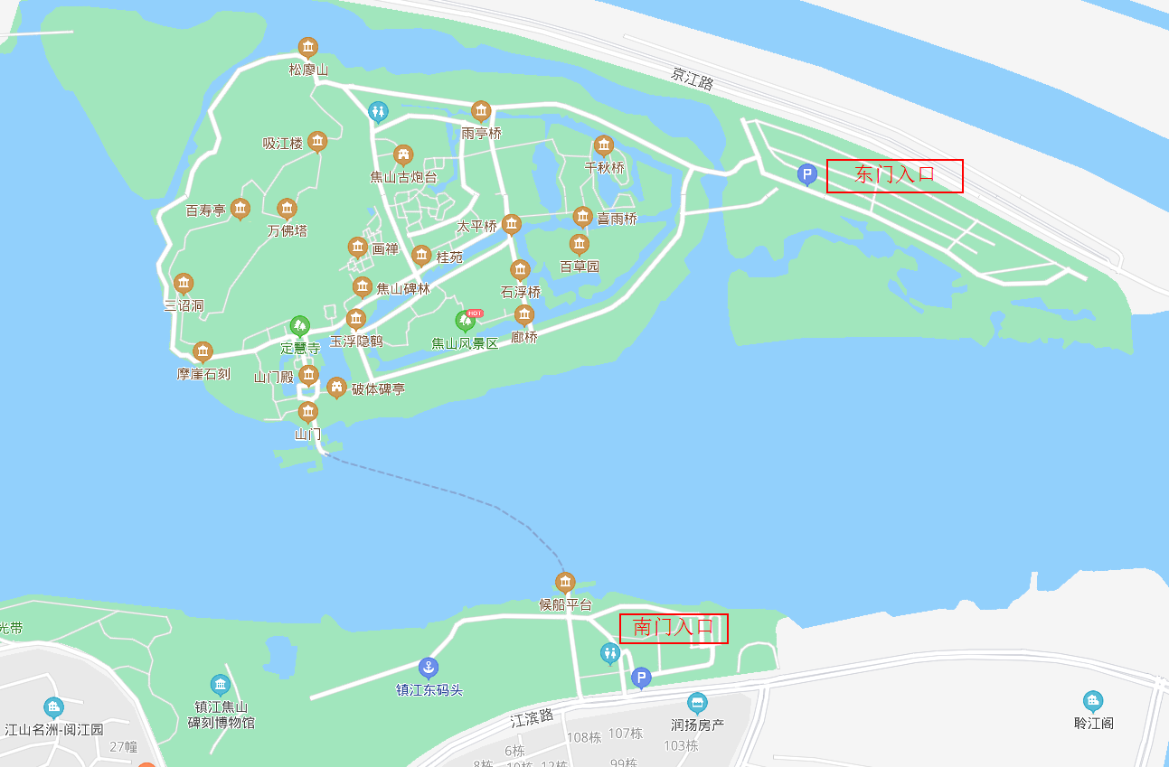 焦山景区一共有两个主要入口。如果是自驾前往,建议从东门入口进入,停车位比较充足。从南门入口进入的话,需要坐渡船到达焦山,下船后直接到达定慧寺山门。