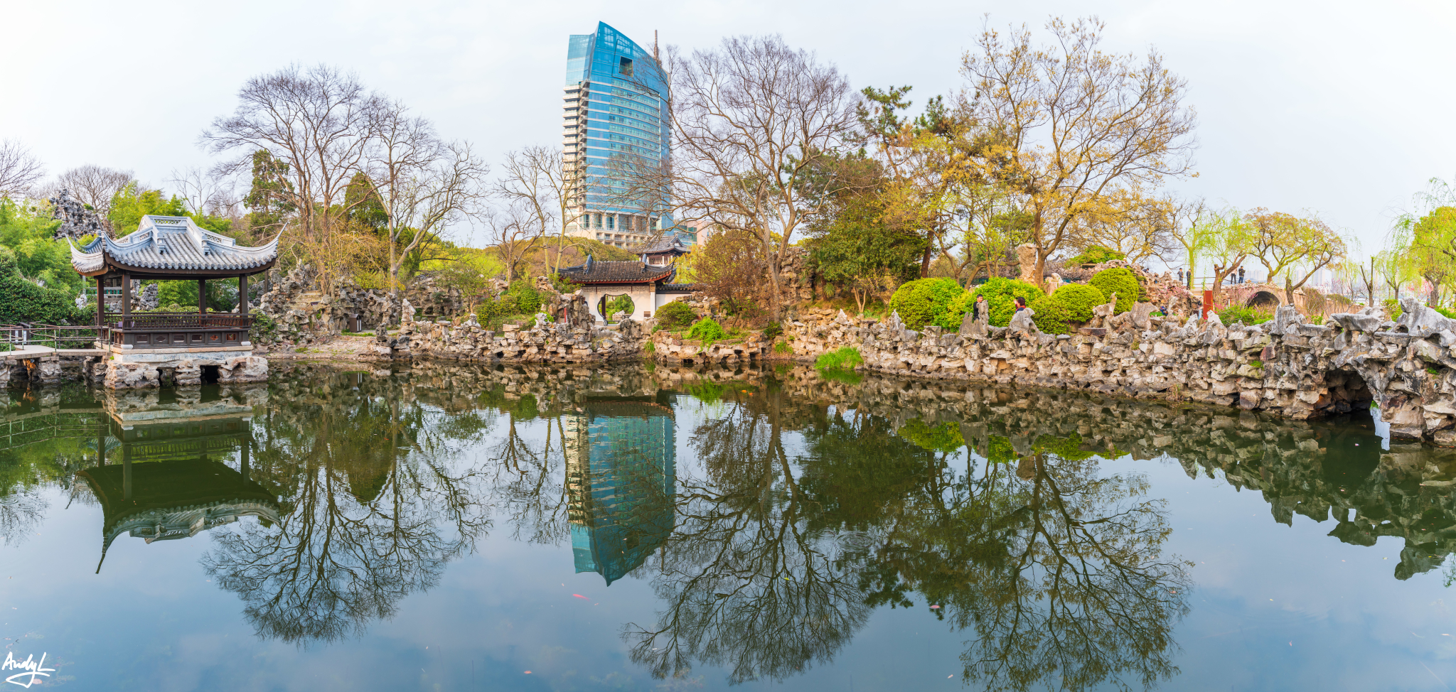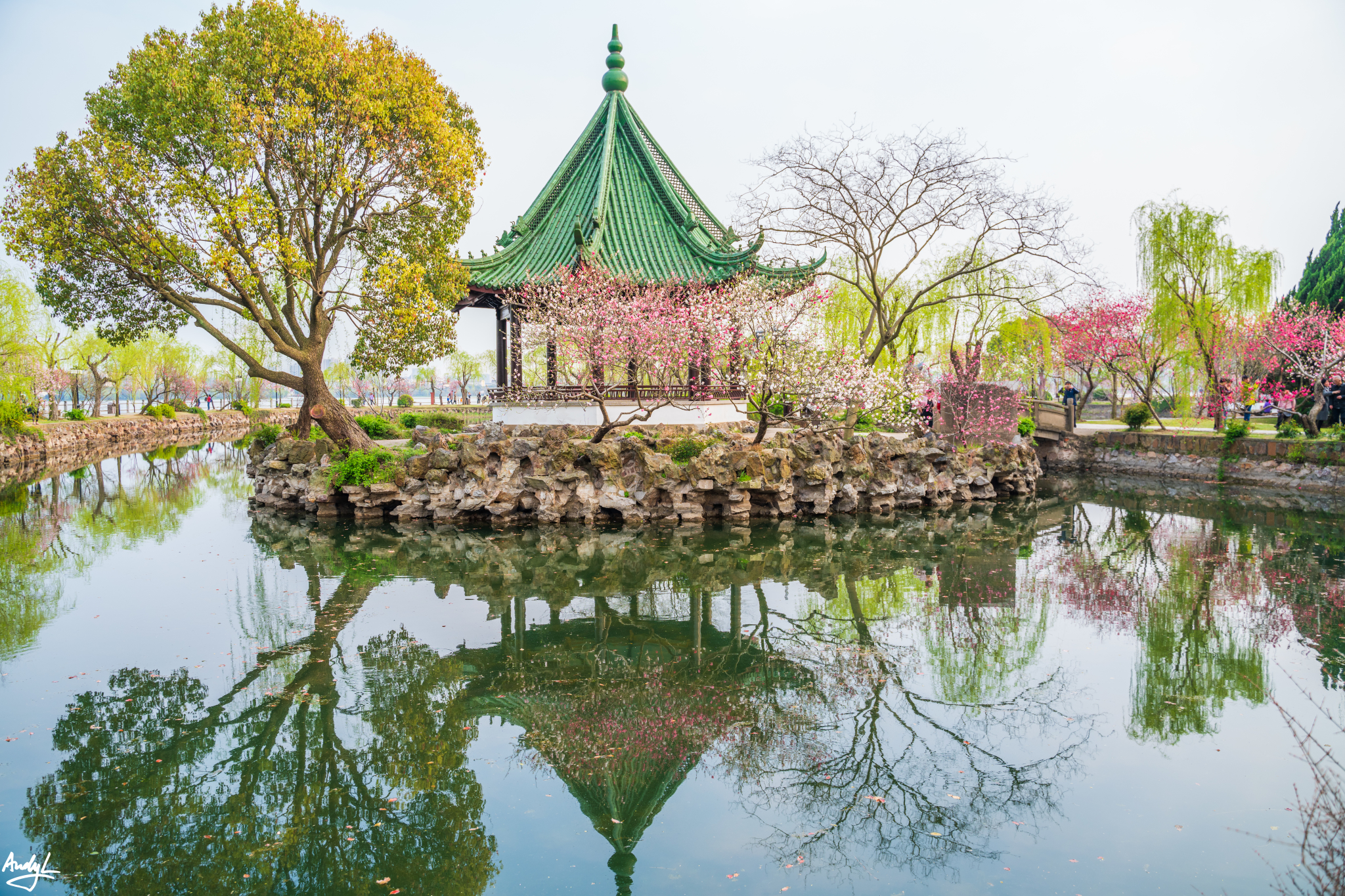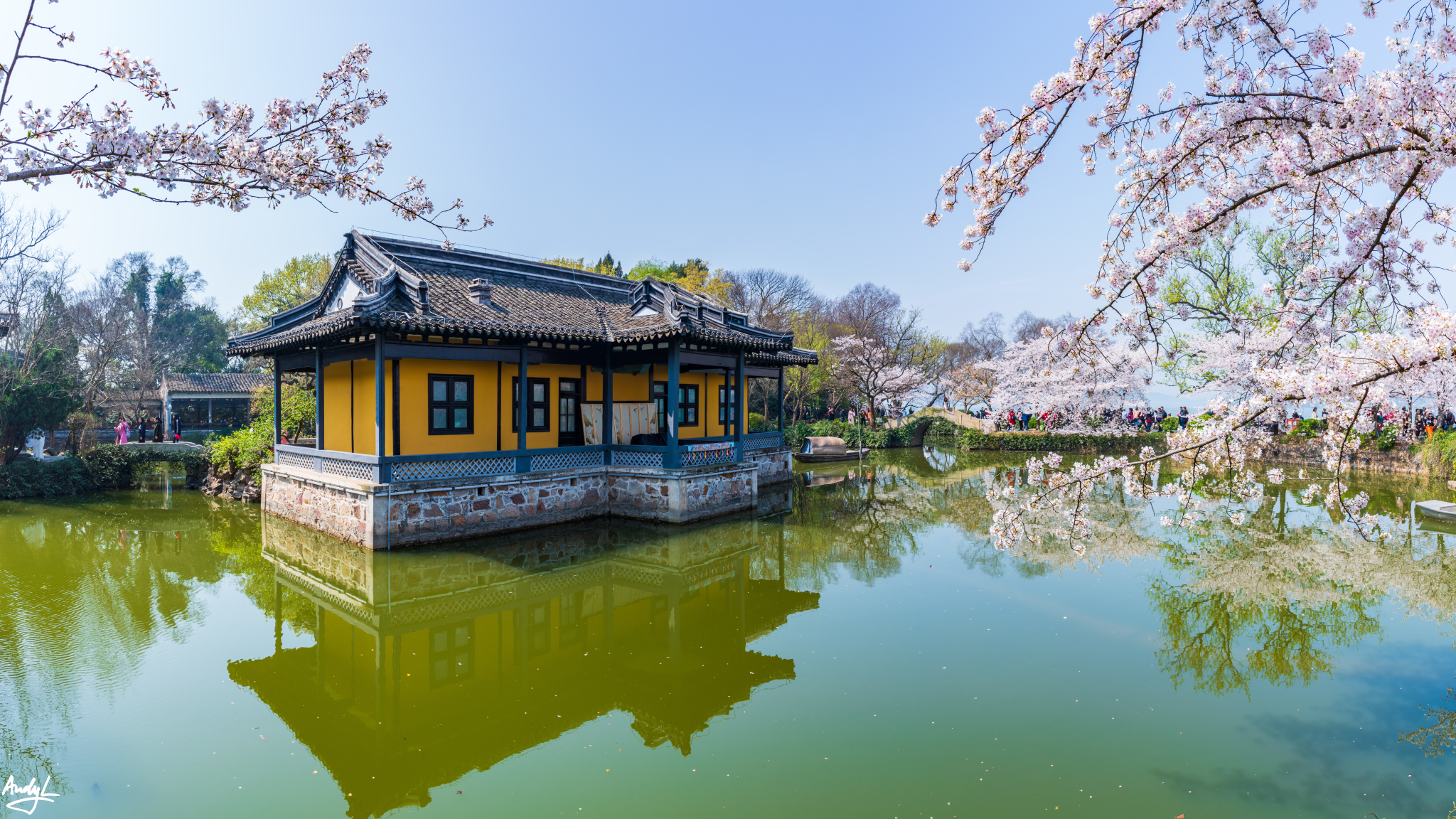 在春季,相对于人气极高的鼋头渚,不远处的蠡园就稍微冷清一点。蠡园距离鼋头渚不远,位于蠡湖边,这里的名称源自春秋战国时期的范蠡。