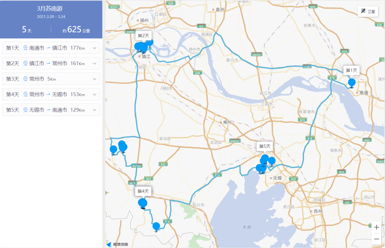 行程从南通出发,先后途径苏南的三座城市——镇江、常州和无锡,这次仍旧是自驾游的形式出行,全程大约625公里。以下是具体行程: