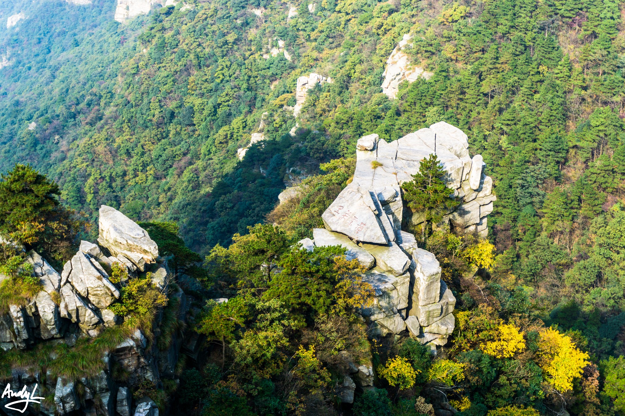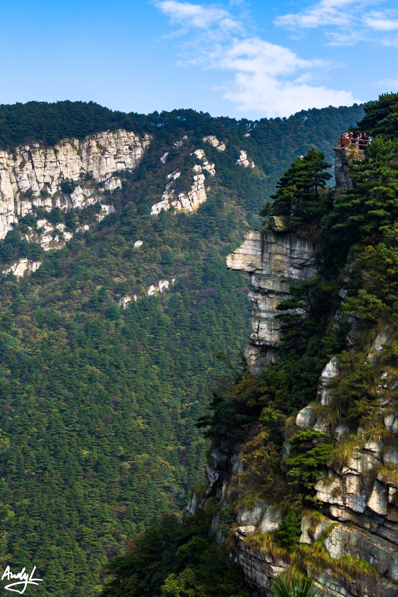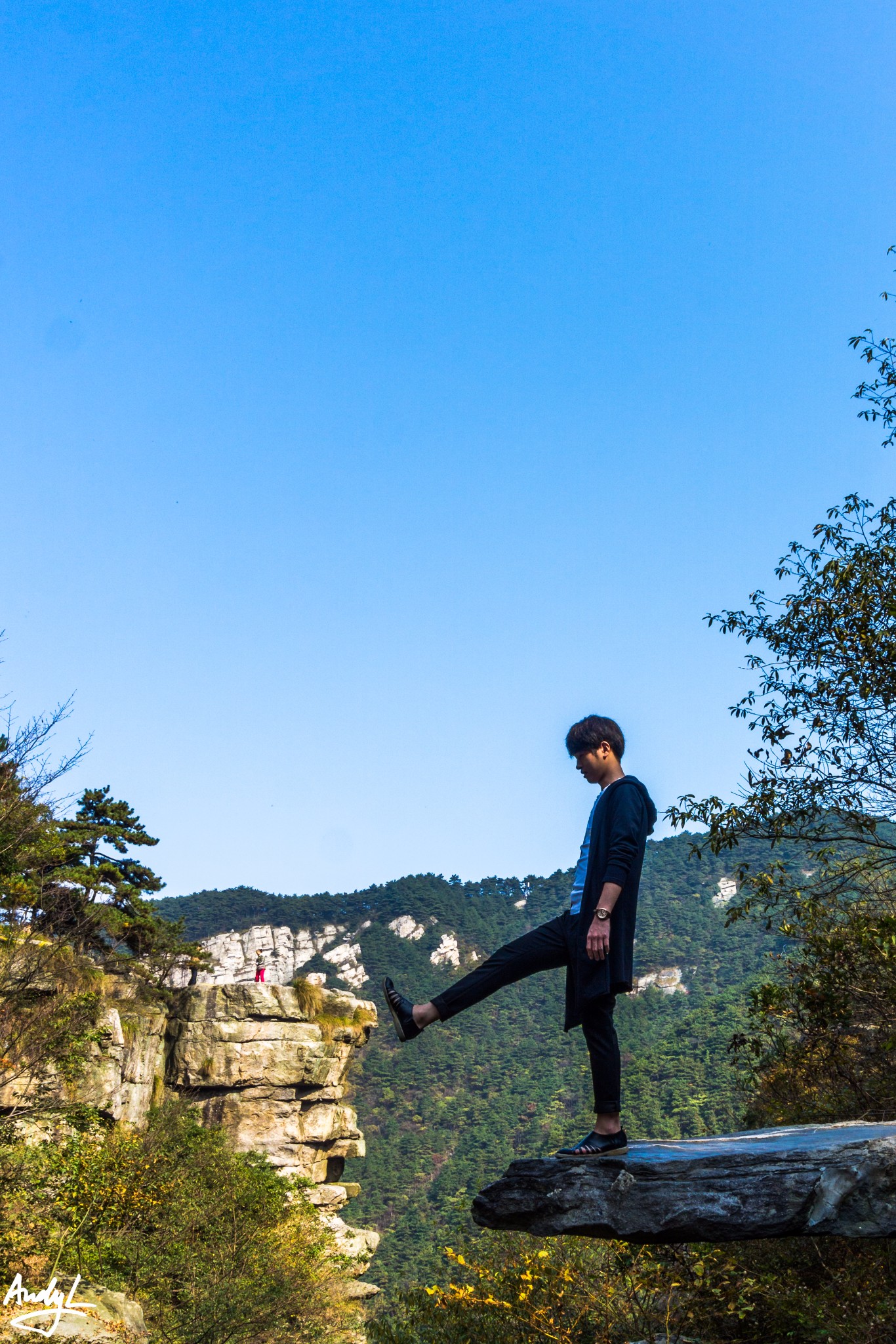 进入锦绣谷以后,马上就能来到天桥,个人认为这是锦绣谷最具代表的景点之一,其实需要运用错位拍摄才能拍出天桥的意味。实际上天桥与对面的山崖前后相隔大约百米左右。所谓天桥只是伸出来的一块岩石,距离下面的地面只有两三米高而已。相信80后的小伙伴们应该还记得《圣斗士星矢》里面紫龙的师傅童虎在庐山坐着的地方正是天桥对面的山崖,而事实上天桥景点并无动漫中的瀑布。