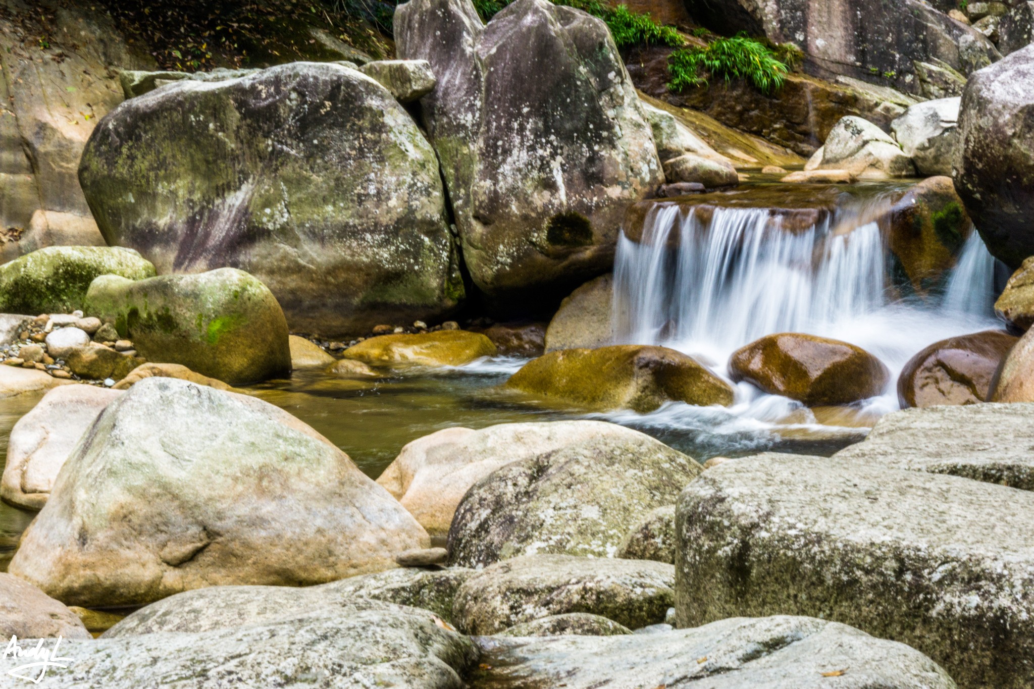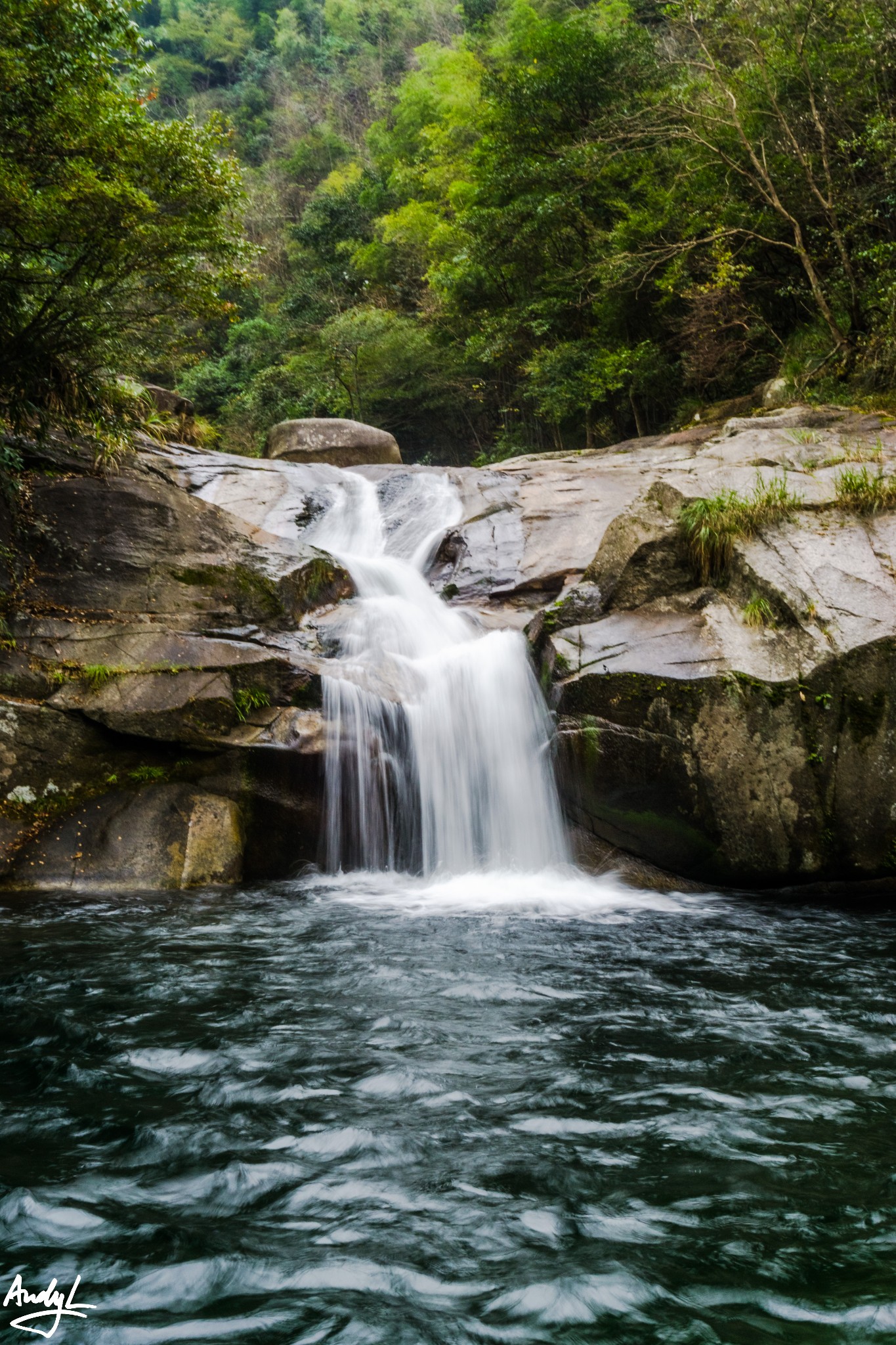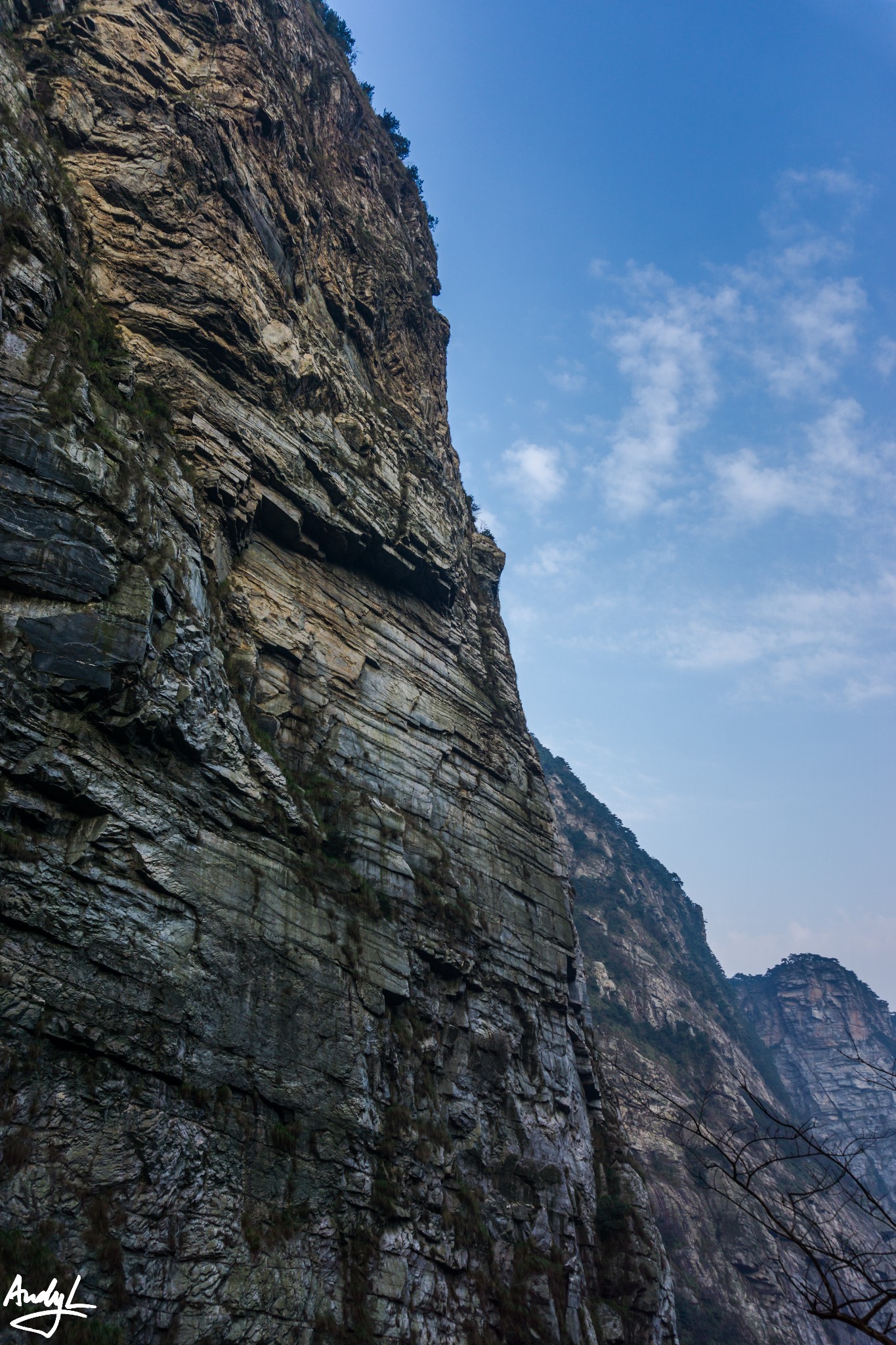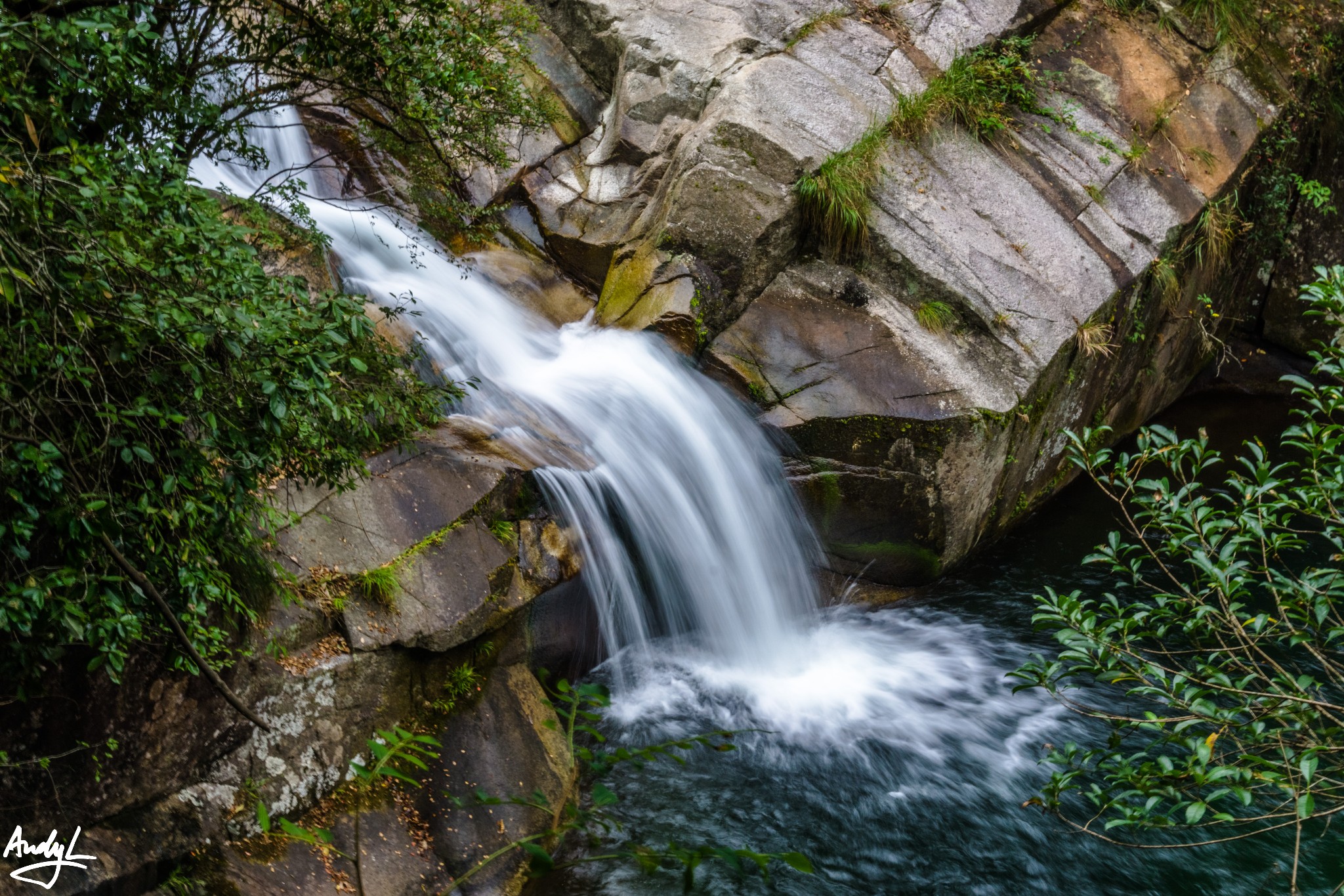 进入锦绣谷以后,马上就能来到天桥,个人认为这是锦绣谷最具代表的景点之一,其实需要运用错位拍摄才能拍出天桥的意味。实际上天桥与对面的山崖前后相隔大约百米左右。所谓天桥只是伸出来的一块岩石,距离下面的地面只有两三米高而已。相信80后的小伙伴们应该还记得《圣斗士星矢》里面紫龙的师傅童虎在庐山坐着的地方正是天桥对面的山崖,而事实上天桥景点并无动漫中的瀑布。