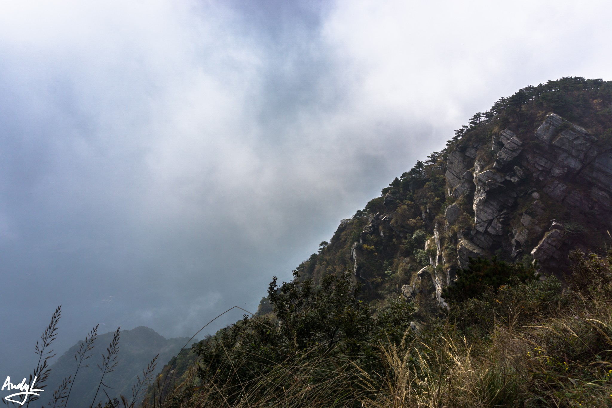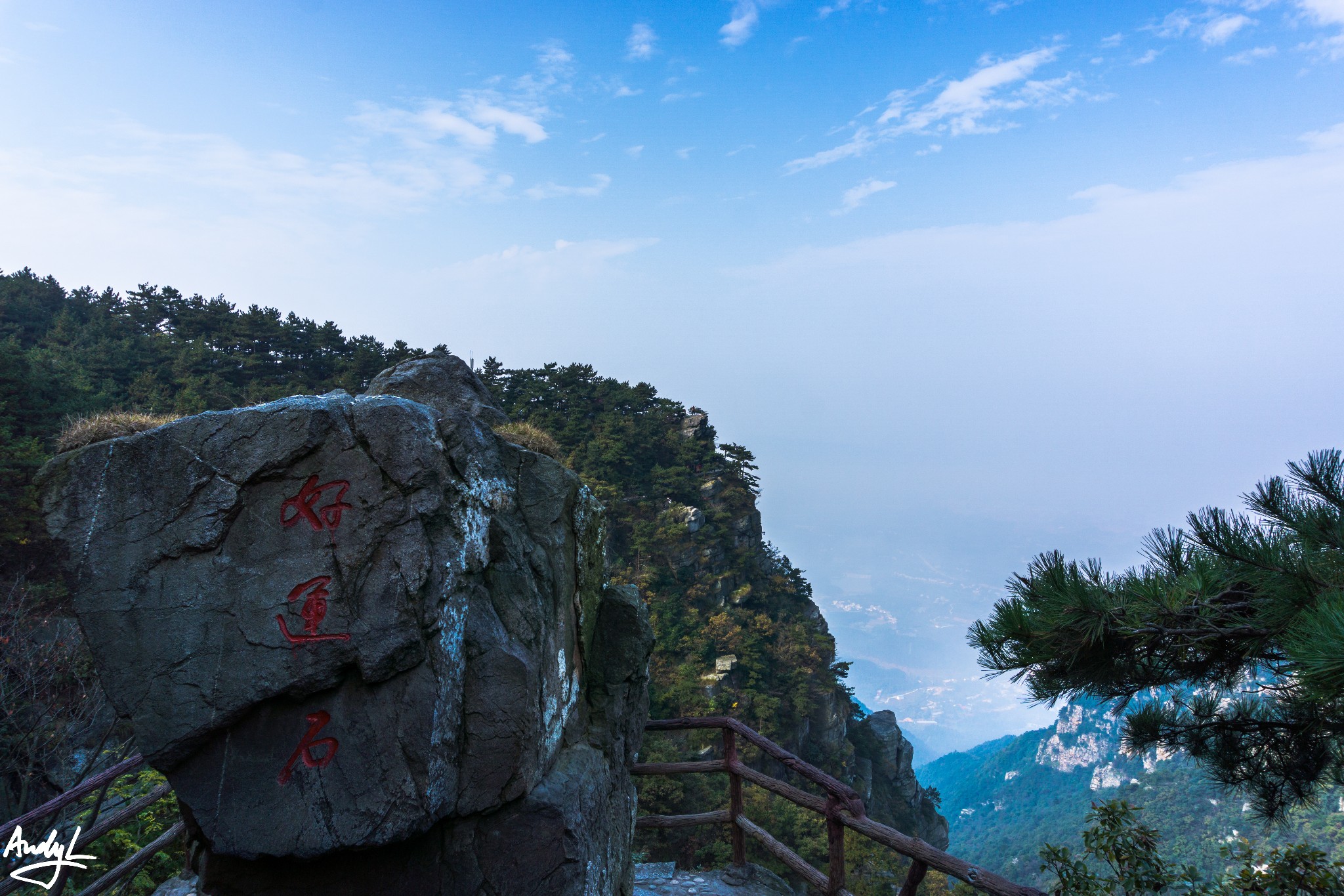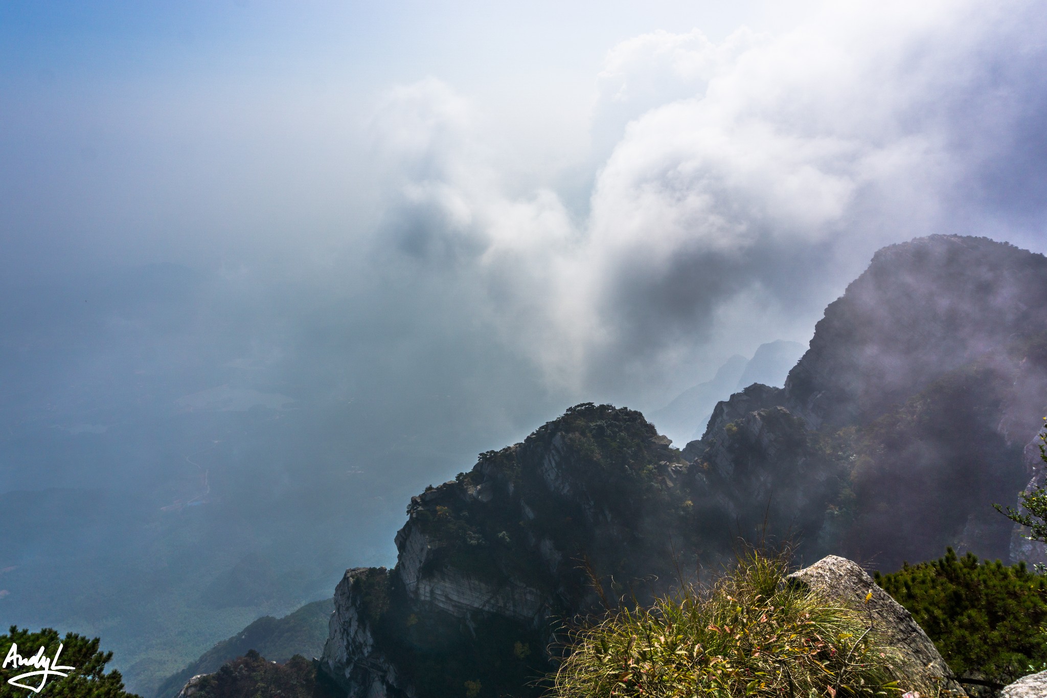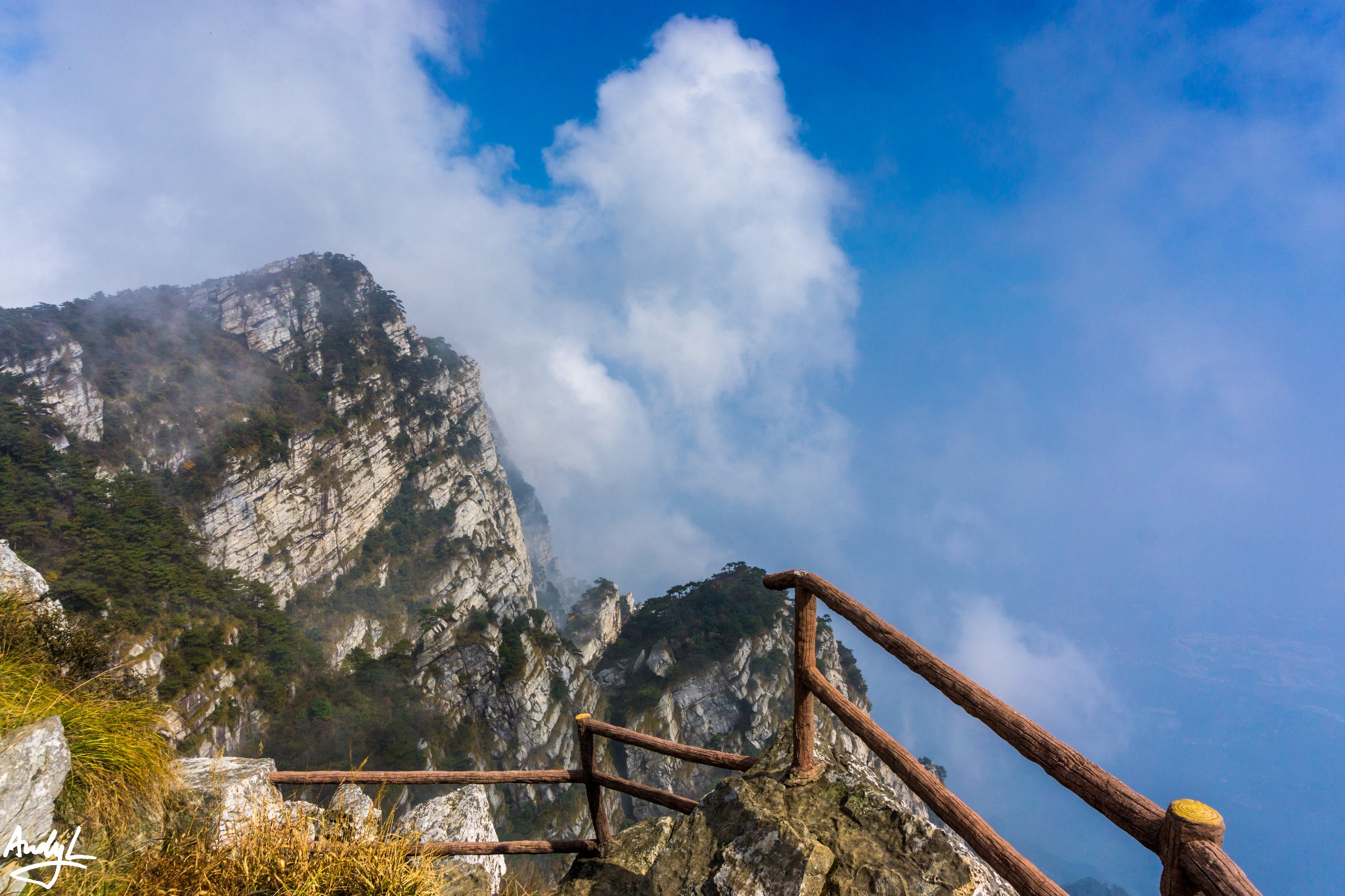 二峰是五老峰最险峻的山峰,山峰上不平坦,很多地方需要爬,护栏边就是深渊。你可以感受到雾气从山下喷涌上来,很是壮观!