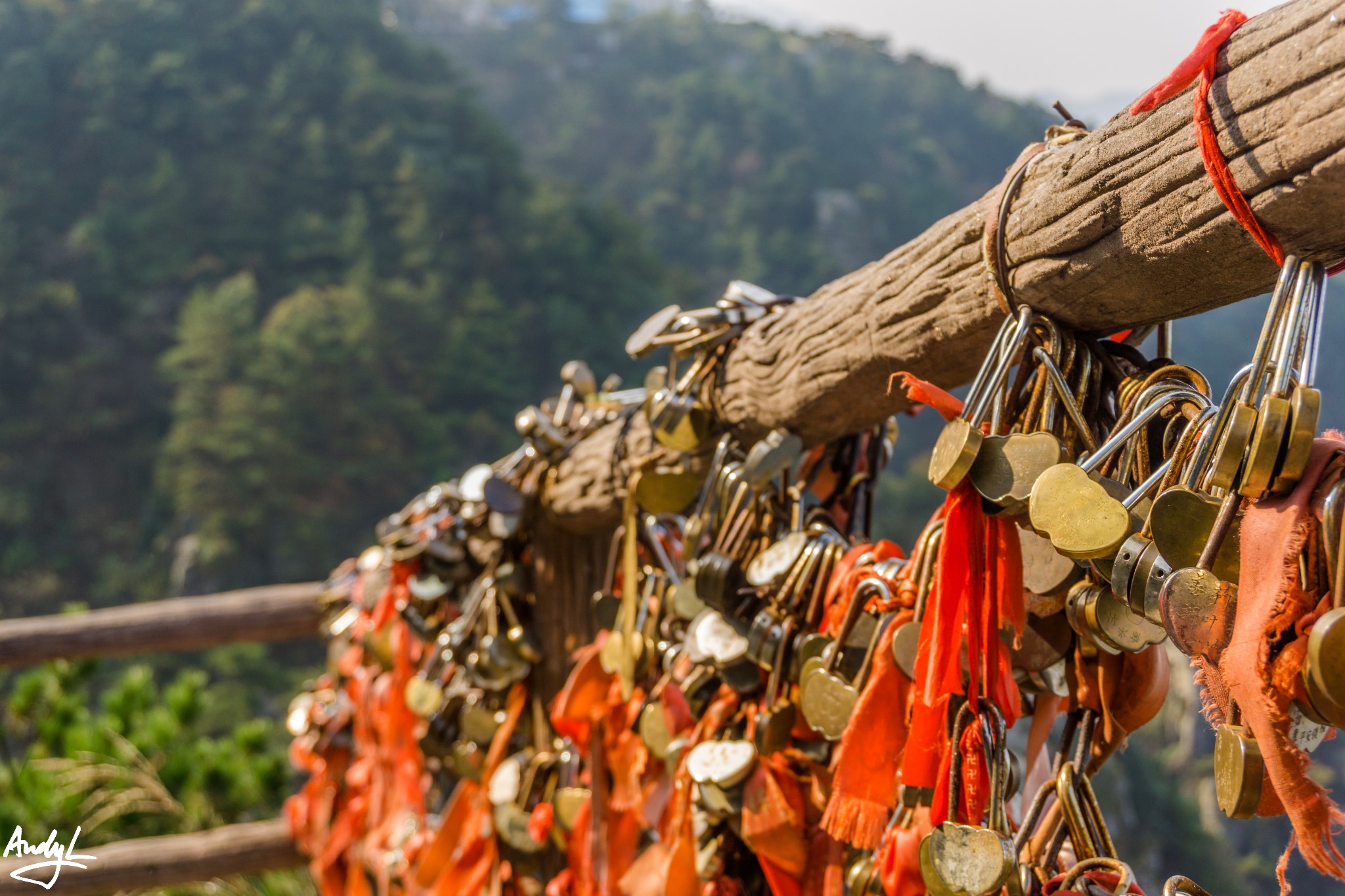 险峰的栏杆之上也挂有很多同心锁,这里还有一个好玩的细节,险峰上的小卖部出售主席像章,像章刻字10元,然而小卖部里的一瓶矿泉水就要卖8元。