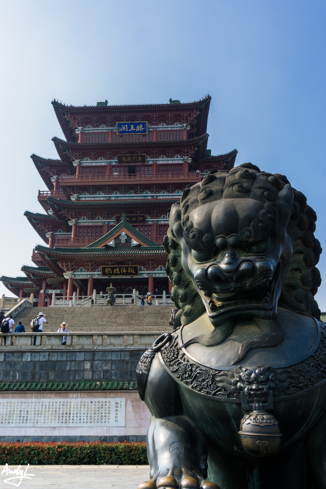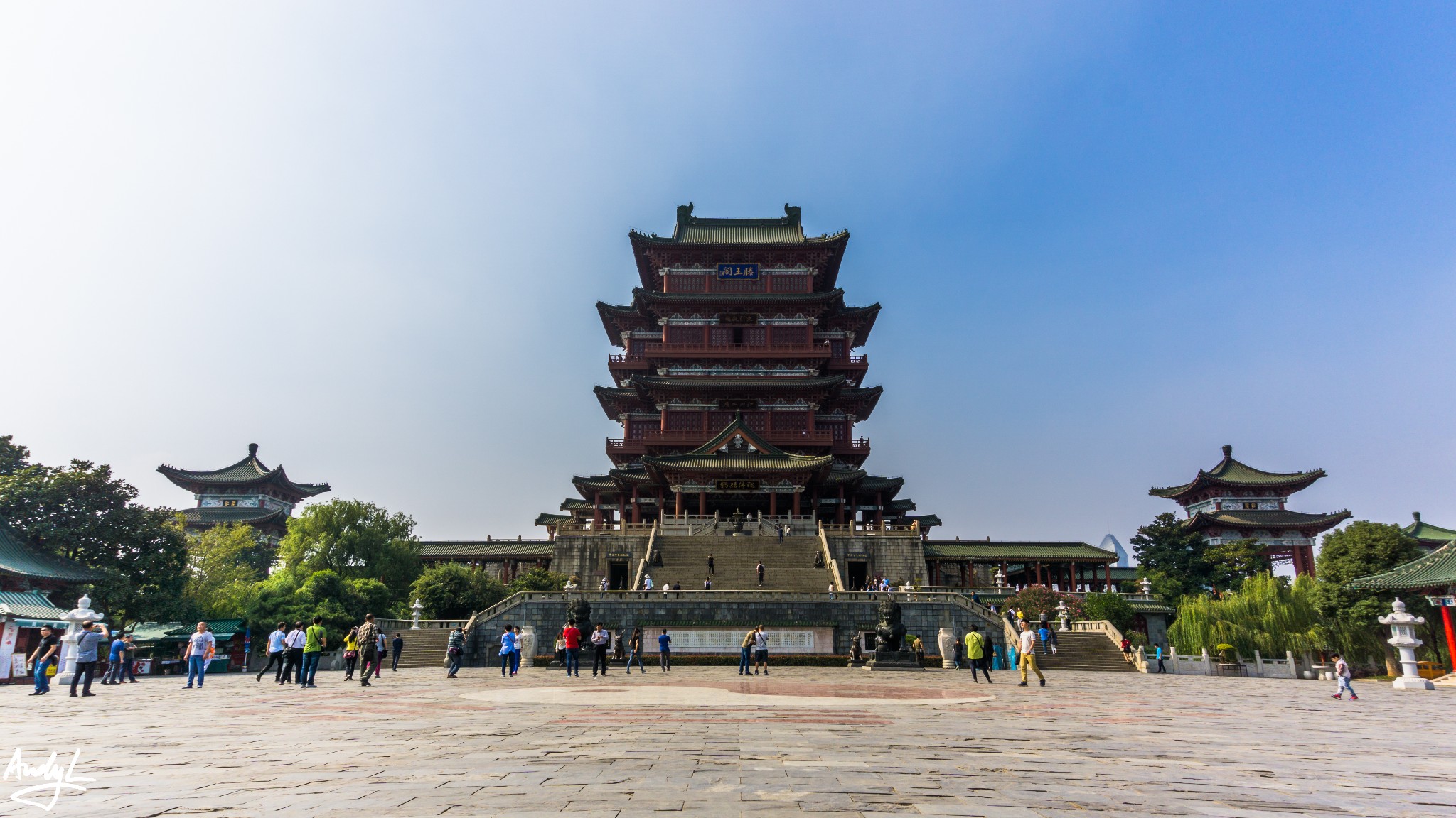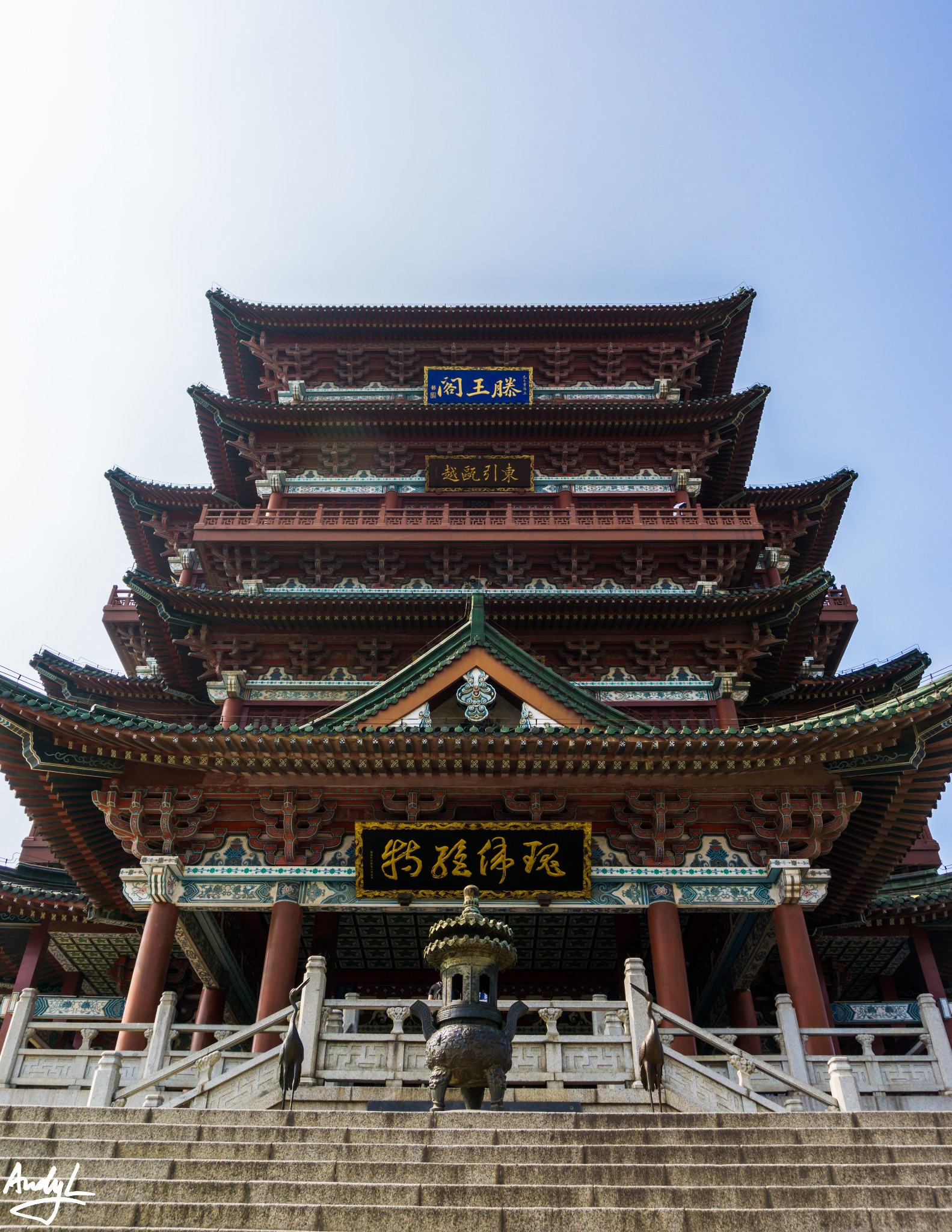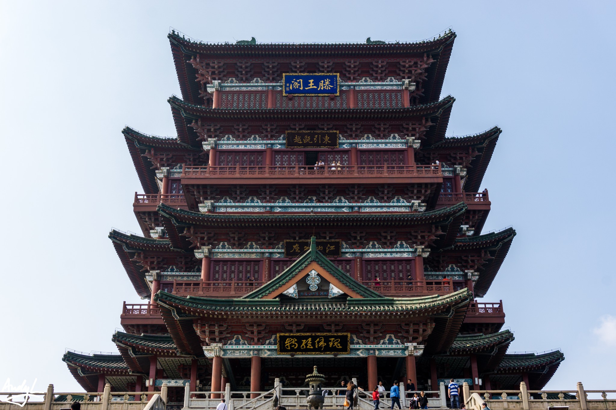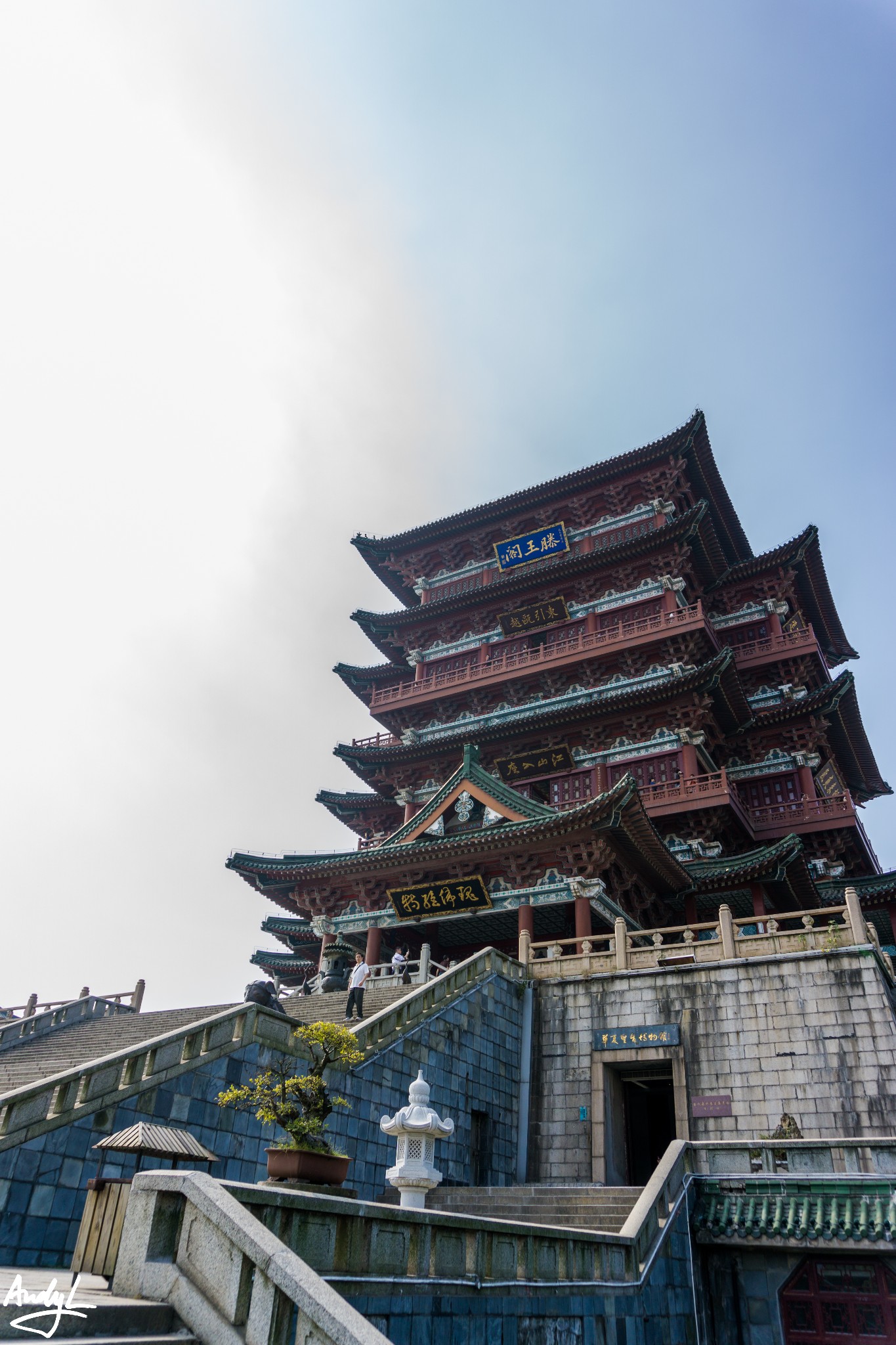 滕王阁可以说是三大名楼中最命运多舛的一座了,自唐代初建至今由于各种原因被毁重建多次,如今我们可以看到的滕王阁是1989年的完工的29次重建。个人认为也是最宏伟的一座。由于建成时间较晚,所以现在的滕王阁还是用到了很多水泥的材料,并非完全都是木制。