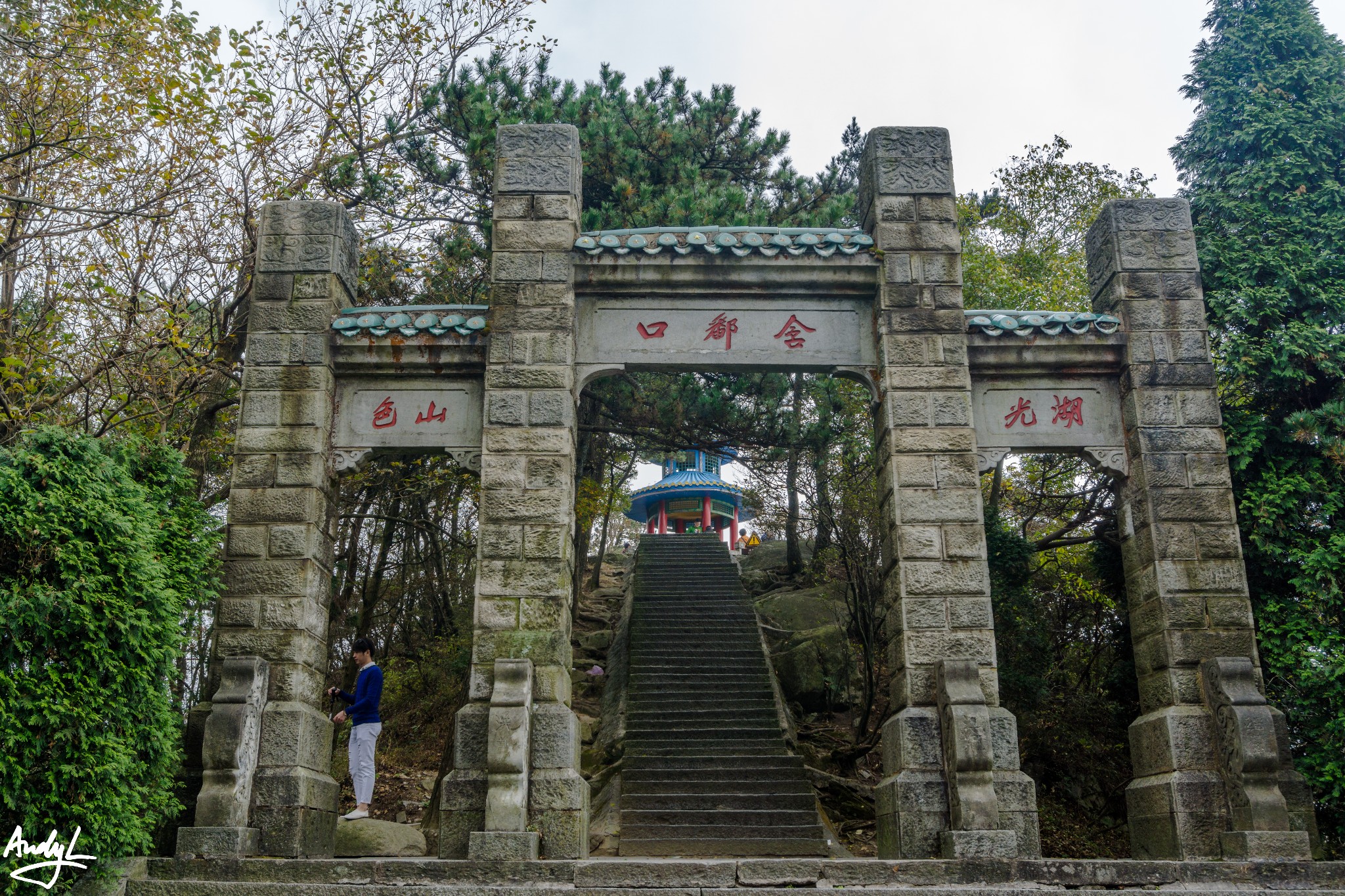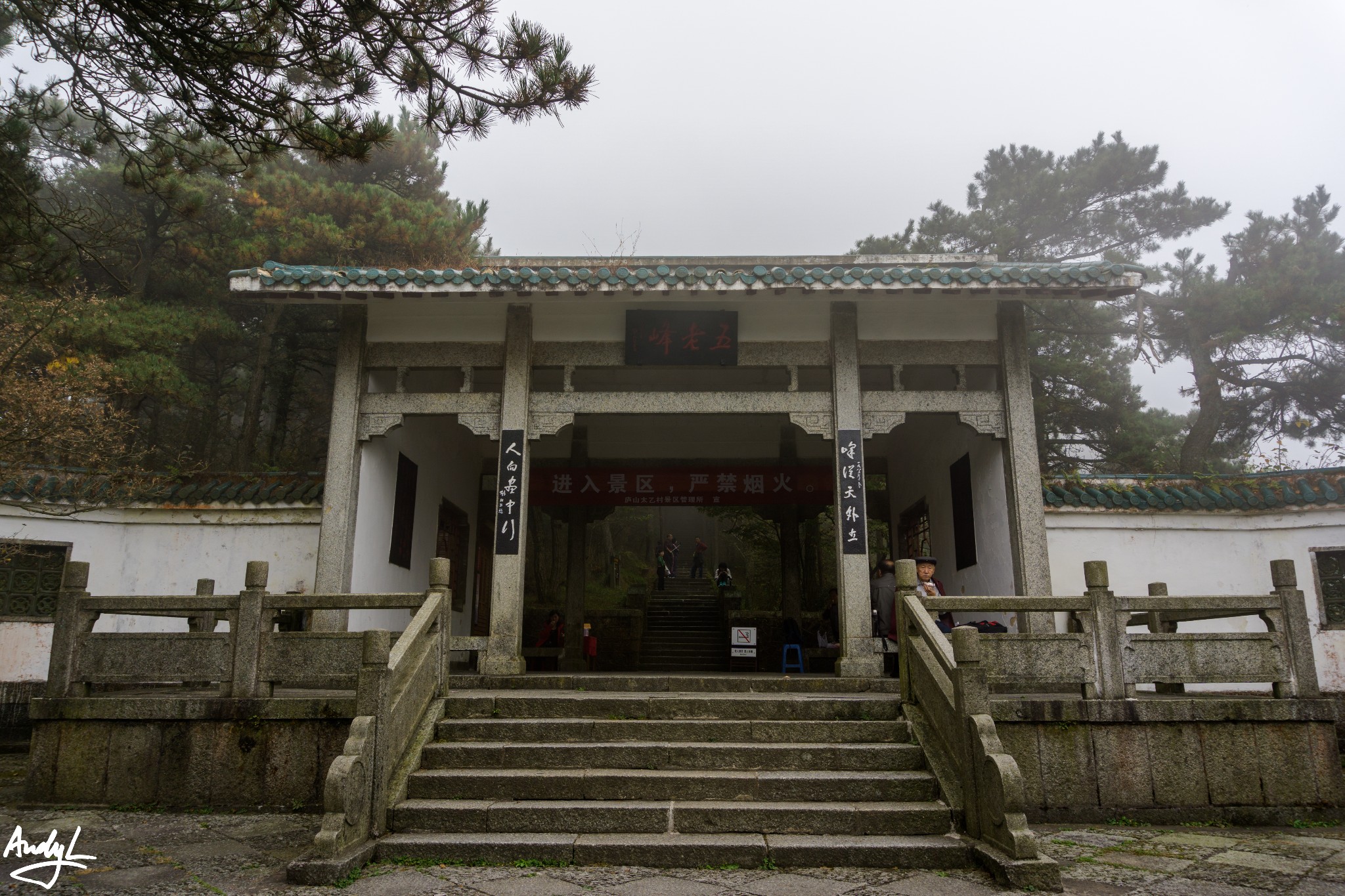 进了大门就是含鄱亭,可惜我们上山后又起了大雾,能见度很低,远处的鄱阳湖都被笼罩在云雾中,什么也看不到。走到望鄱亭,还是大雾笼罩,只能带着遗憾离开,前往五老峰。