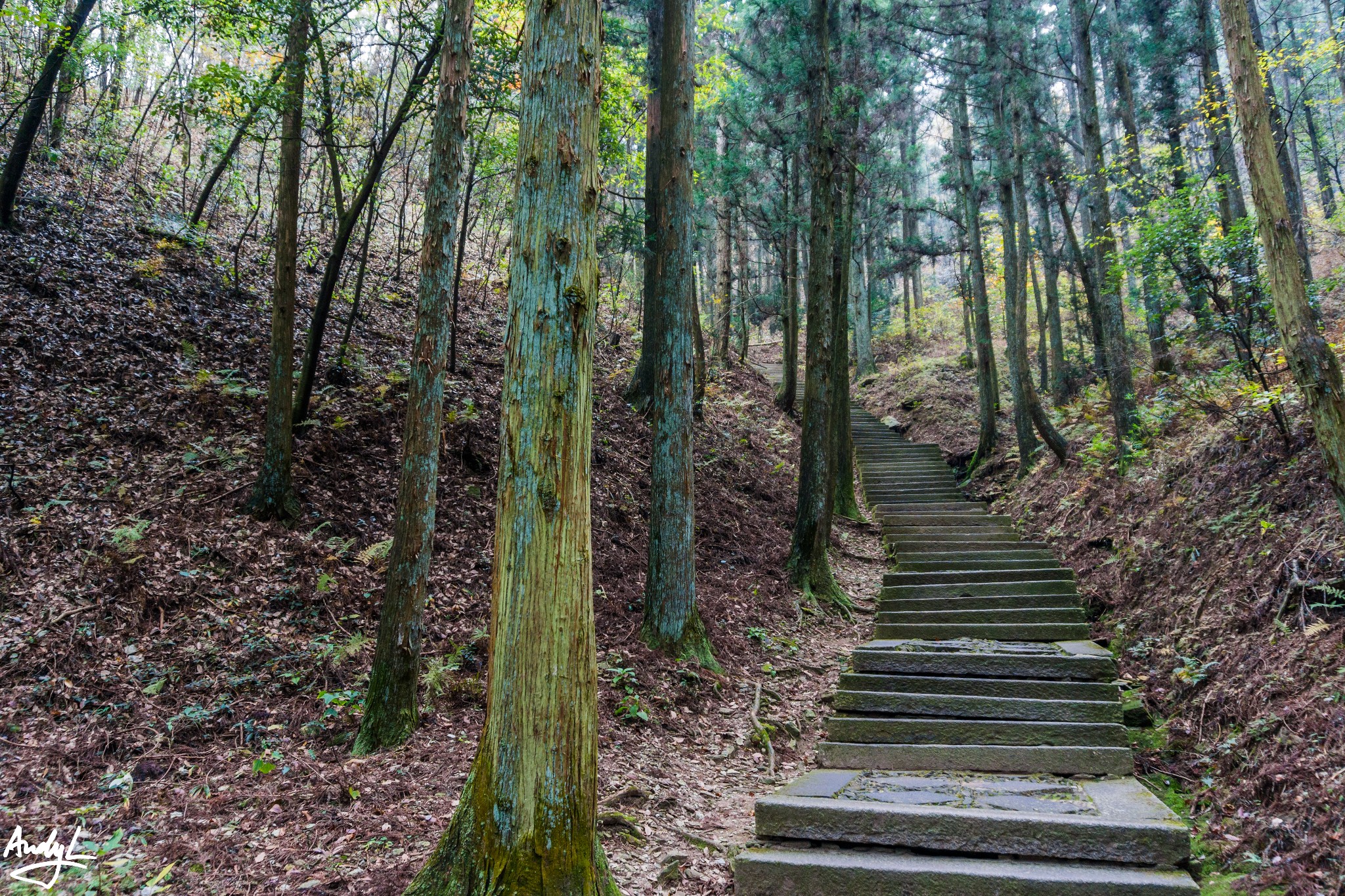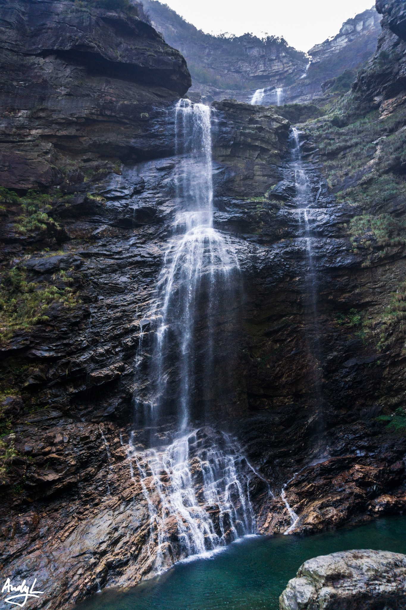 看到了三叠泉的台阶,我们发现五老峰一峰的台阶那真不算啥,不过我们在之前已经耗费了一些体力,所以还是有点累的。下台阶的一路上,我们都可以听到很大的水声,不用猜也知道那是三叠泉瀑布的水声,只是在路上一直看不到,直到我们来到泉底,才能看到瀑布的全貌。