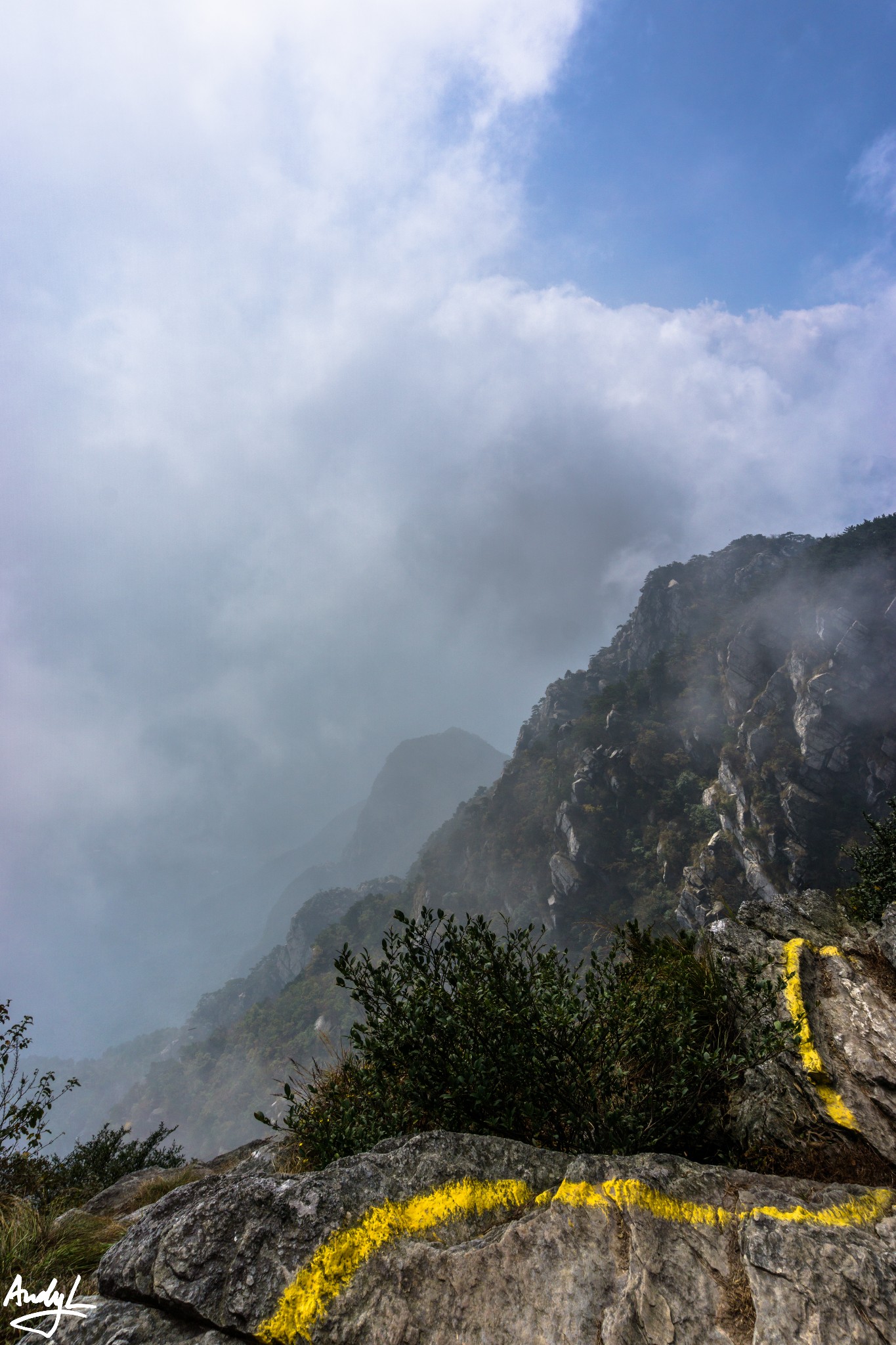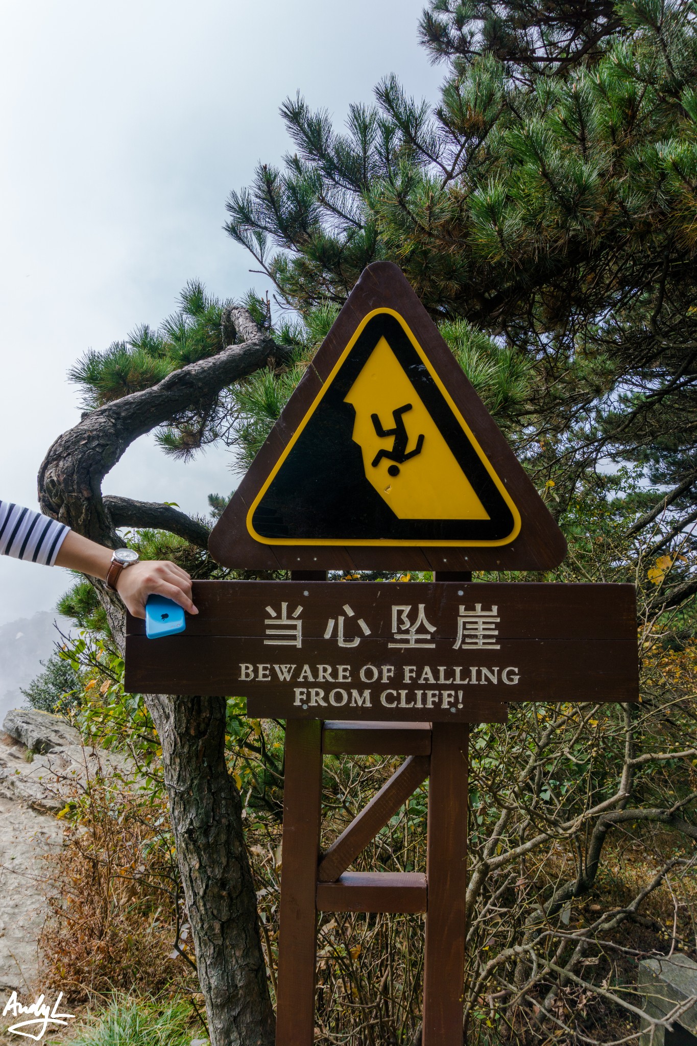 五老峰的各处都会有当心坠崖的指示牌,因为很多路段都是悬崖,一些标识黄线的地方建议不要随便跨过,因为黄线外就是万丈深渊。