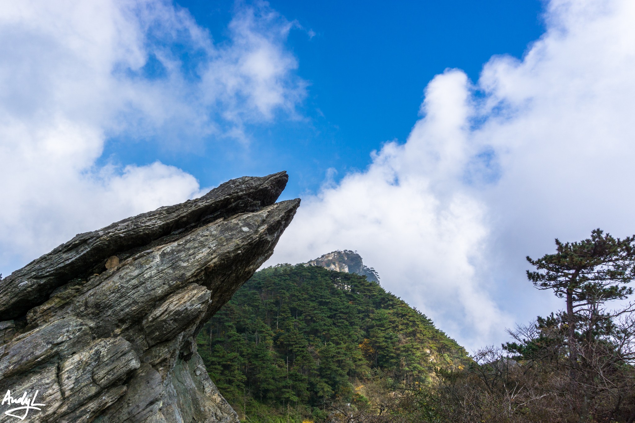 离开待晴亭,往前走,不远就能看到鹰嘴石,看到鹰嘴石,也就说明已经来到了二峰(鹰嘴石指向的方向)。前往二峰的路没有像样的台阶,所以如果要前往的话,最好有一双防滑性能比较好的户外鞋。