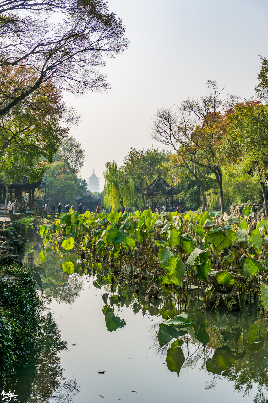 拙政园的设计中也运用了许多“借景”的手法,像下图中借用远处报恩寺塔的景观,最为著名。若是夏天,荷花盛开时,更为美丽。