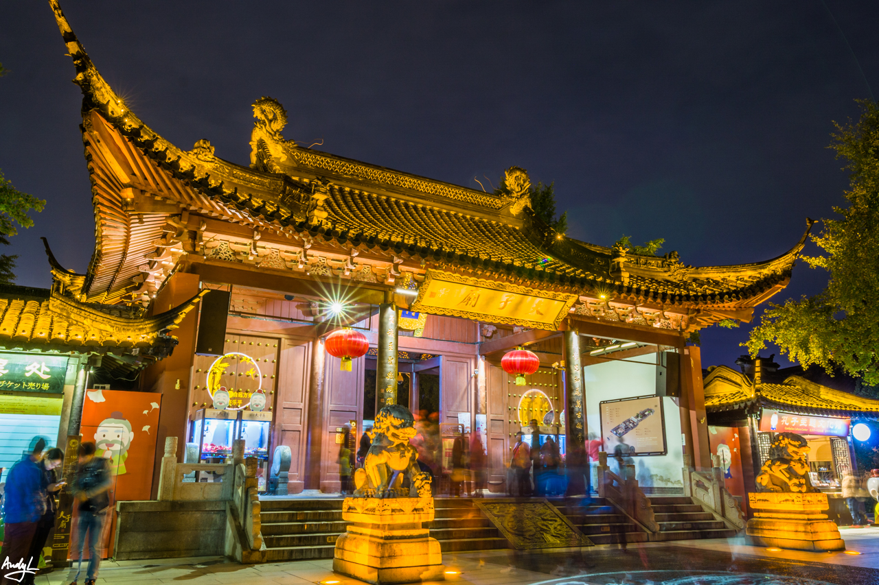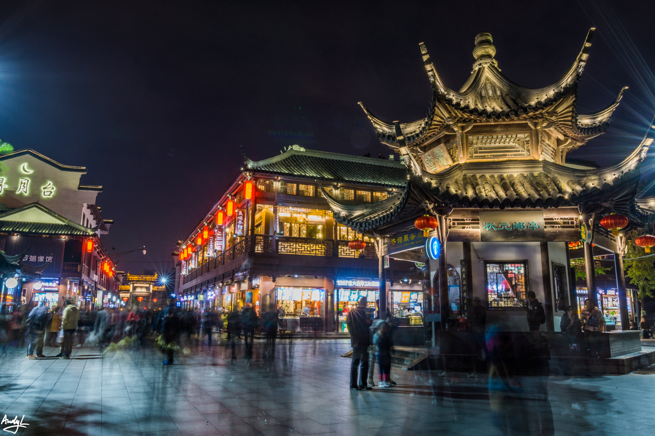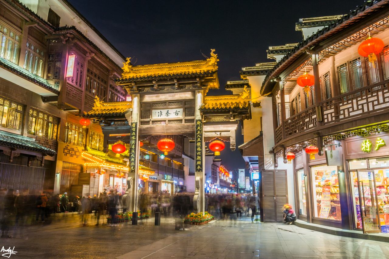 要说南京的夜景,还要算是夫子庙秦淮河风光带最好(我这也是蚂蜂窝上临时抱佛脚看来的)。首先来到的是中华门瓮城,从外面看看比较一般,便没花钱进去看。于是开始误打误撞地乱走,突然发现周遭古色古香的建筑多了起来。(长曝光消灭街上所有游客)