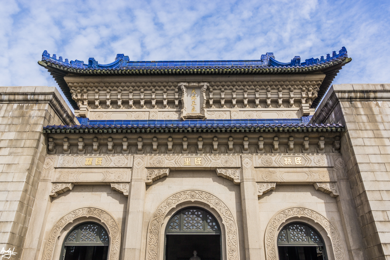 爬上台阶,到达第十个平台,眼前就是孙中山先生的祭堂。在中门上嵌总理手书“天地正气”四个鎏金大字,门楣上分刻“民族”、“民生”、“民权”字样,是当时孙中山倡导的三民主义革命纲领。