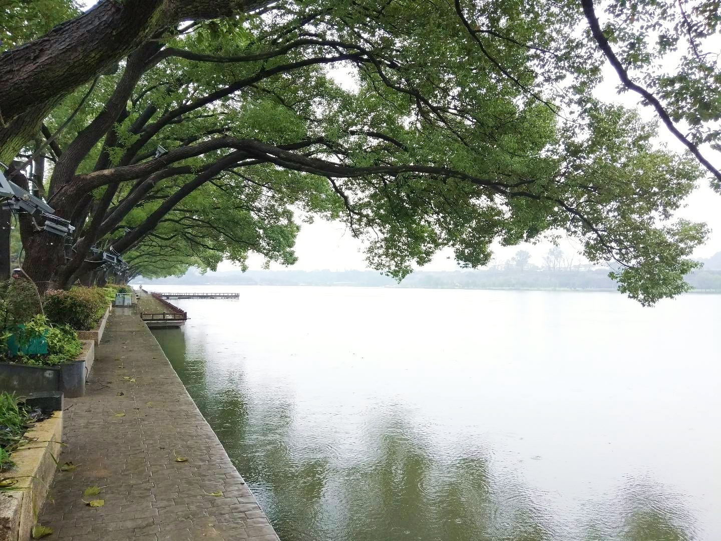 雨天,公园内人少得可怜,游船生意更是惨淡。湖面比我想象当中的开阔许多。