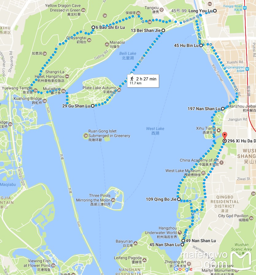 整个行程在下午由断桥开始,沿白堤至孤山,在岳庙西门处上栖霞岭,登葛岭保俶塔,下山后新白鹿解决晚饭,饭后沿西湖至长桥公园,最后走南山路到西湖大道。