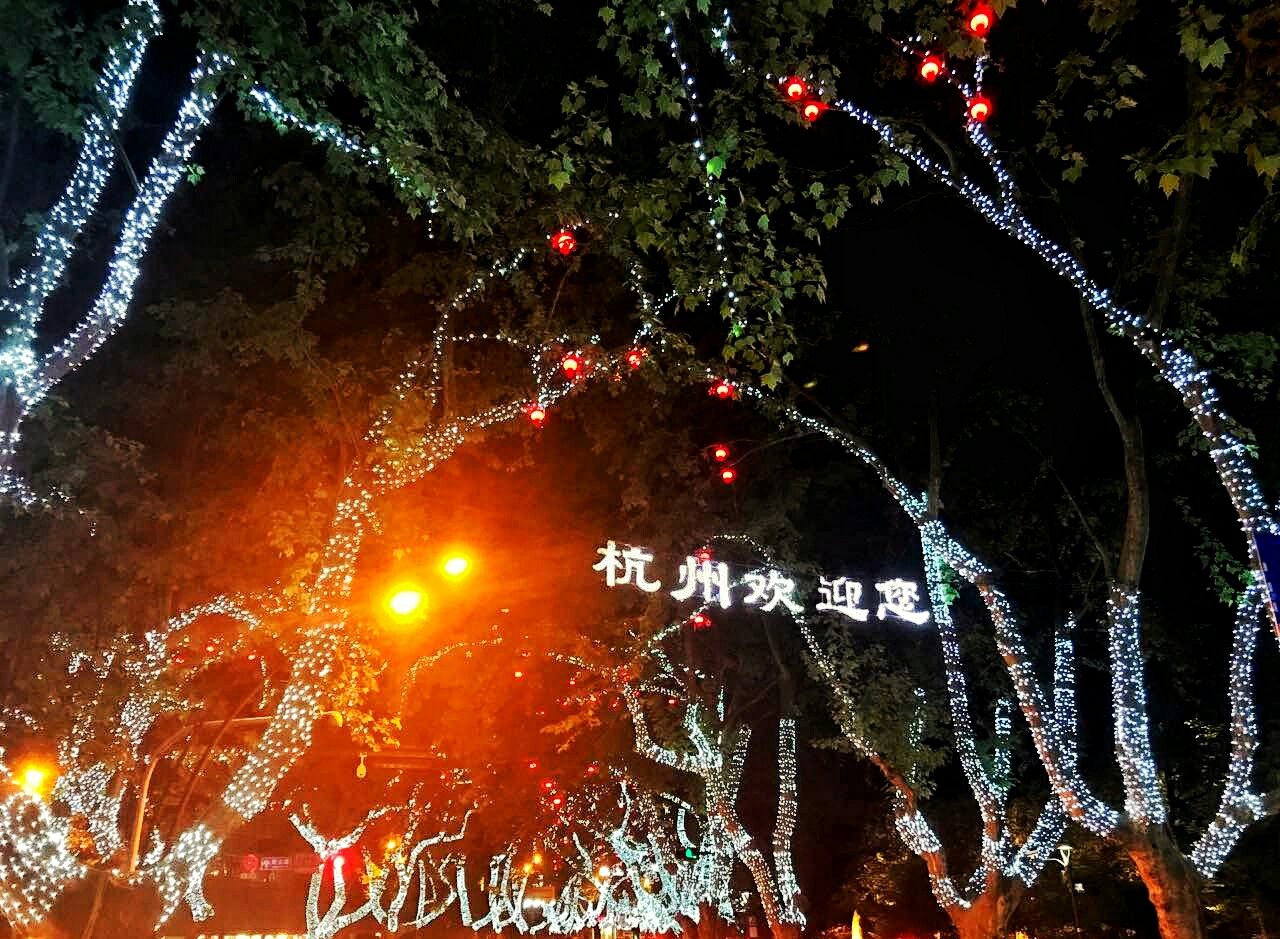 拍着拍着,突然发现雷峰塔周围的景观灯突然都灭了,一看时间已经晚上10点多了,是该回去了。打开百度地图查了一下公交,附近的公交基本都停运了。可以坐的最近的公交站在吴山广场附近。想想算了还是骑共享单车吧,可是路边一辆空的都没有,好不容易看到马路对面有两辆,可是刚想过马路就被人骑走了。。。好吧,那就沿着南山路走吧。一路树上挂满了彩灯,看来杭州为了G20也是蛮拼的。