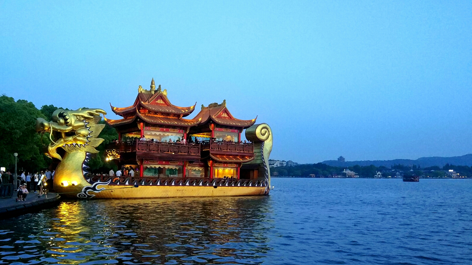 沿着西湖岸边向南走,天色一会儿就暗下来了。这艘龙船,可谓是西湖上最霸气的船了,估计船票不便宜。