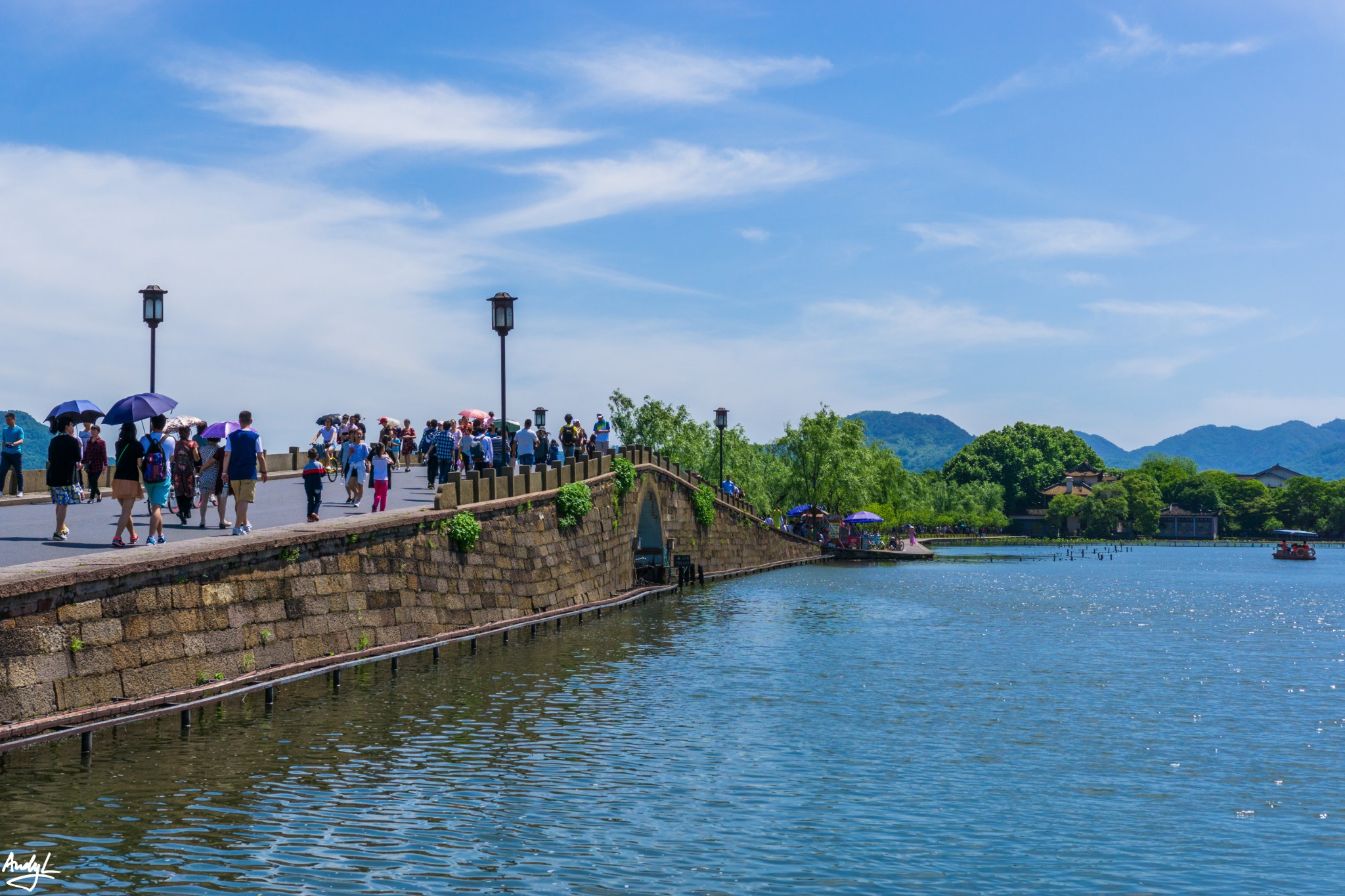 白堤两岸垂柳成排,一直延伸到平湖秋月为止,堤岸南边的外湖“波涛汹涌”,而北边的里湖却异常平静。堤上一座锦带桥,样式与断桥相似,难怪有些游客远远地将它认成断桥。