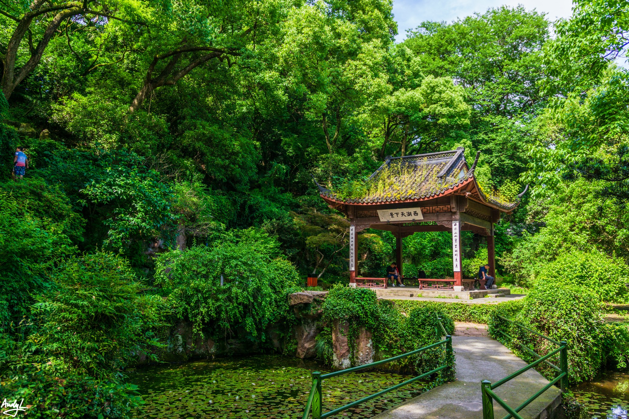 虽然当初行宫的建筑大部分已经不在了,但是整个园子的结构还在,小桥池塘亭子假山一应俱全。西湖天下景亭便藏于其中,其柱子上的叠字对联相当著名——山山水水处处明明秀秀,晴晴雨雨时时好好奇奇,巧妙概括了西湖的美景。