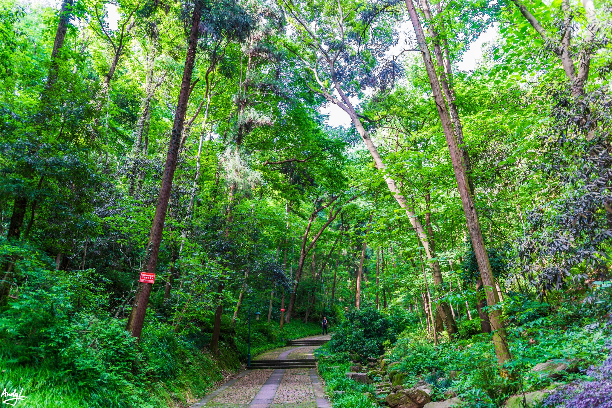 在栖霞岭,步道两边都是参天大树,相当幽静。因为绿树成荫,这里的温度至少比西湖边低了5度左右,如同开了空调,相当清凉。