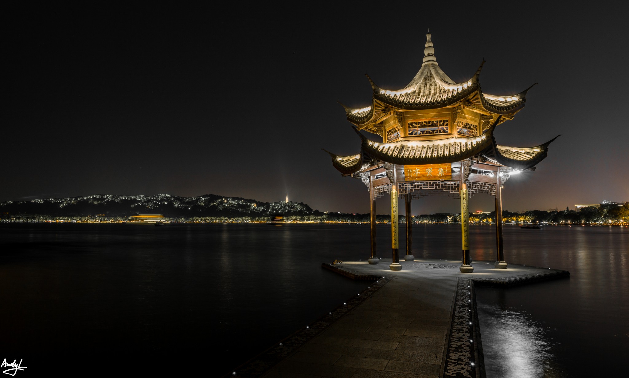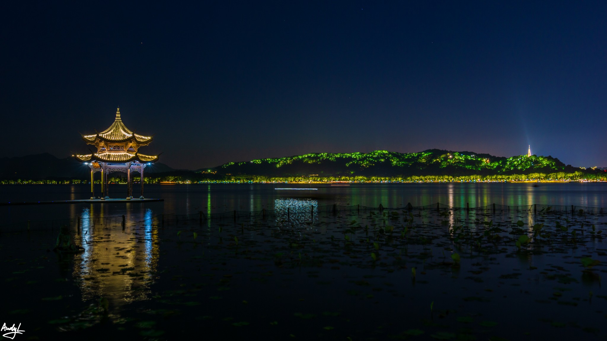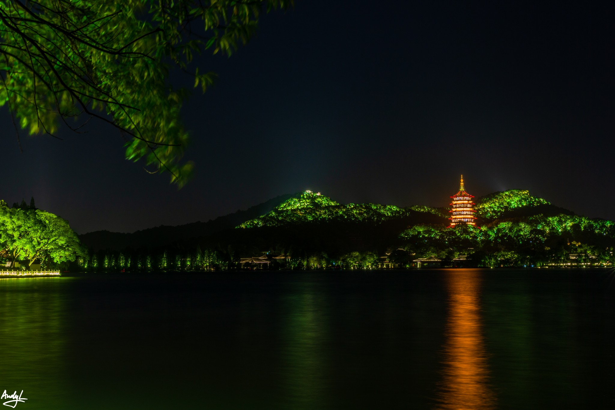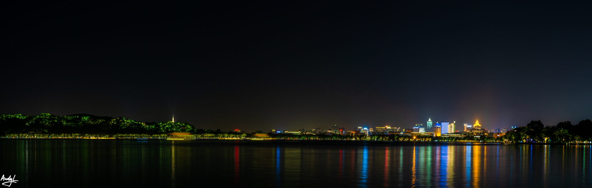 杭州的夜景,特别是西湖附近的夜景,与上海的夜景有很大区别。西湖附近没有太多高楼,环湖的群山上的灯光连绵不断,比起上海的钢筋水泥,更有味道。上图是拍摄于钱王祠码头附近,城市通明的灯火一直延伸到宝石山上。