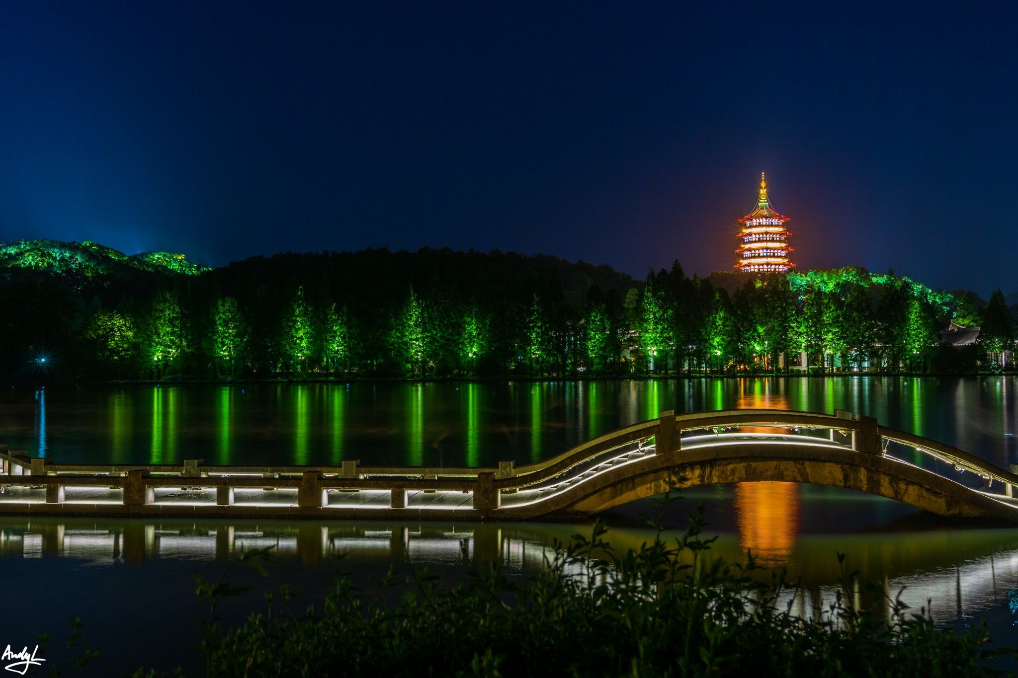 之前没有赶上宝石流霞,现在自然也拍不到雷峰夕照了,长桥公园附近的雷峰塔夜景也不错。特别是塔周围的树林也被打上景观灯,煞是好看。