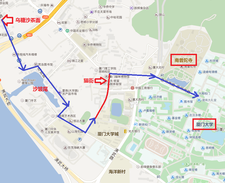 猫街有个猫咪博物馆,不过因为大雨和行程的关系,我们没有去。猫街实在比想象当中要小太多,具体位置见下图。个人建议不用为了它专程去一次,如果有时间的话可以按照我们的行程线路来游玩,这样可以串联起厦门本岛南部的一些主要景点(乌糖沙茶面-沙坡尾-顶澳仔猫街-南普陀寺-厦门大学,建议上午出发,因为乌糖只有上午营业)。