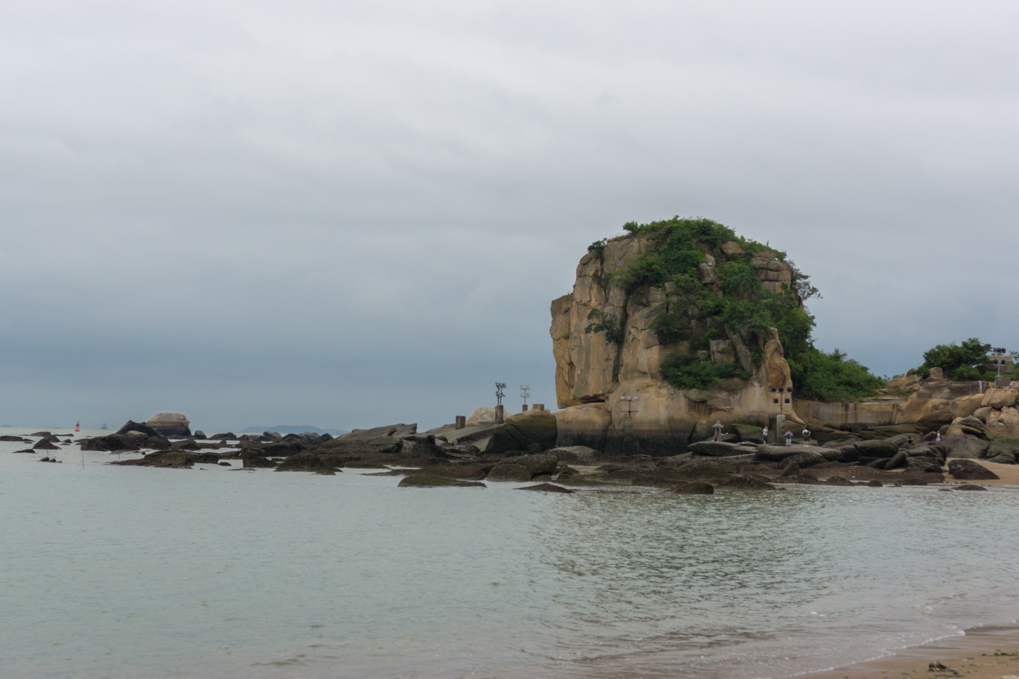 印斗石是岛东南部一块巨大的岩石,潮落时,可以沿沙滩前往,但是涨潮后这段路会被淹没,从岩石下方的黑色部分,可以看出涨潮时的最高水位