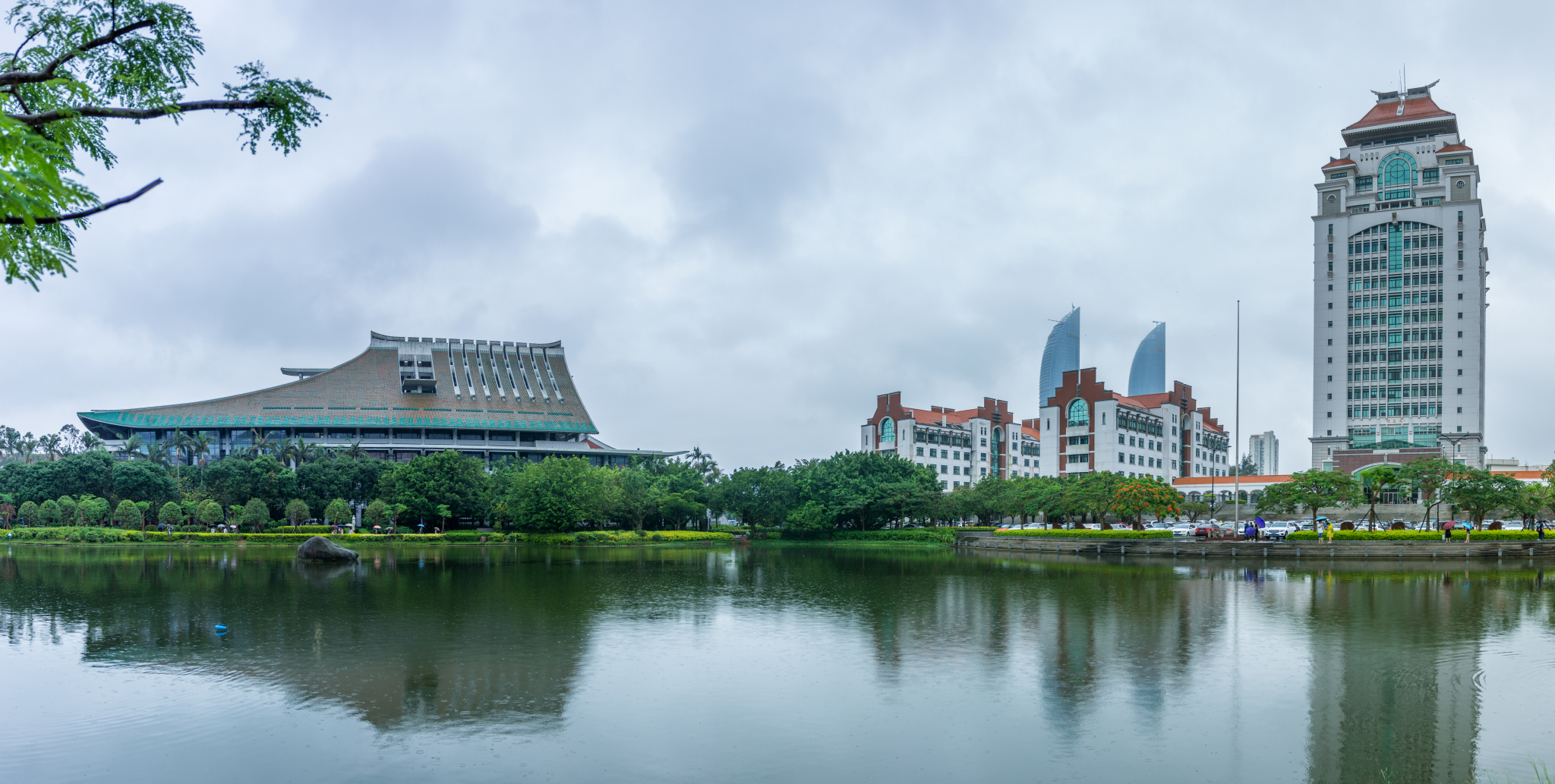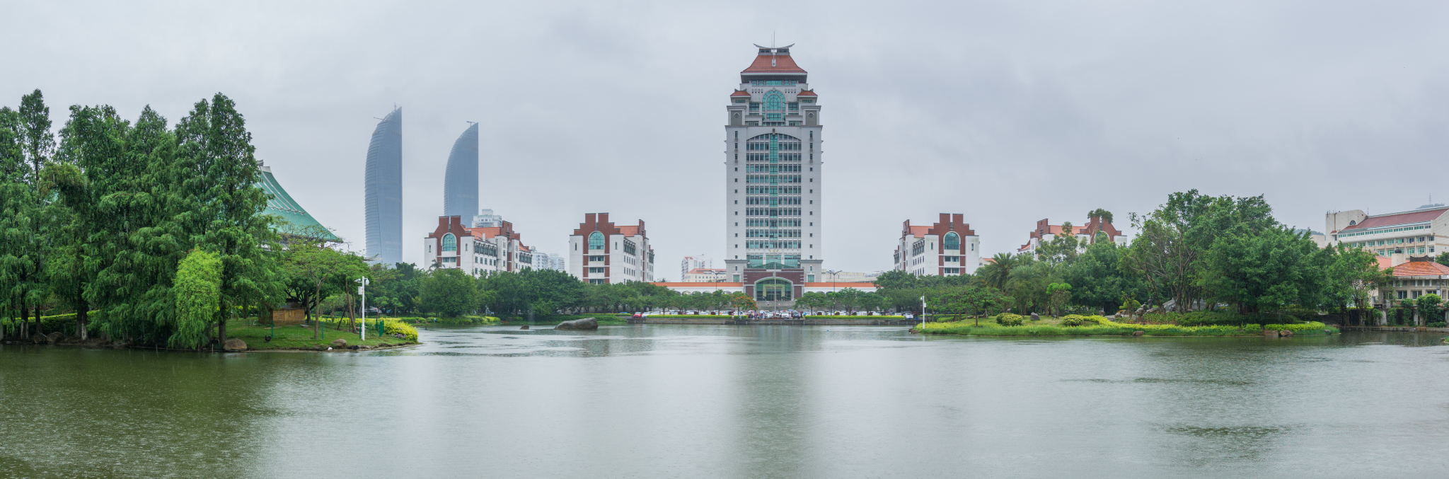 芙蓉湖地处厦大的中心,周围围绕着厦大的主要建筑。最著名的就是远处的嘉庚楼群,其中又以高达21层的颂恩楼为主,21层为纪念厦大1921年的诞生,此楼为厦大校友捐资建造,现为厦门大学的行政楼。