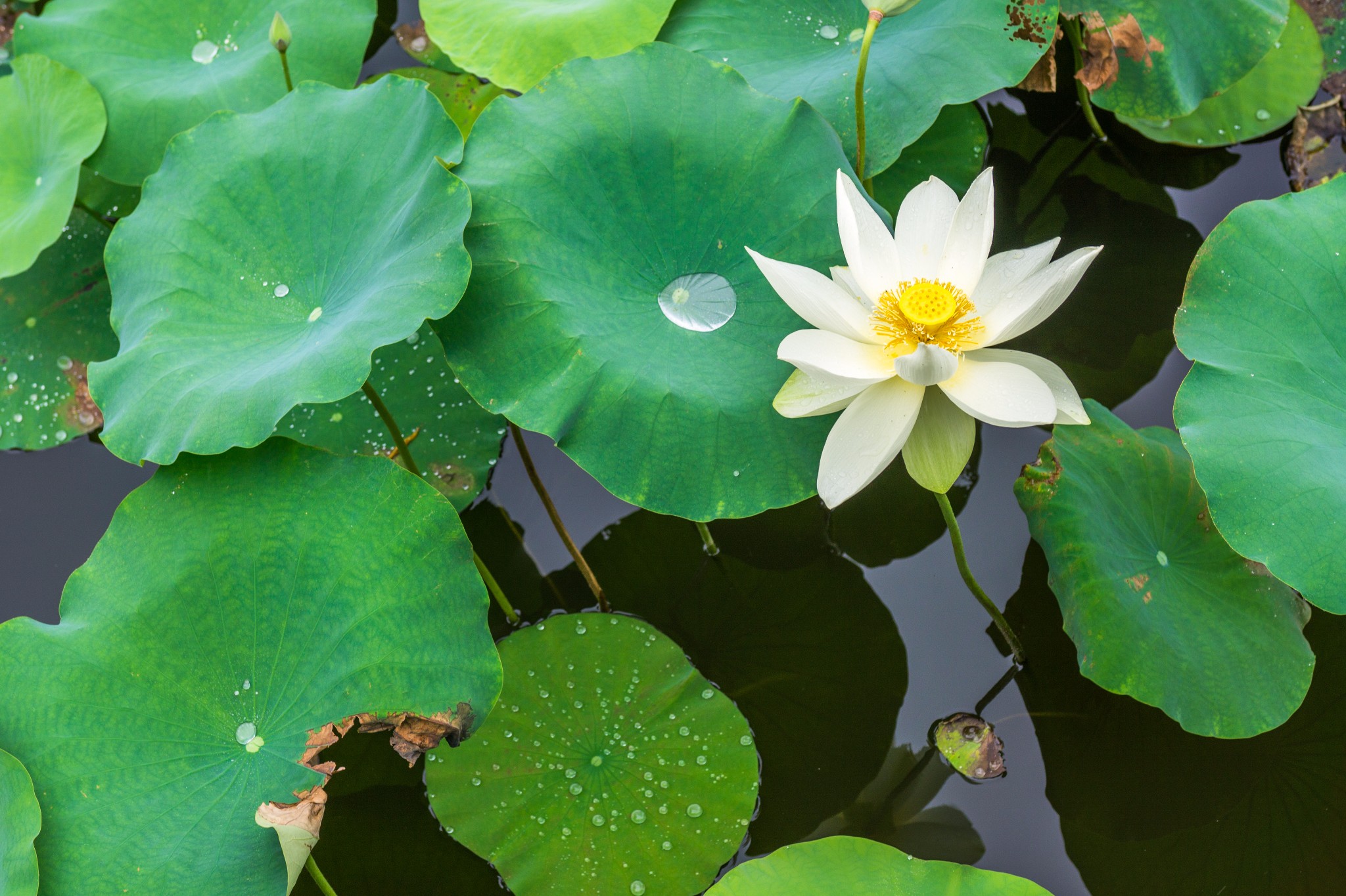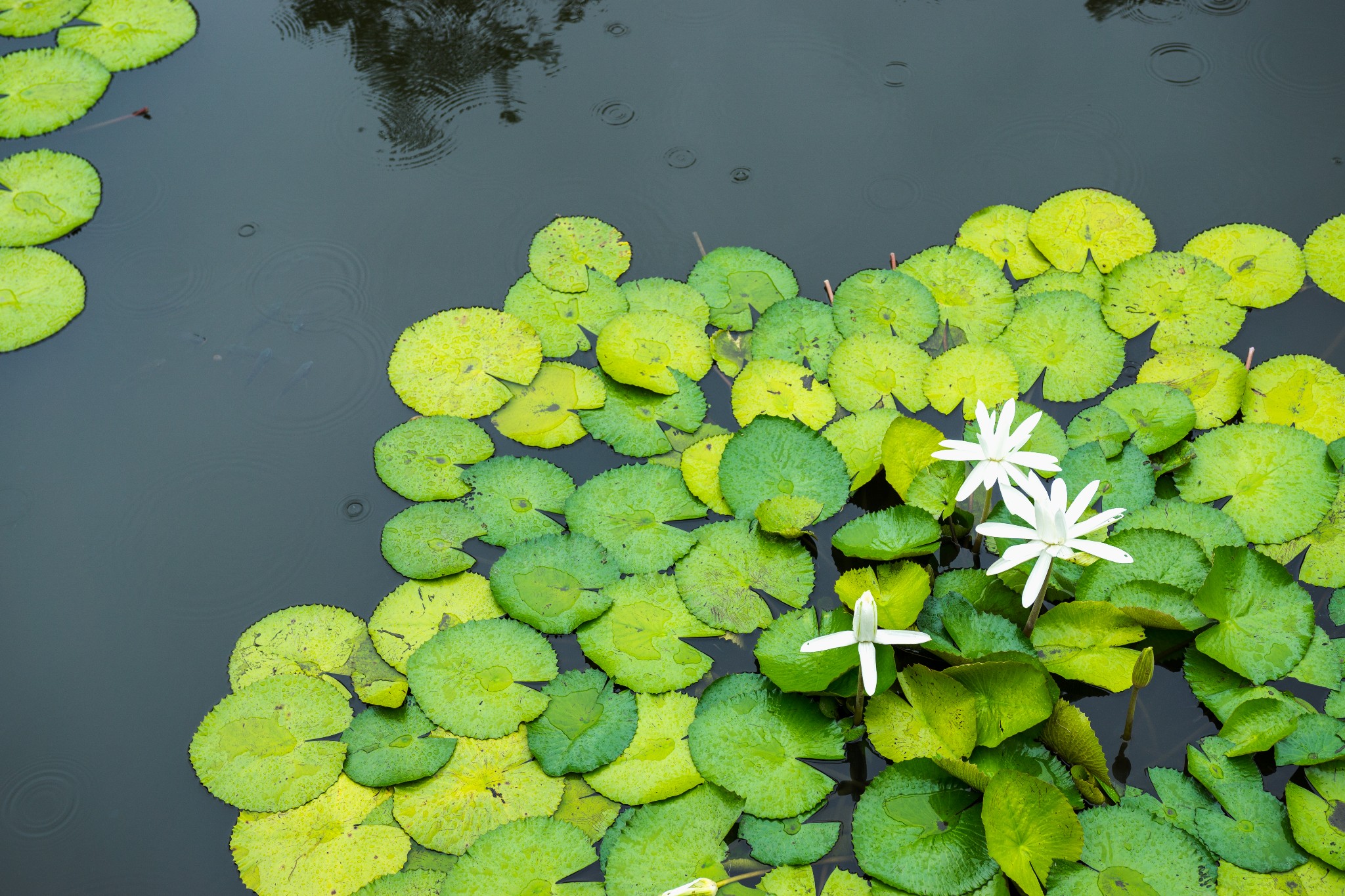 荷花池两边还各有莲花池,花才刚刚开放,雨水滴在池中溅起涟漪。