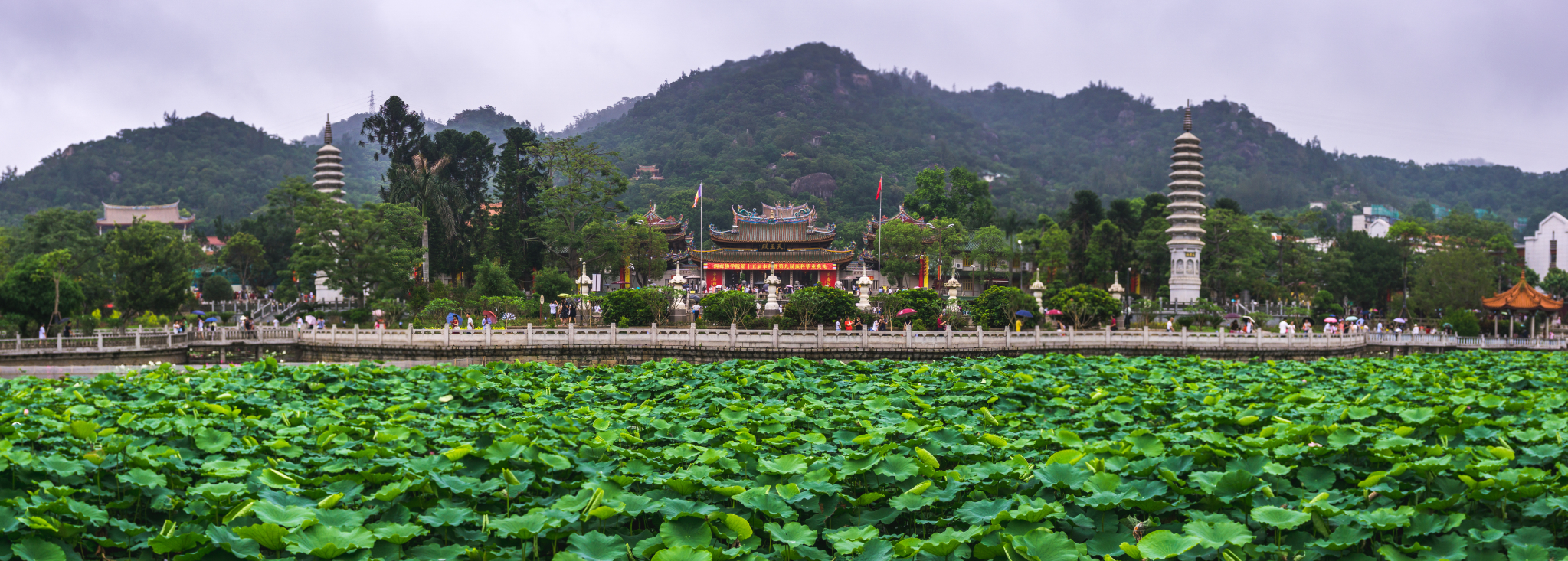 寺门前有一个巨大的花园,里面有荷花池与放生池。由于已到6月,荷叶正茂盛,不过花还未全开。站在荷花池前,可以一览南普陀寺的全貌。