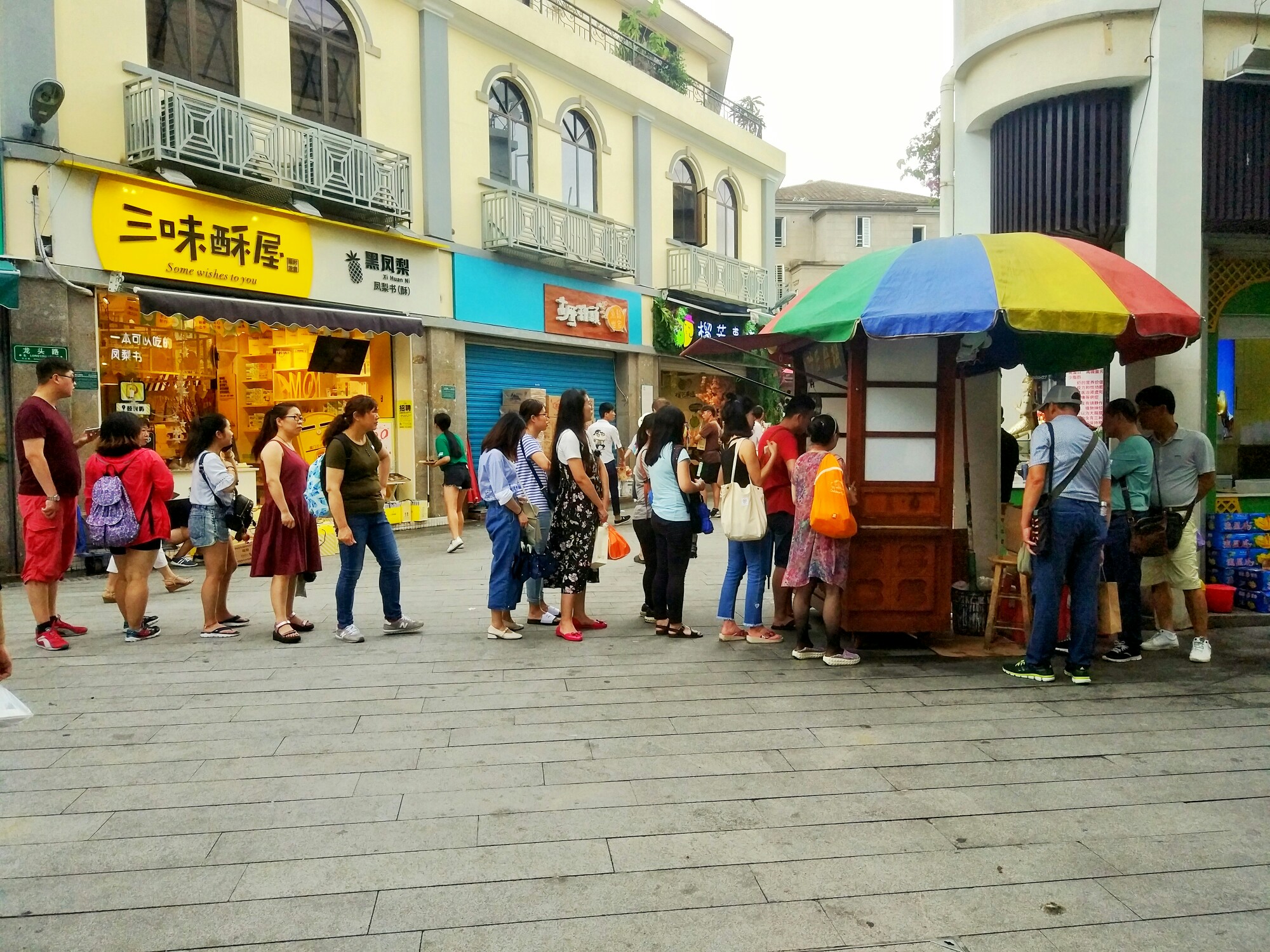 鼓浪屿有名的小吃店很多,排队的也不少,但是叶氏麻糍绝对是其中之一。长长的队伍,延伸有十几米。由于老师傅是现场制作,所以出货较慢,当然他的身后也有不少人围观制作过程。